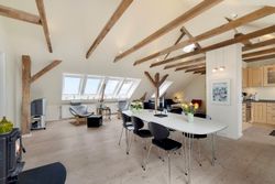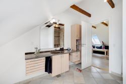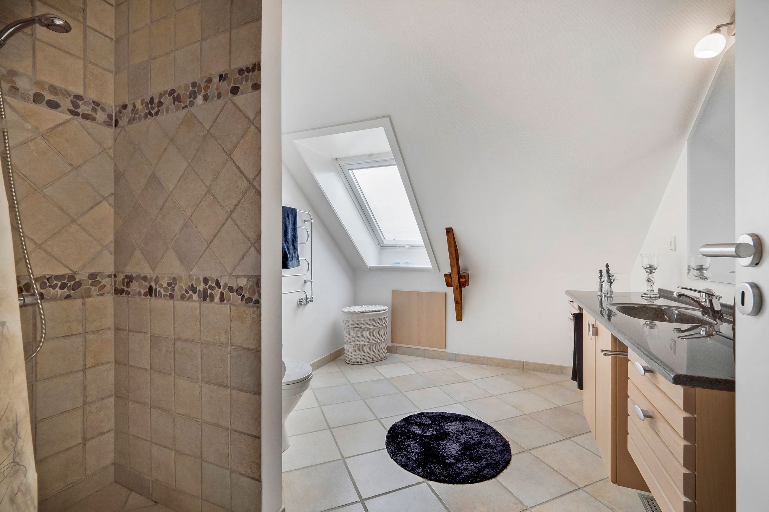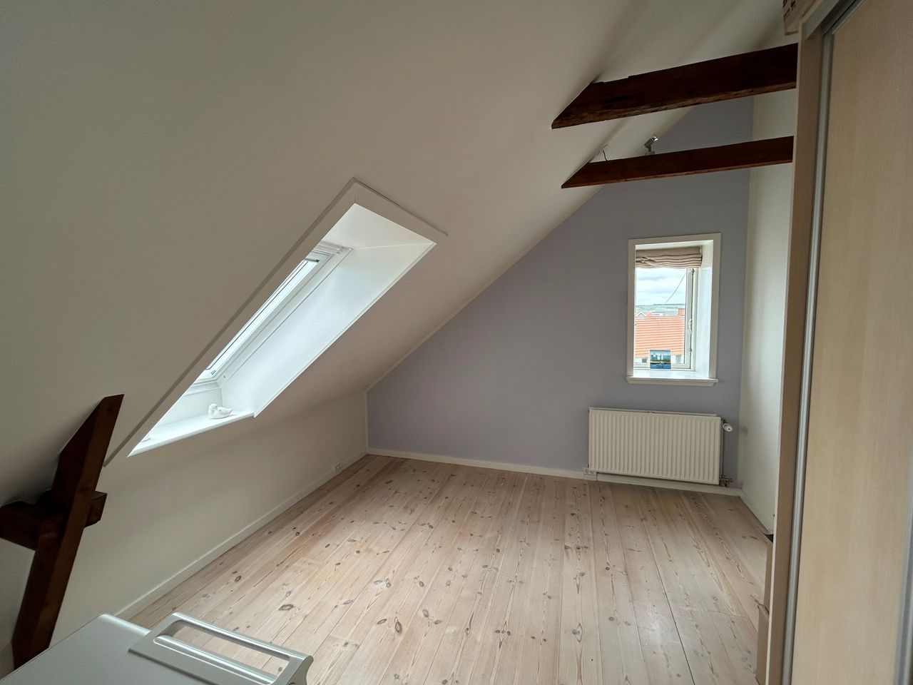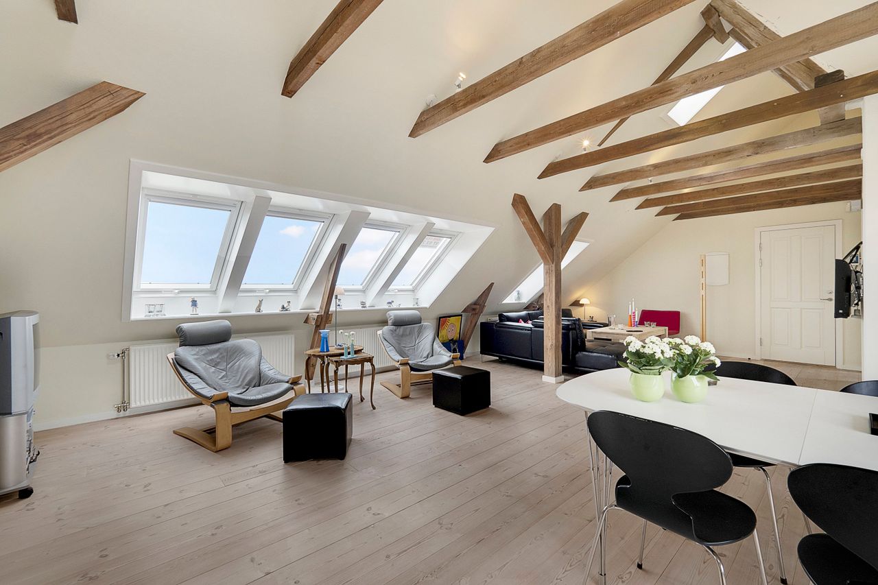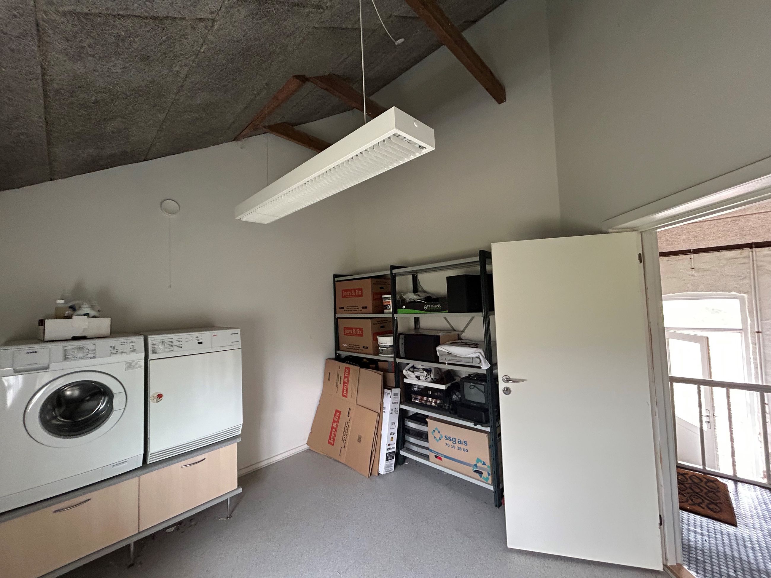 Her får I en bolig med karakter, atmosfære og høj komfort – blandt andet takket være de fritstående bjælker, de smukke trægulve og det generøse lysindfald fra flere ovenlysvinduer. Loft til kip skaber en behagelig rumfornemmelse, og stuen byder på flere hyggelige zoner – hvad enten det er sofahjørnet, hyggekrogen under ovenlyset eller det store spisebord, der samler jer.