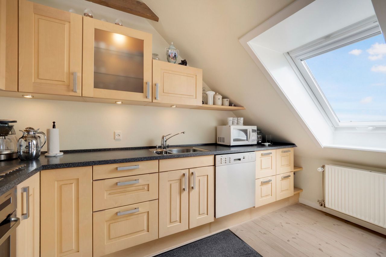 Køkkenet ligger i delvis åben forbindelse med stuen og er indrettet med moderne hvidevarer og god skabsplads. Badeværelset fremstår pænt og velholdt – og selv herfra er der udsigt. Lejligheden rummer desuden to værelser, hvoraf det ene har udgang til fransk altan.