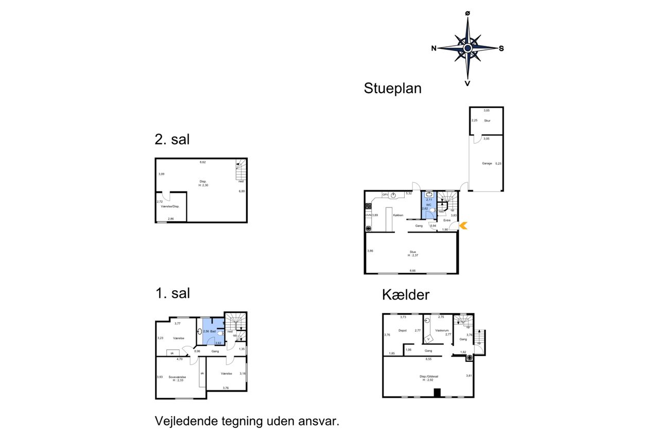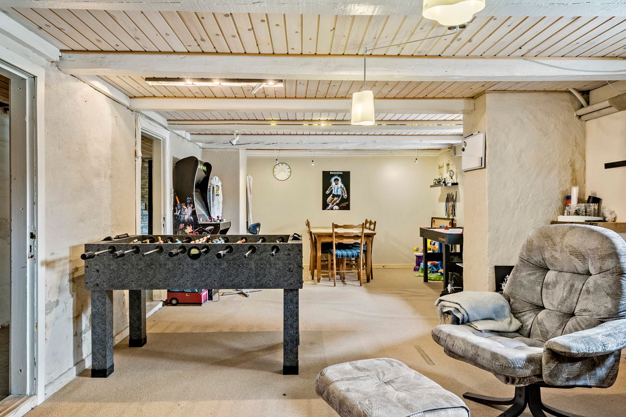 1. sal fungerer som soveafsnit med 3 rummelige værelser samt et pænt moderniseret badeværelse, mens den både hyggelige og praktiske kælder tilbyder store disponible rum samt vaskerum. Det største disponible rum fungerer som en ekstra stue/gildesal, hvor der er gode muligheder for aktiviteter og sammenkomster. Herudover har boligen ekstraordinært en uudnyttet 2. sal med flere anvendelsesmuligheder efter behov.