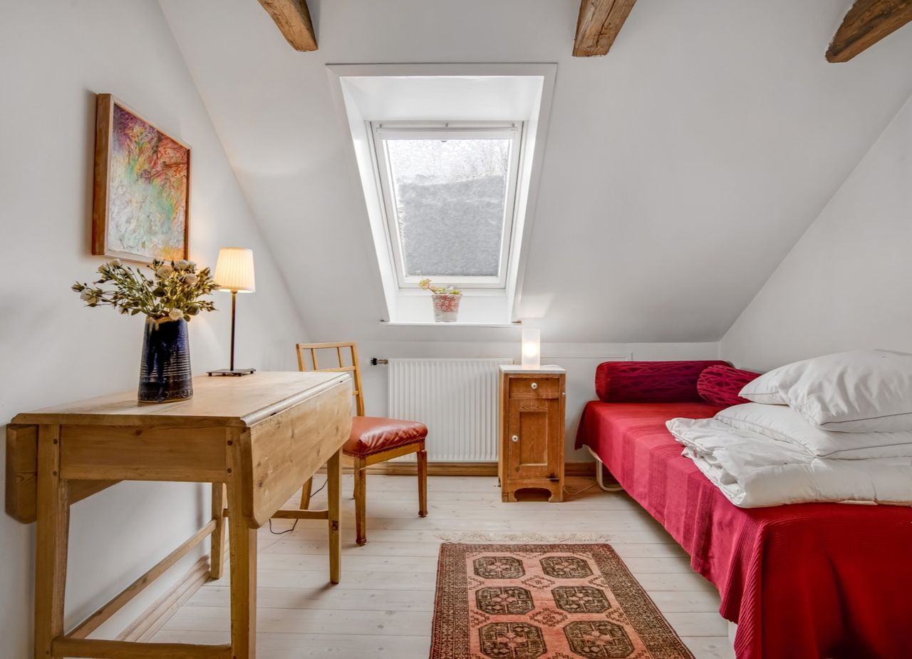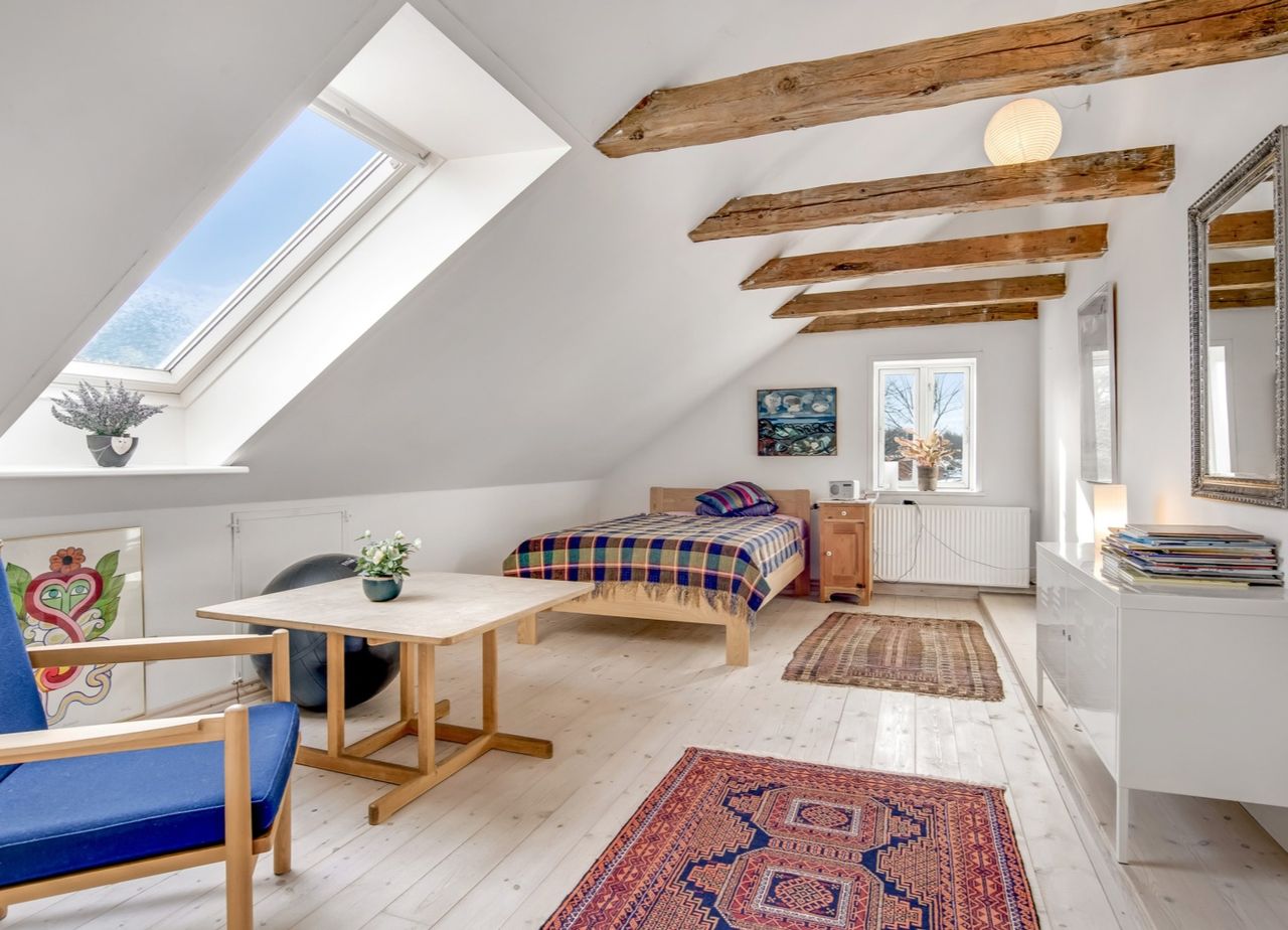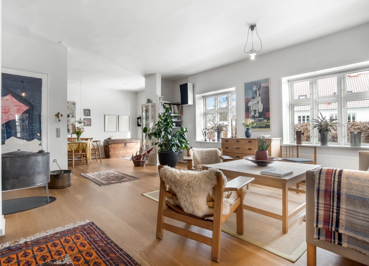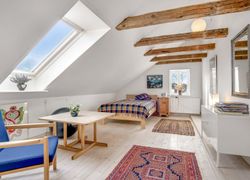 f.eks. det gamle klinkegulv delvis bevaret og højden til loftet er kreativt udnyttet. Her er masser af