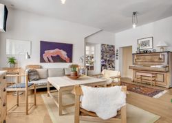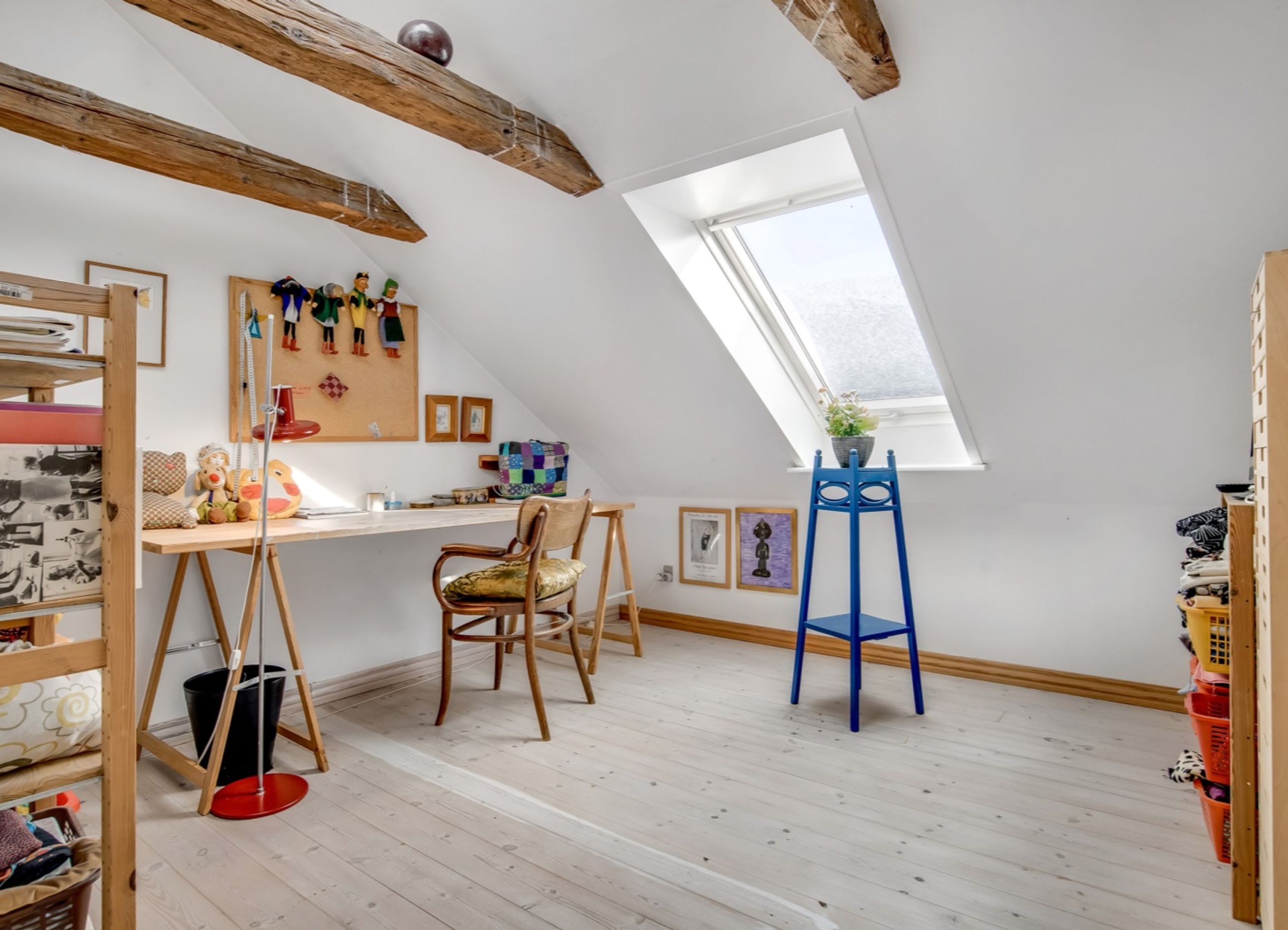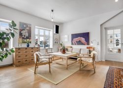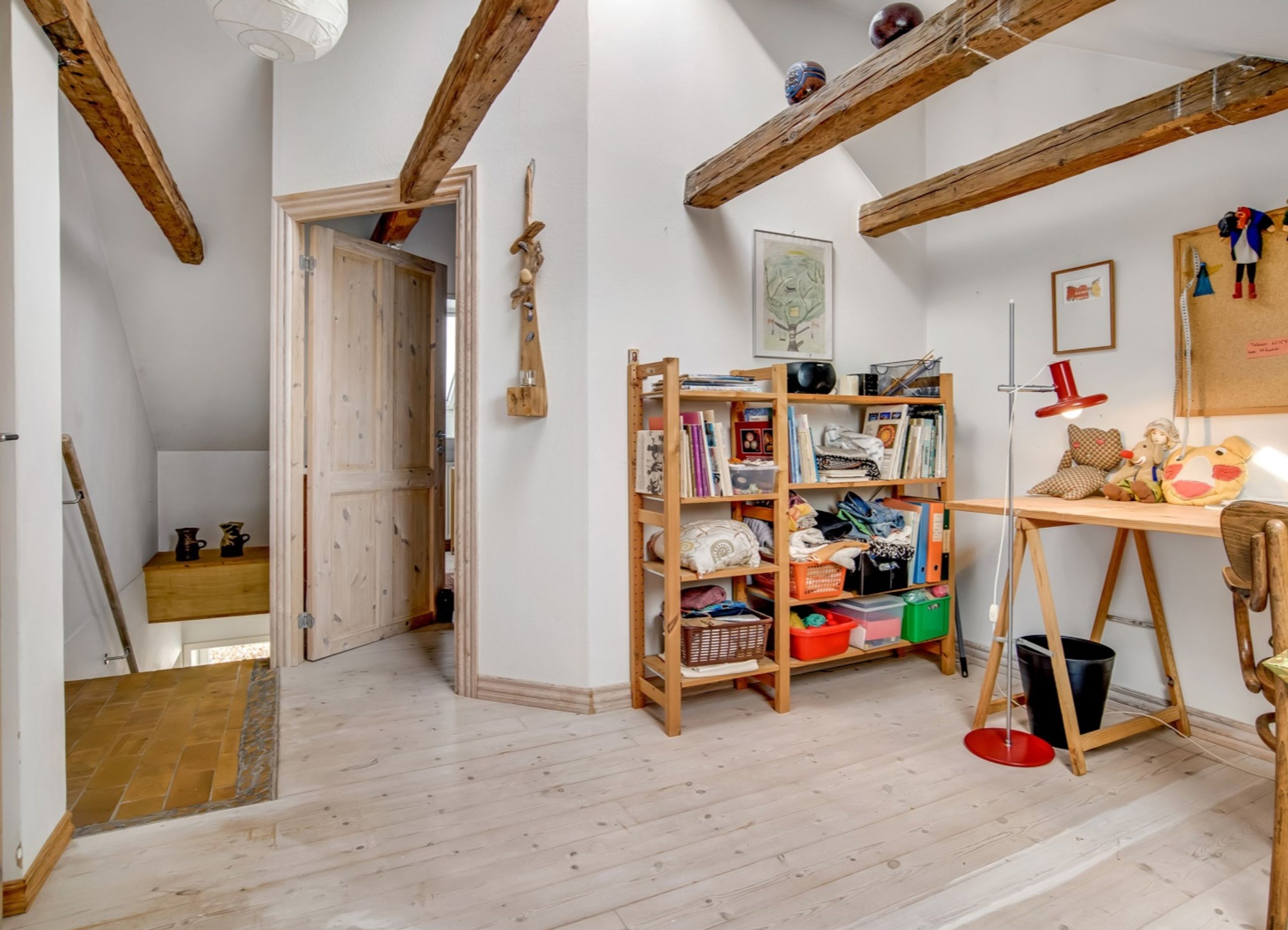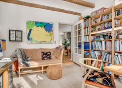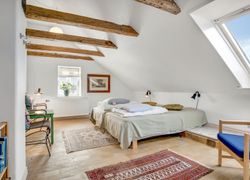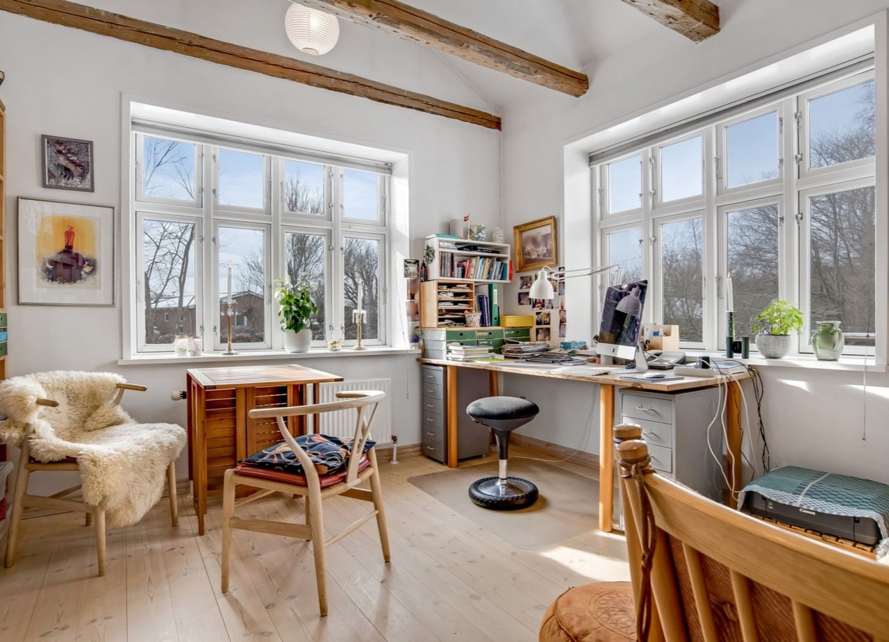 f.eks. det gamle klinkegulv delvis bevaret og højden til loftet er kreativt udnyttet. Her er masser af