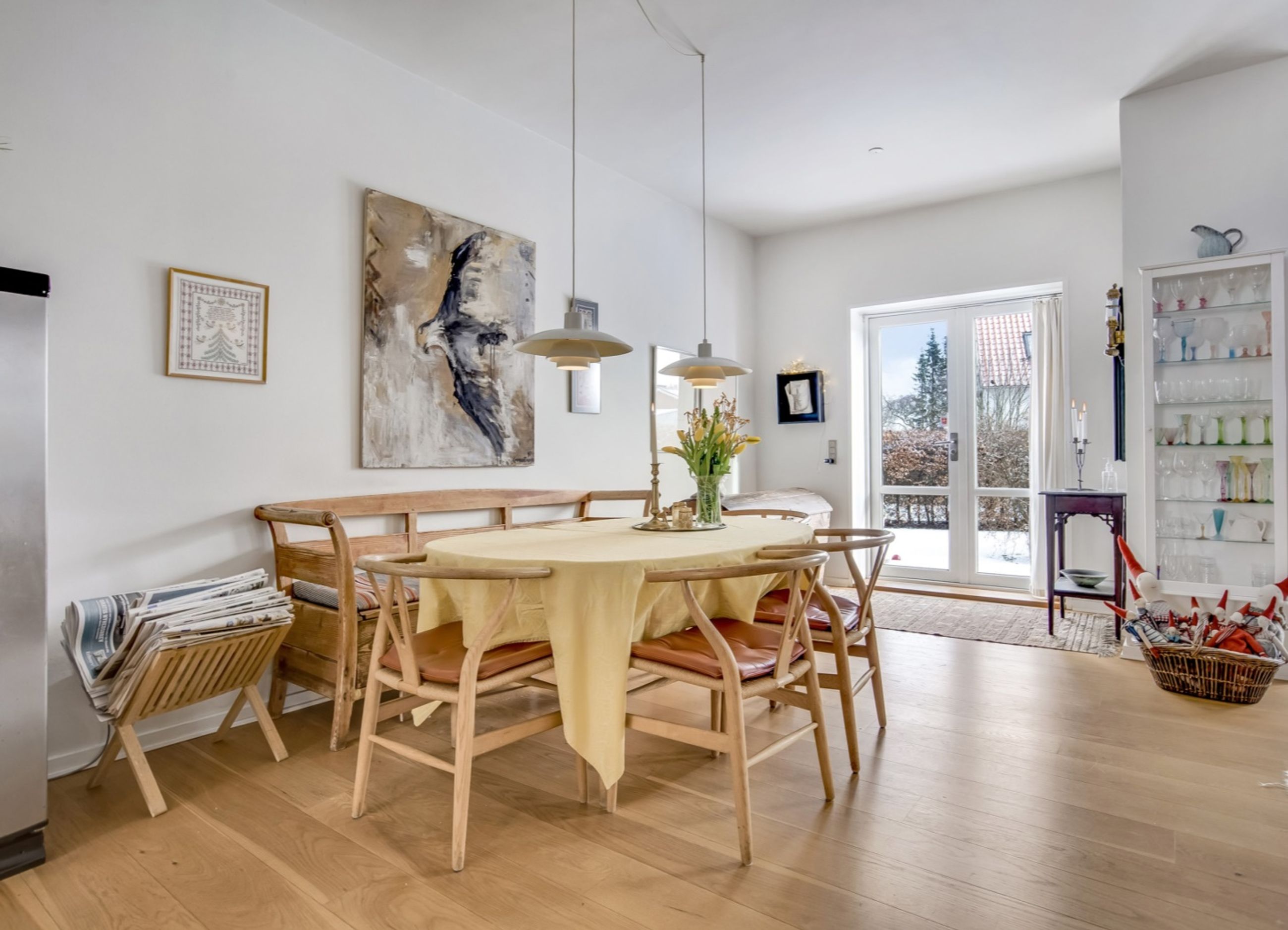 forbindelse med en rummelig stue. De store vindues- og dørpartier lader lyset strømme ind og
