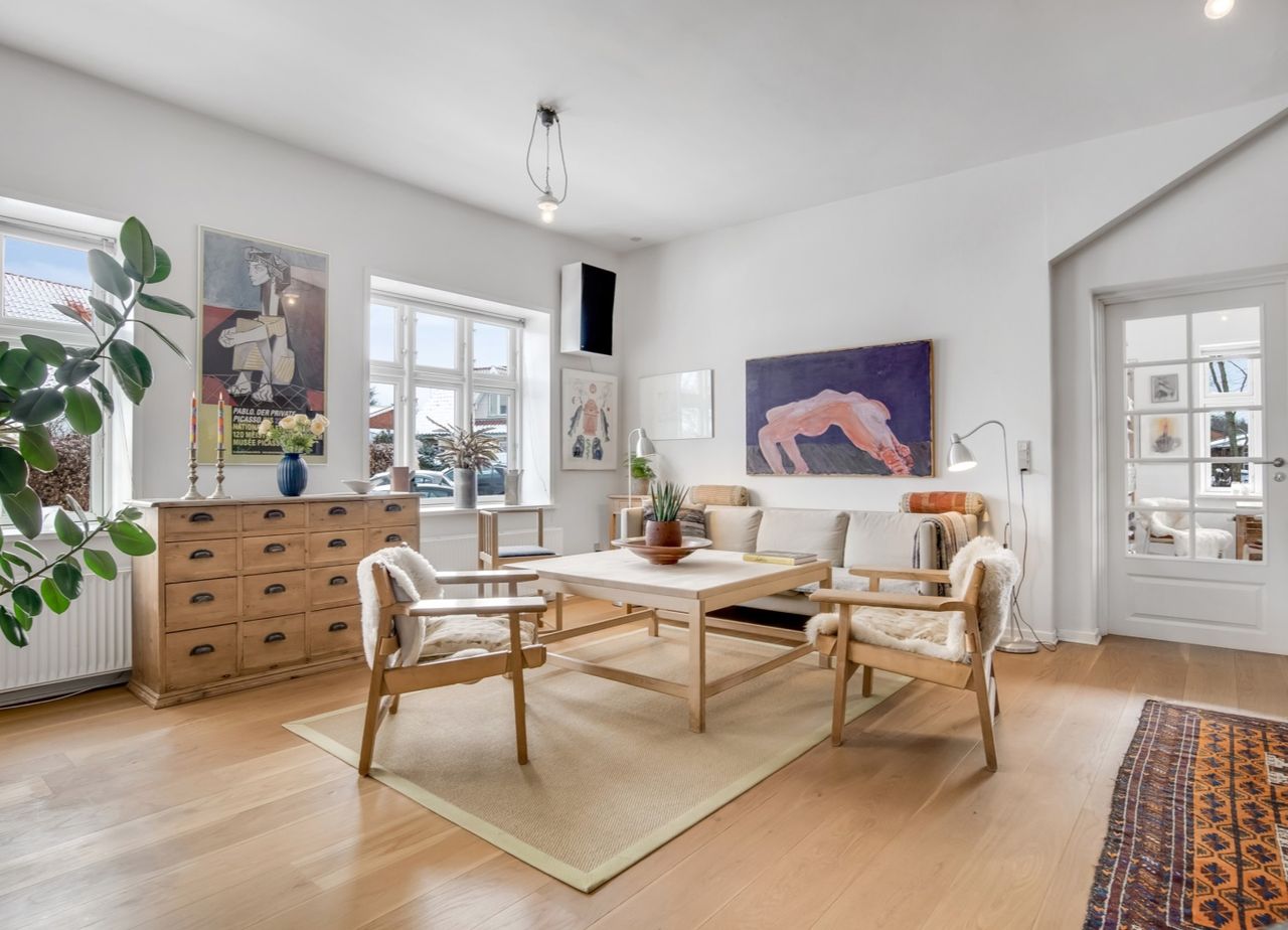 skaber en hyggelig atmosfære. Den åbne planløsning giver god plads til både opholdsstue og
