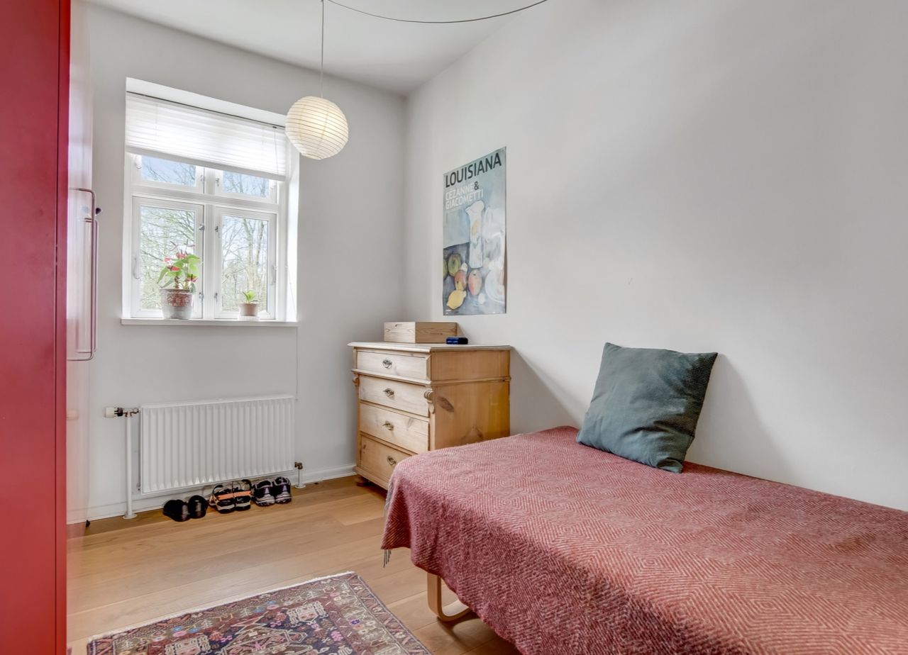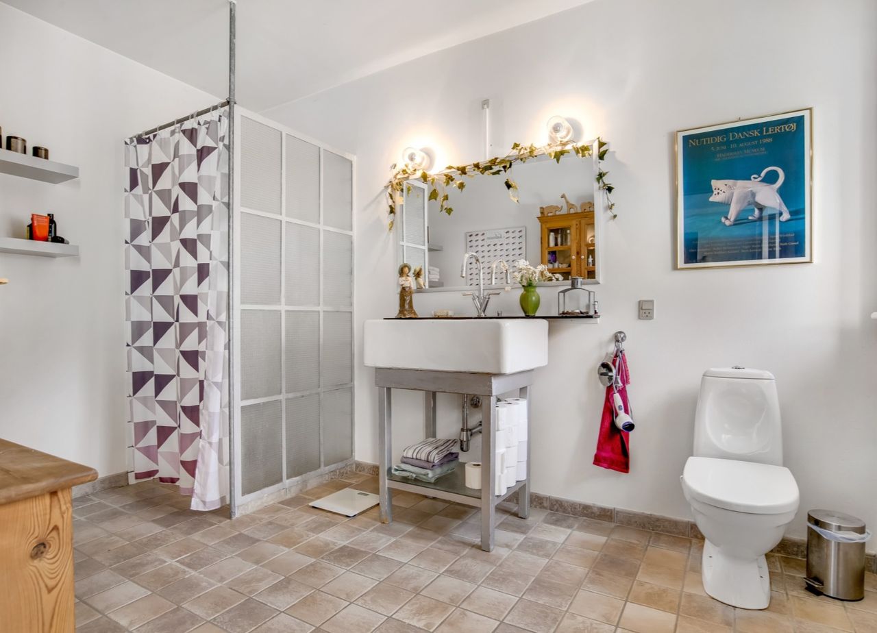 Boligen byder et ældre men stilfuldt badeværelse samt 5 velindrettede værelser fordelt over 1. salen