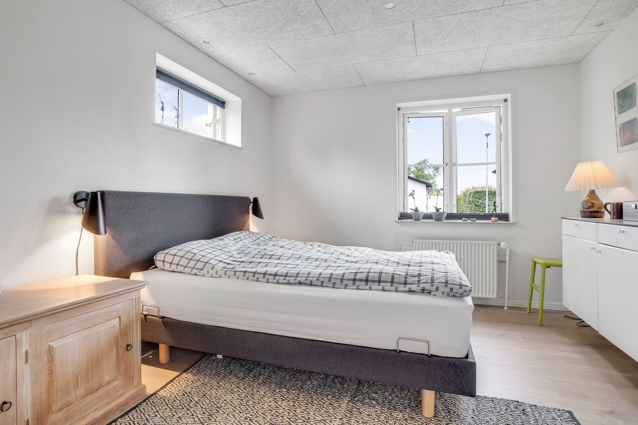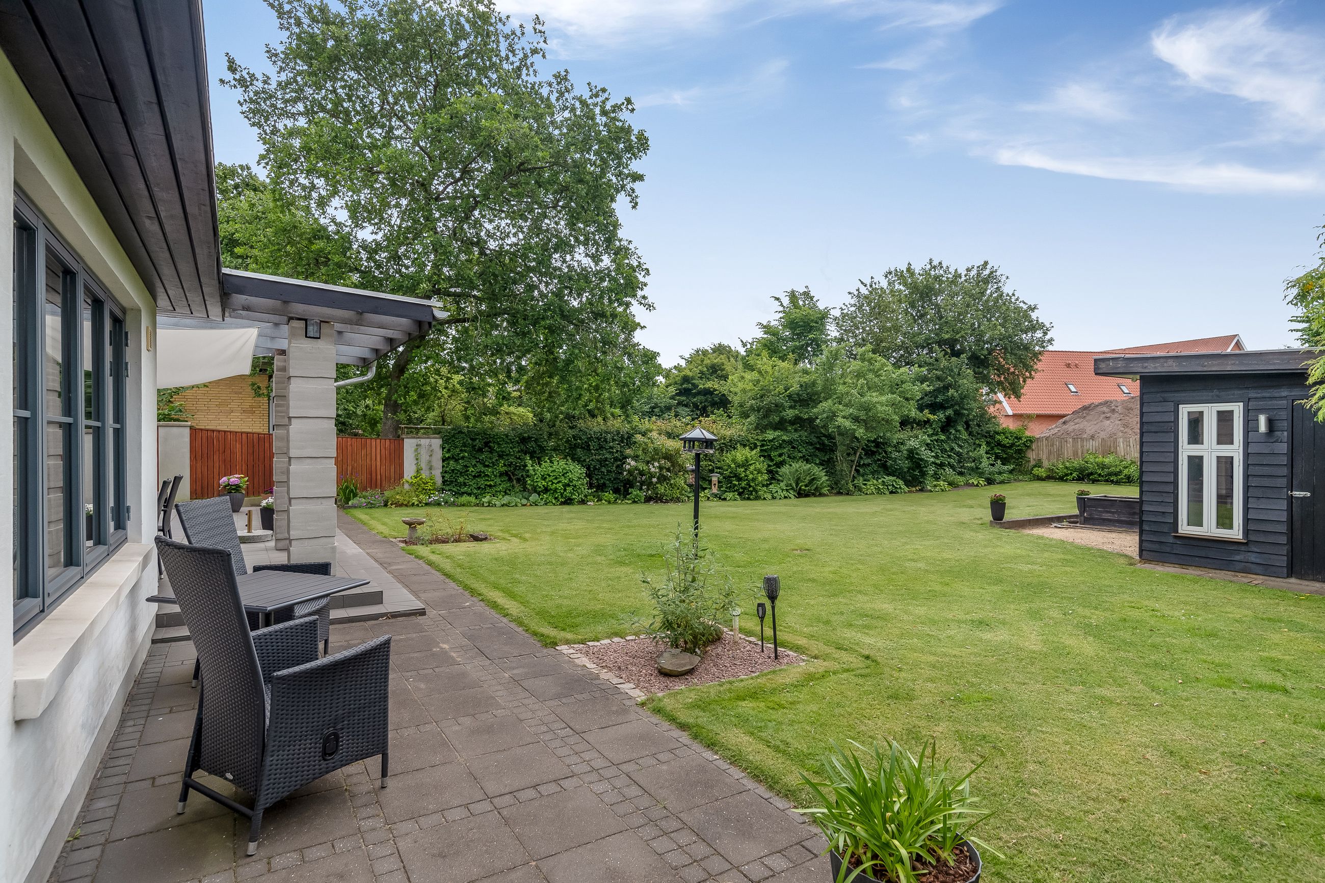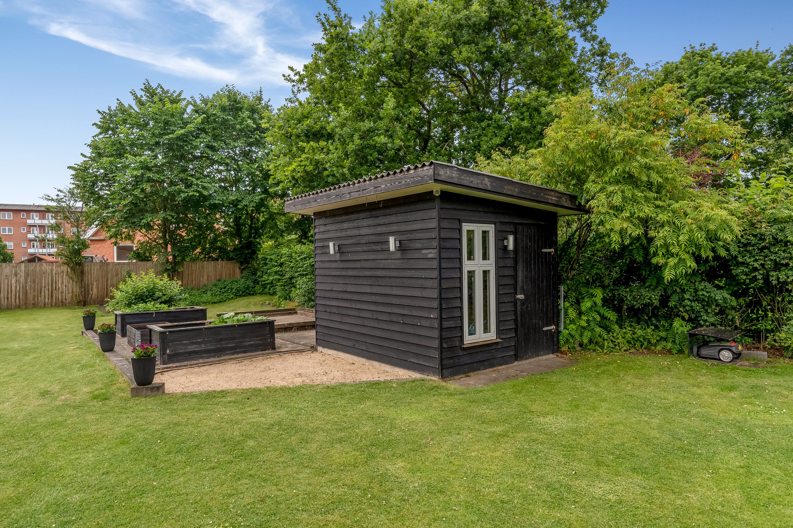 Udenfor finder man en lukket og solrig have med flere gode rum til både boldspil, solbadning, køkkenhave og bålhygge. Haven er sydvestvendt og har et hyggeligt gårdhavemiljø, der skaber god stemning i de varme måneder. Til boligen hører også et integreret redskabsskur med plads til opbevaring.