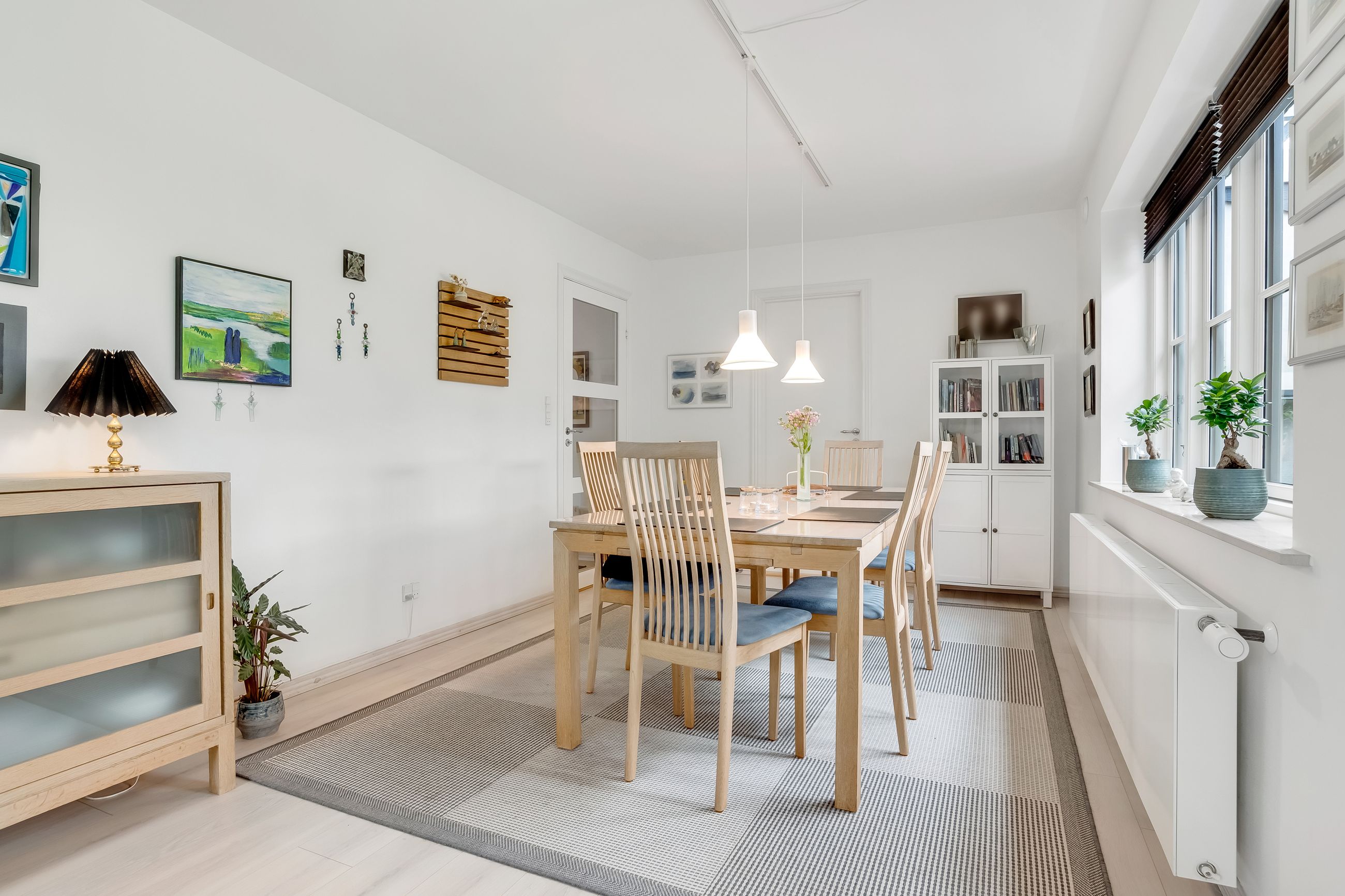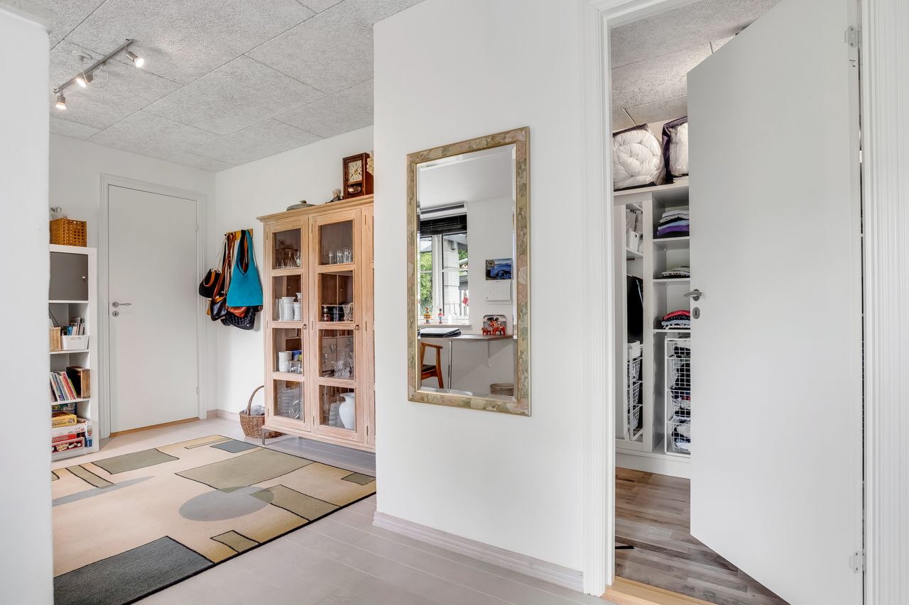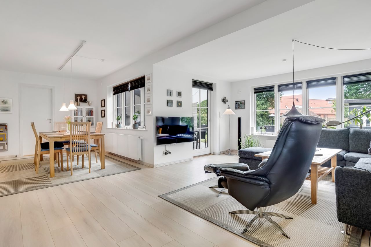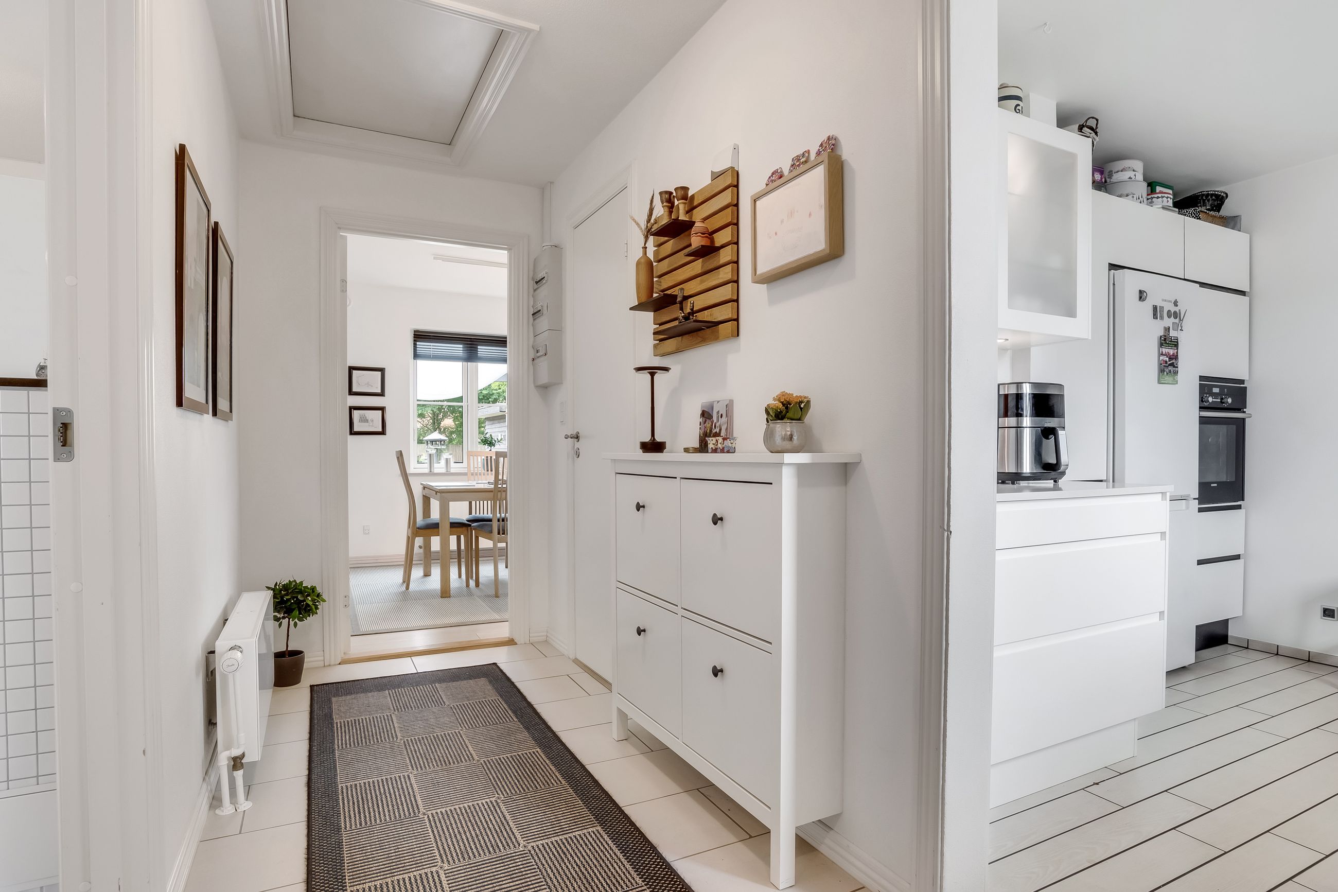 Indretningen rummer en entré, et lyst køkken og hele to badeværelser – hvoraf det ene både har badekar og bruseniche. Derudover et værelse med tilstødende disponibelt rum samt et større værelse med walk-in og direkte udgang til terrassen. Har man behov for flere værelser, er der mulighed for at tænke kreativt med en opdeling af dette rum. Stuen er i vinkel og rummer både spiseplads og opholdsområde – herfra er der udgang til en delvist overdækket terrasse, der vender mod sydvest.