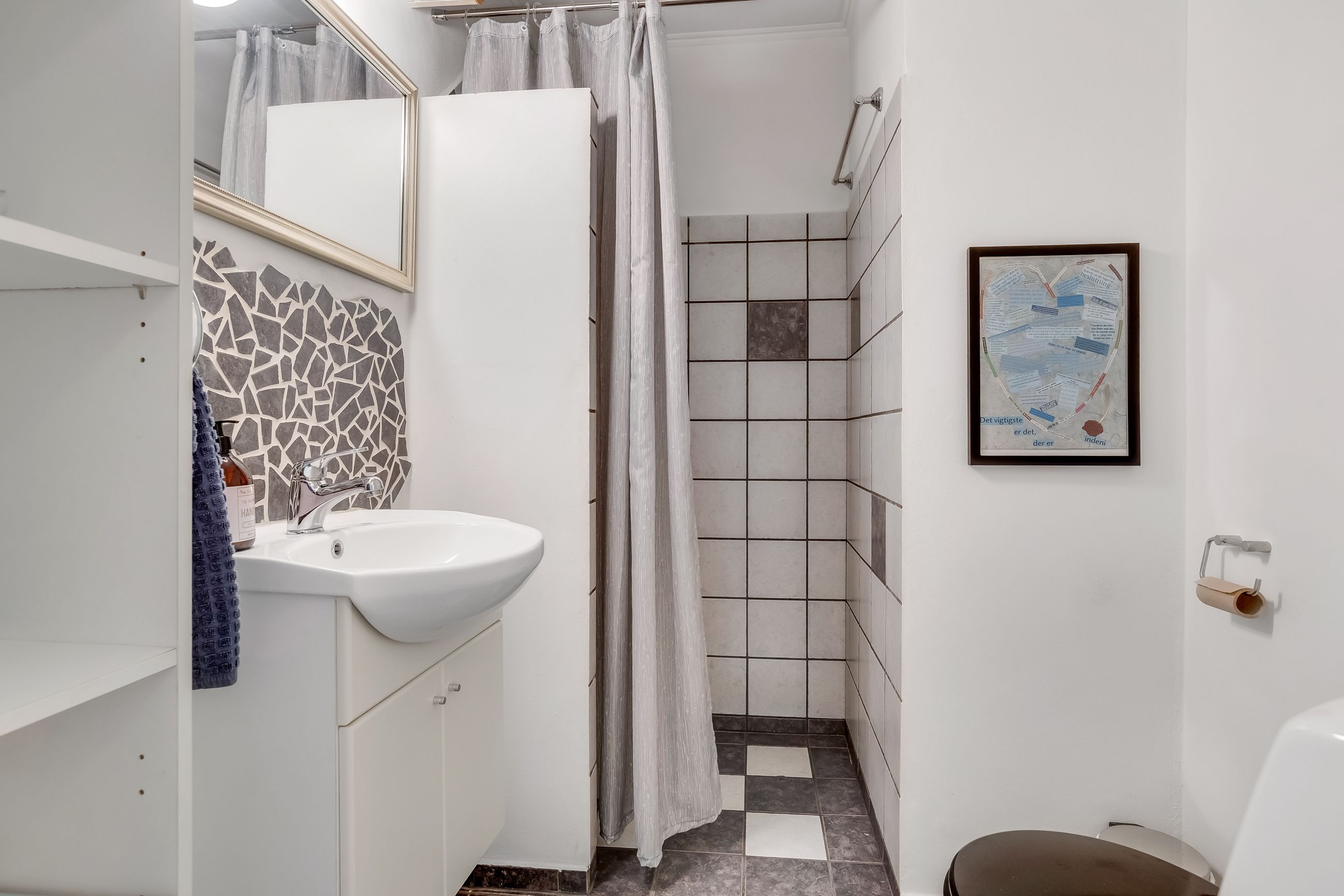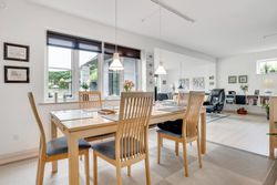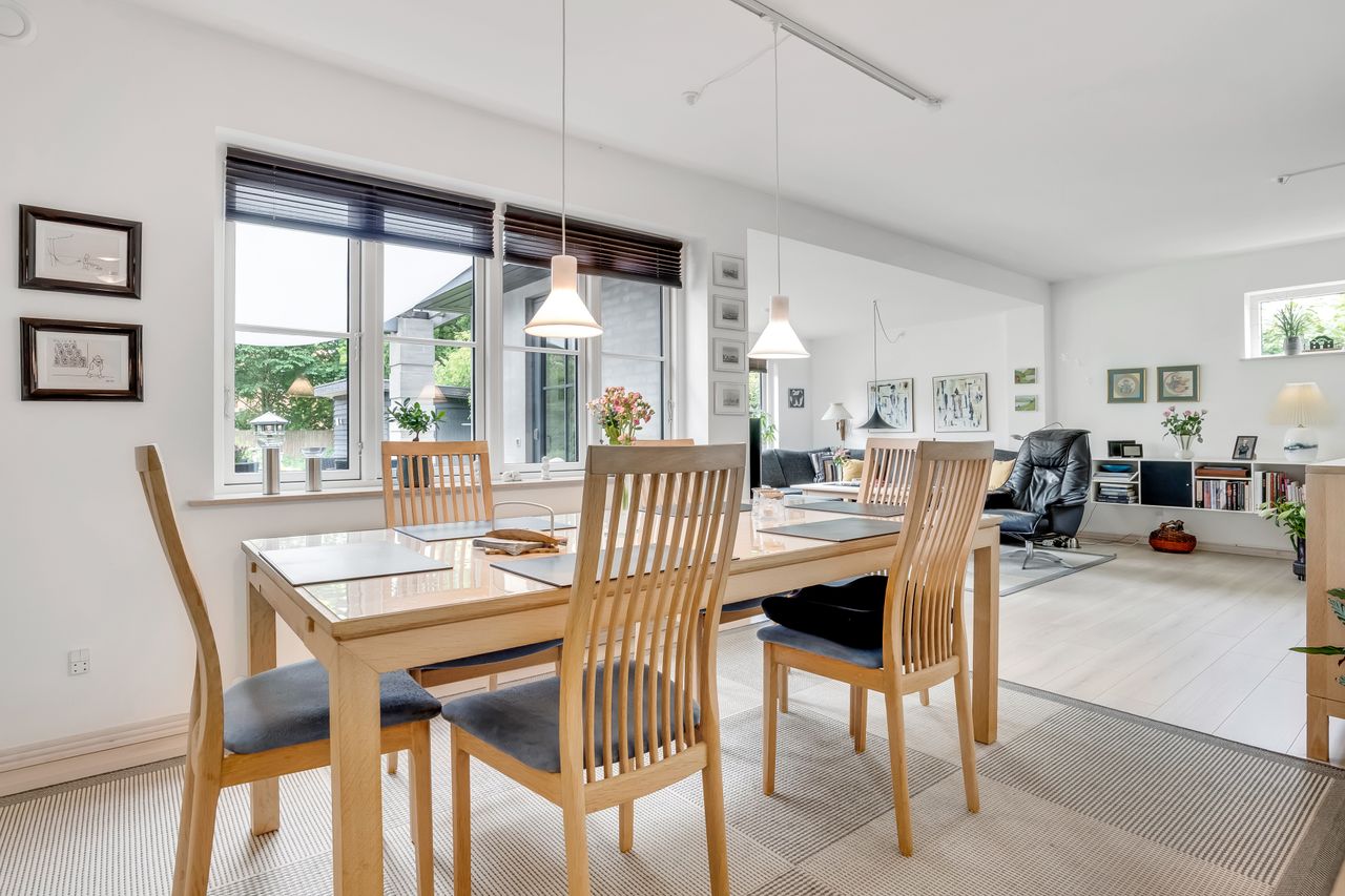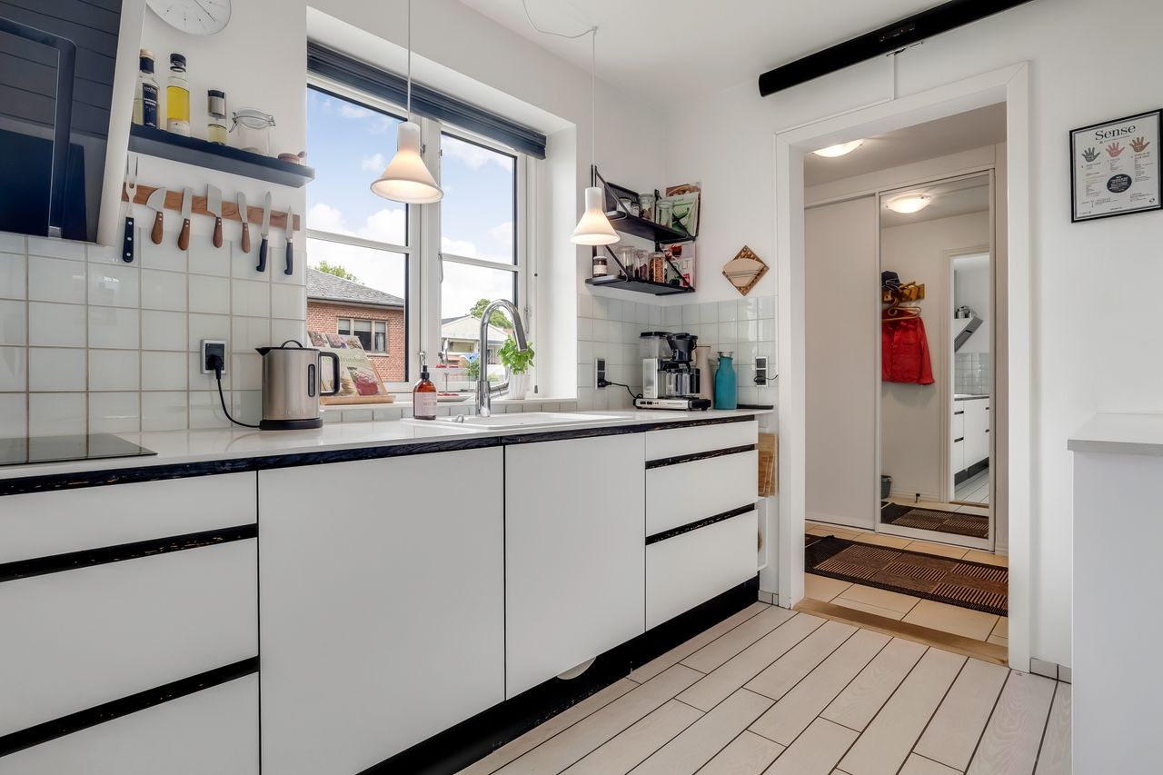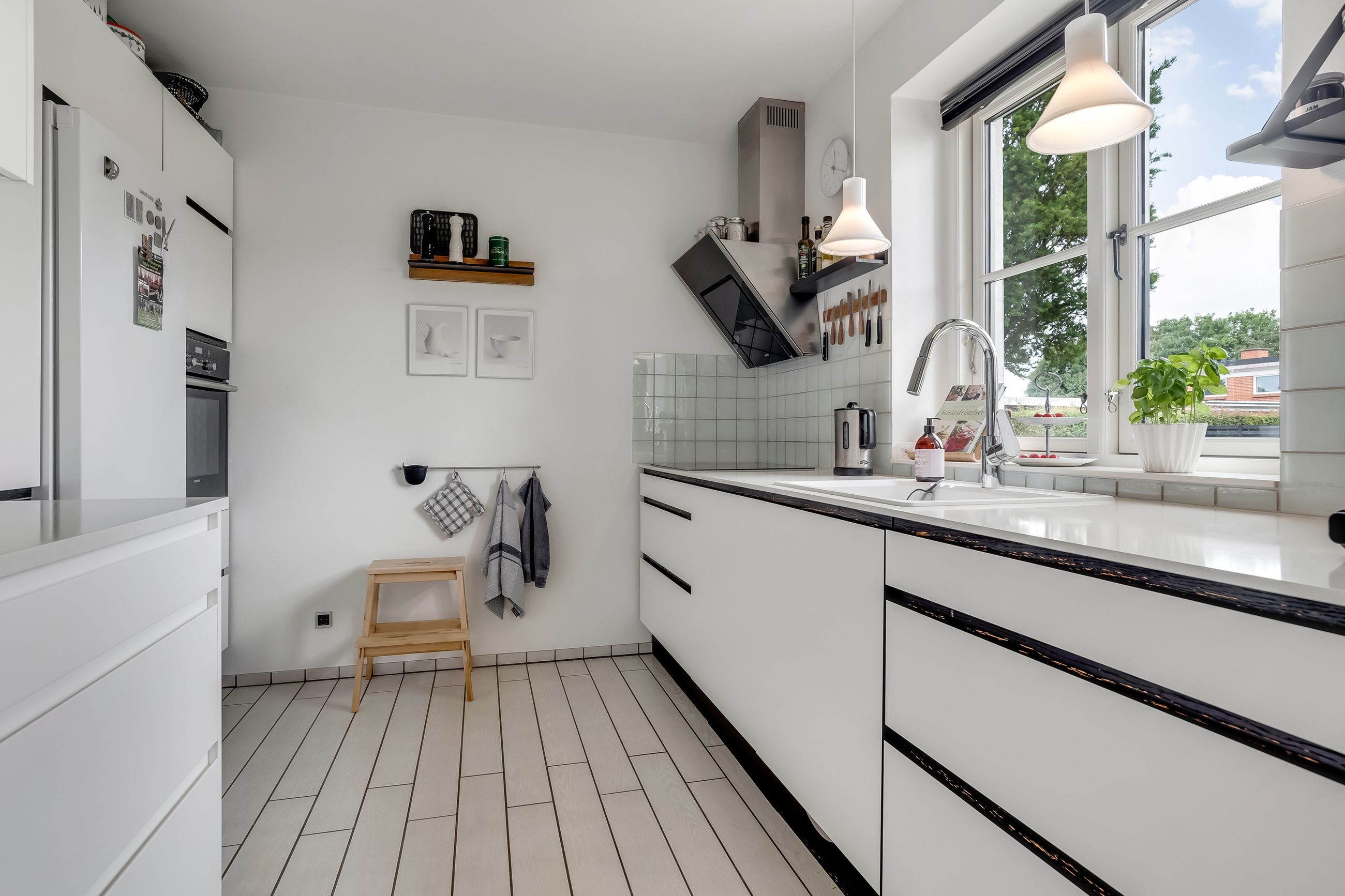 Indretningen rummer en entré, et lyst køkken og hele to badeværelser – hvoraf det ene både har badekar og bruseniche. Derudover et værelse med tilstødende disponibelt rum samt et større værelse med walk-in og direkte udgang til terrassen. Har man behov for flere værelser, er der mulighed for at tænke kreativt med en opdeling af dette rum. Stuen er i vinkel og rummer både spiseplads og opholdsområde – herfra er der udgang til en delvist overdækket terrasse, der vender mod sydvest.