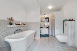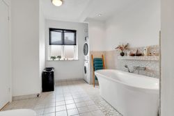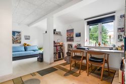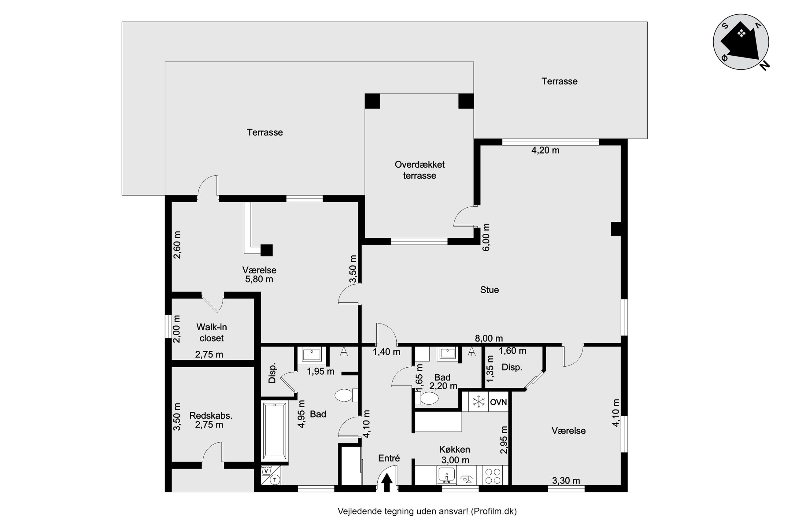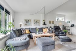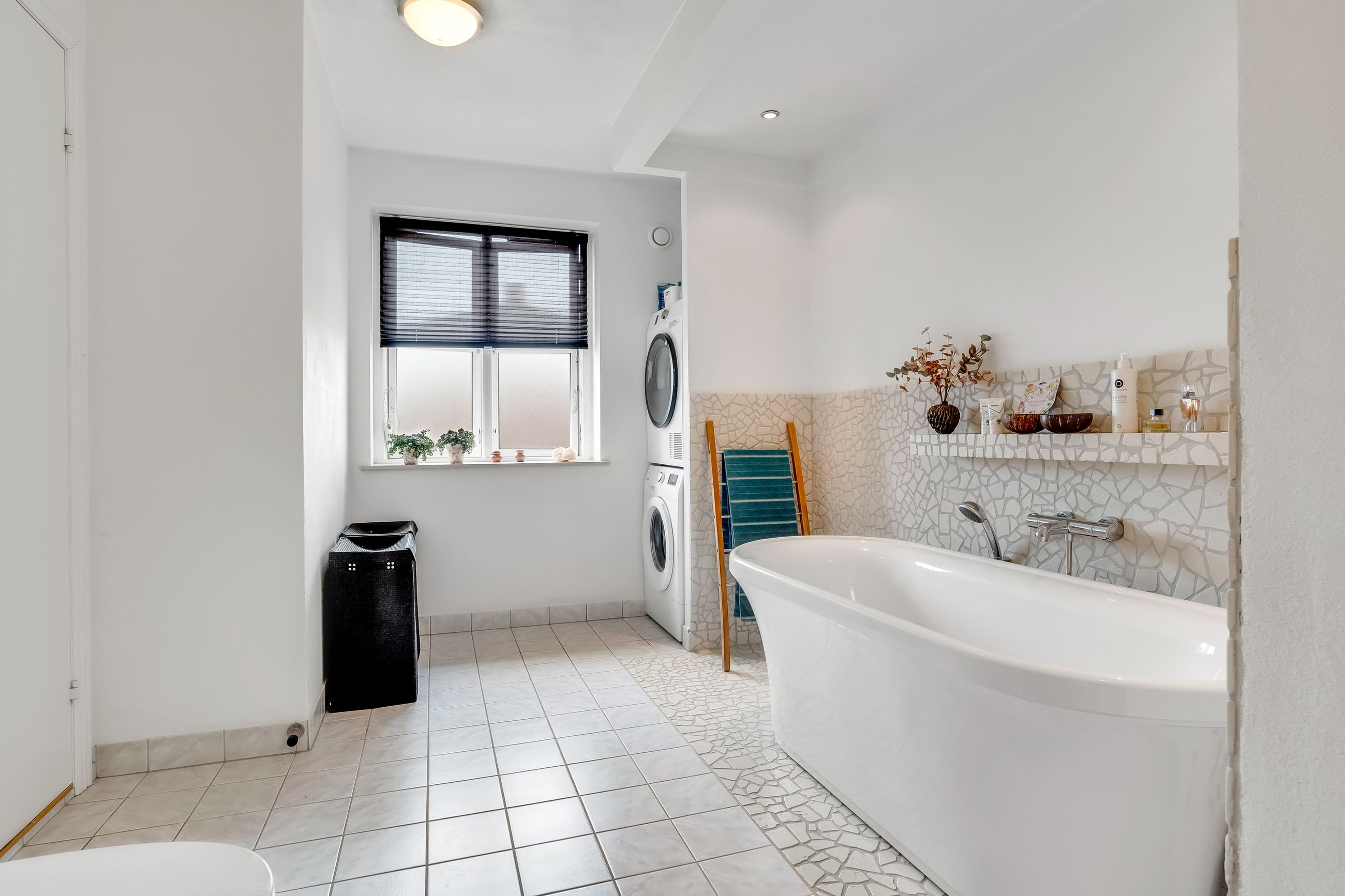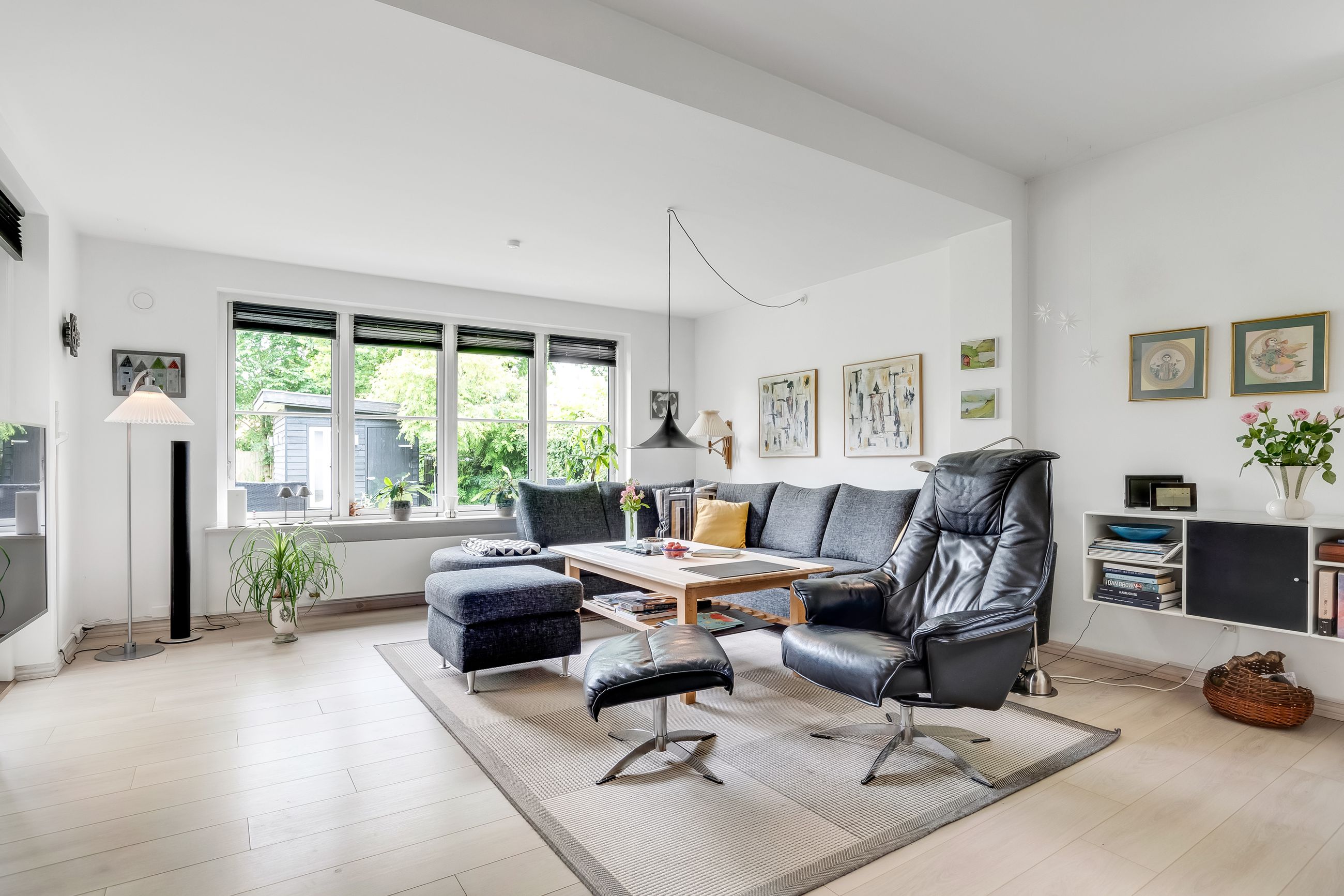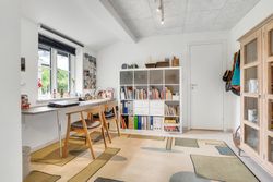 Indretningen rummer en entré, et lyst køkken og hele to badeværelser – hvoraf det ene både har badekar og bruseniche. Derudover et værelse med tilstødende disponibelt rum samt et større værelse med walk-in og direkte udgang til terrassen. Har man behov for flere værelser, er der mulighed for at tænke kreativt med en opdeling af dette rum. Stuen er i vinkel og rummer både spiseplads og opholdsområde – herfra er der udgang til en delvist overdækket terrasse, der vender mod sydvest.