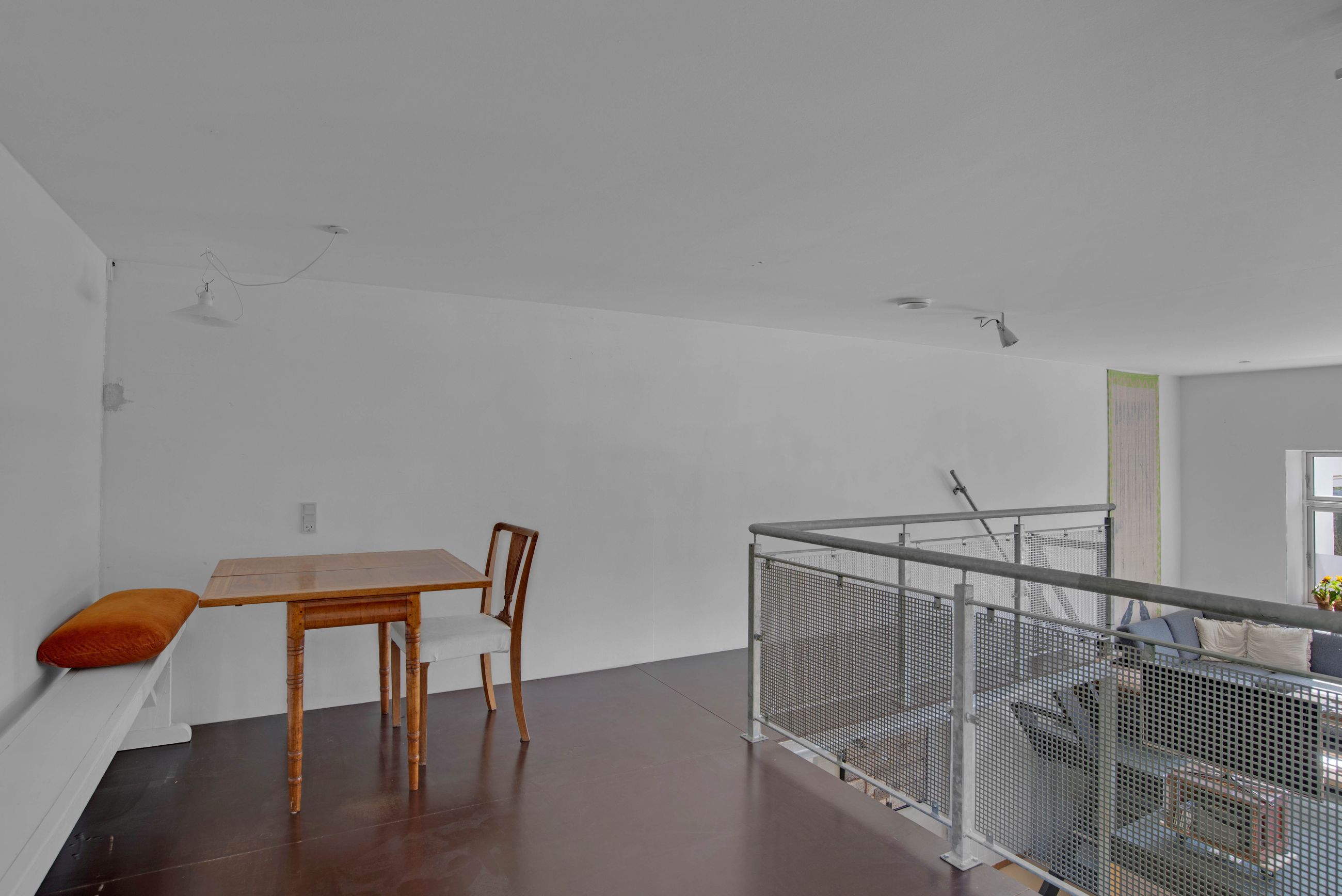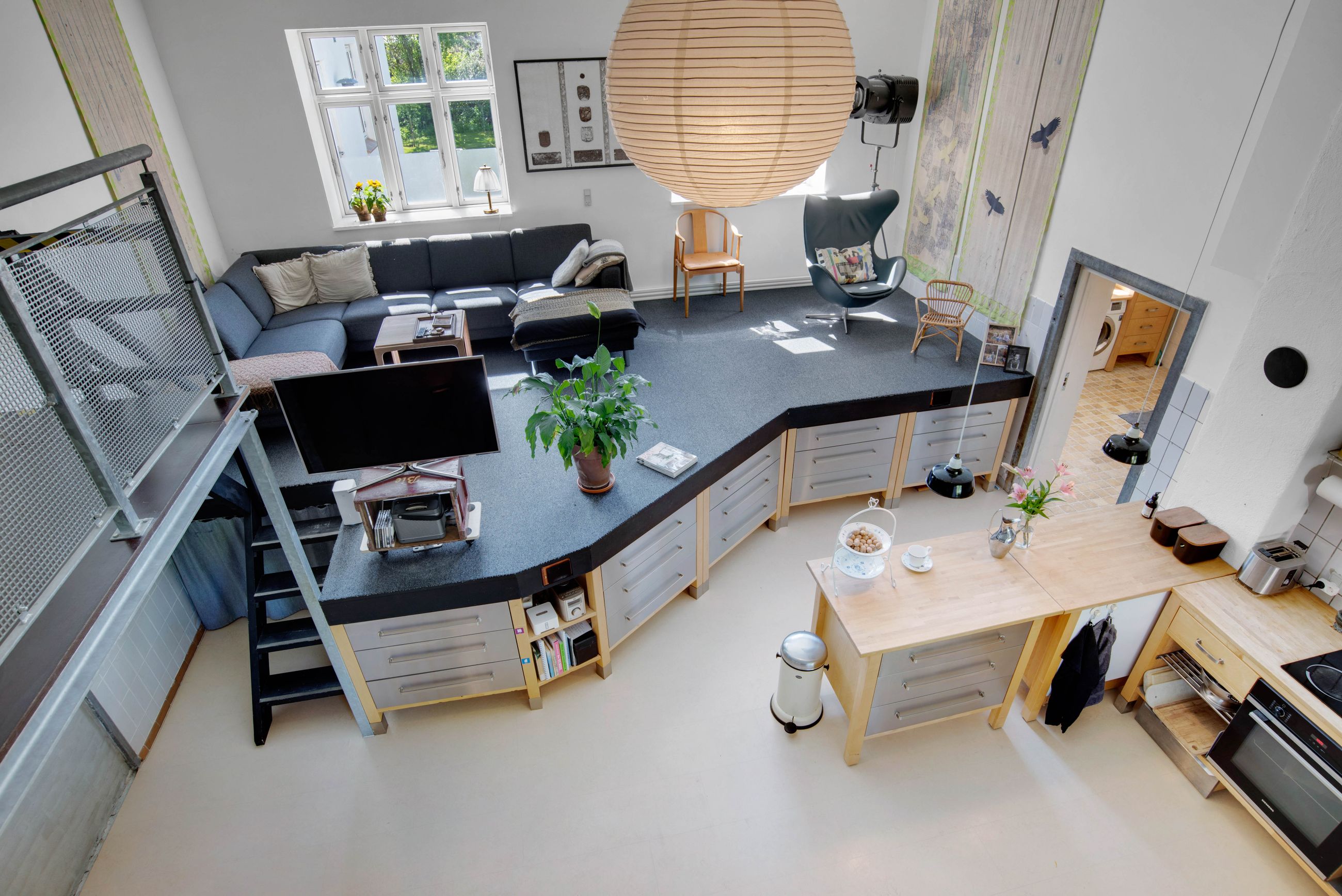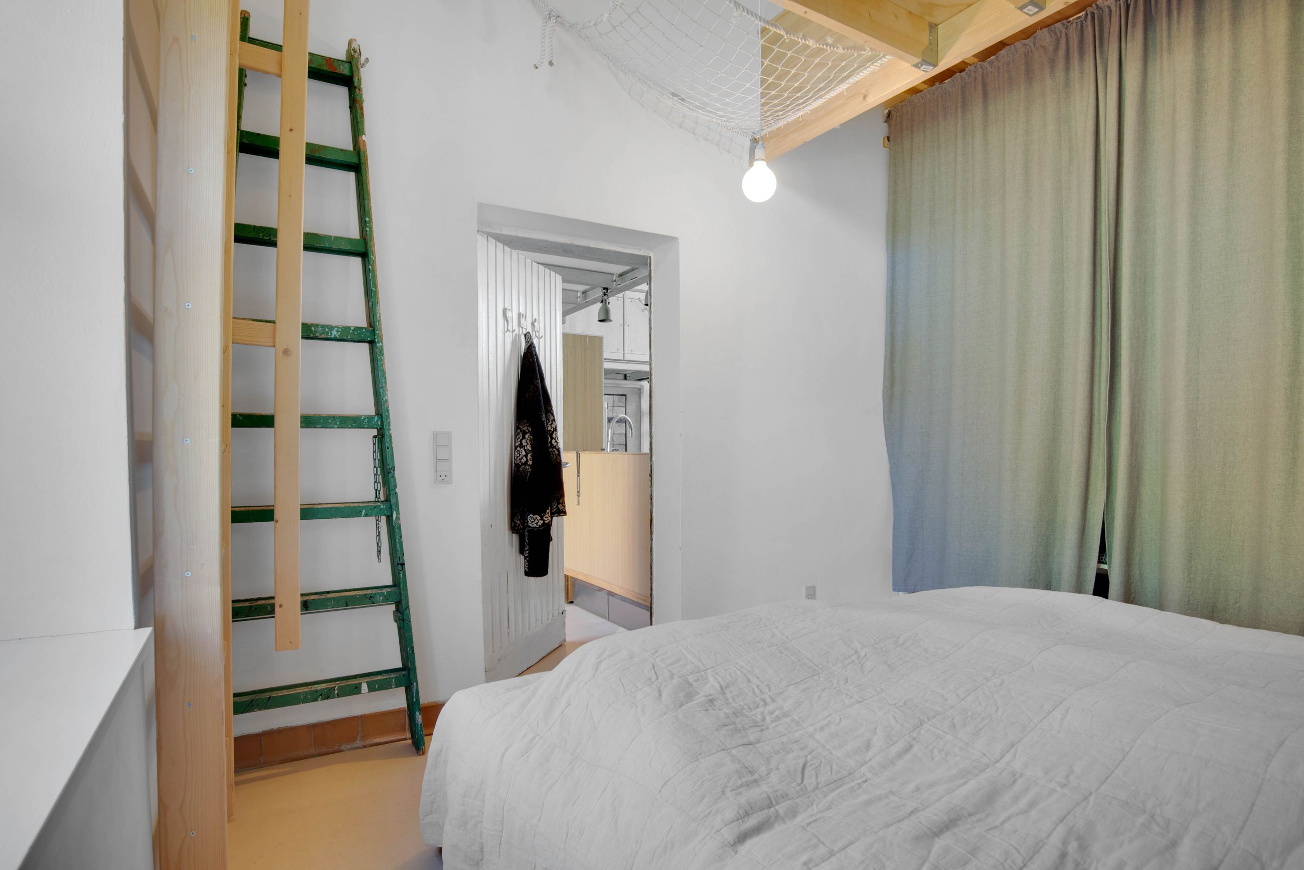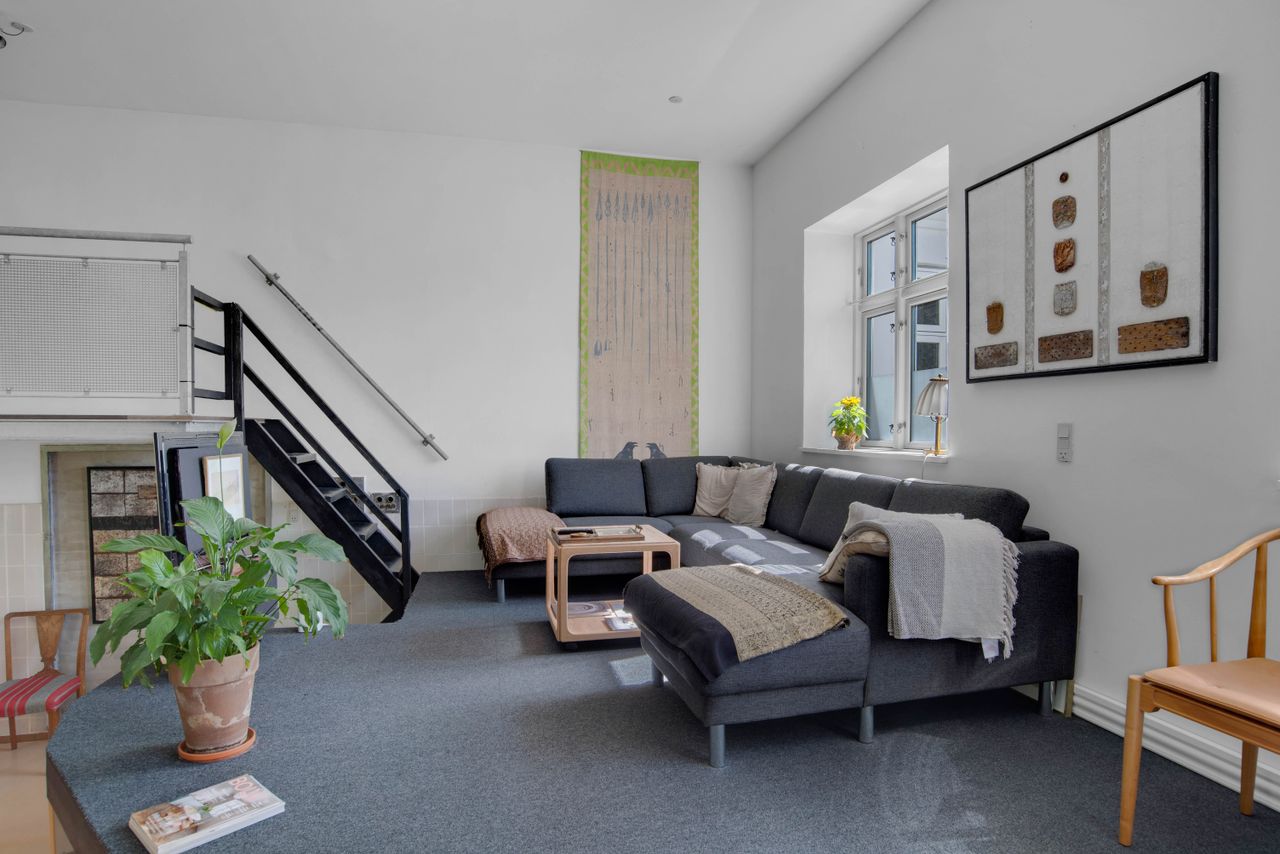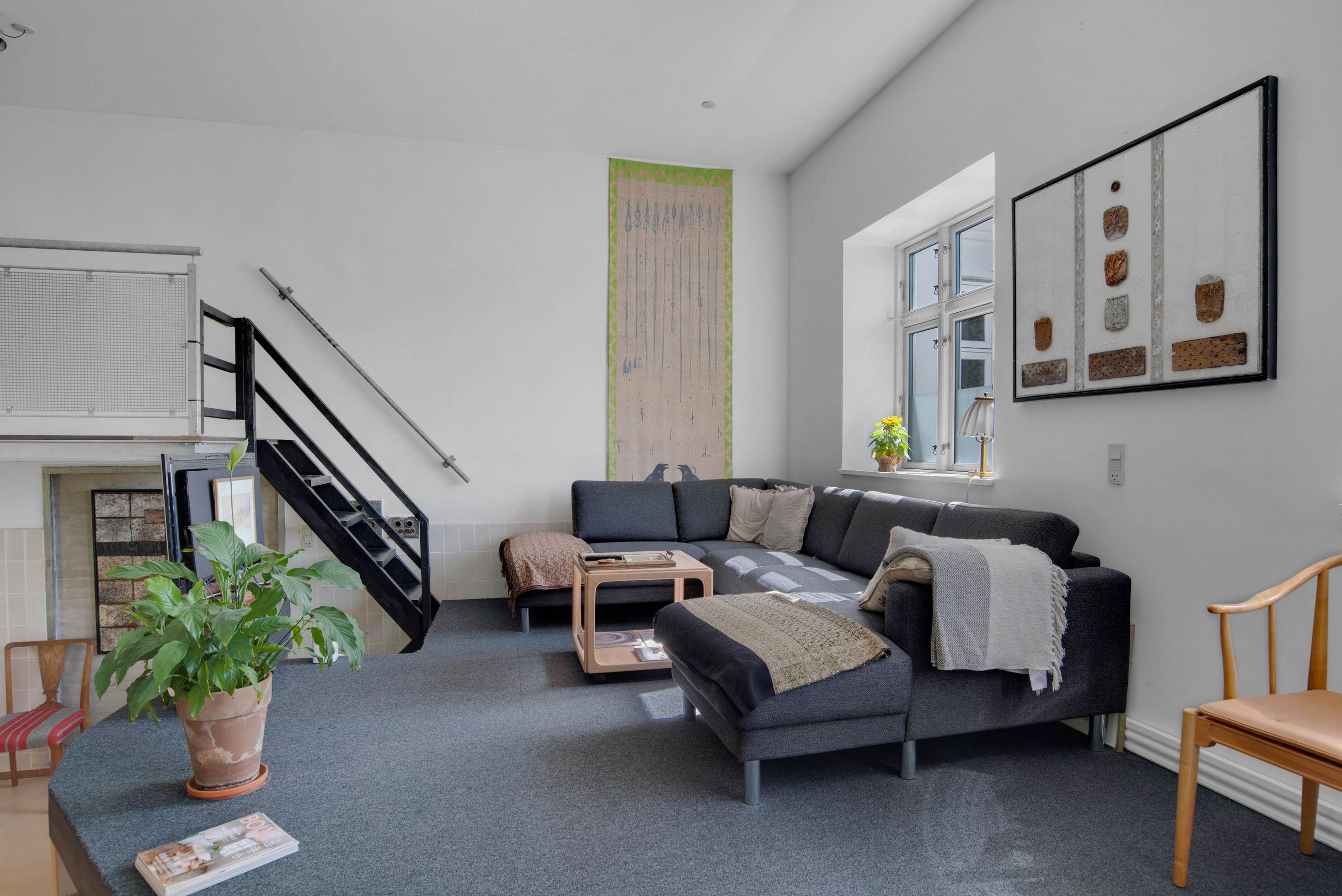 Lejligheden er indrettet med entré, et lyst køkken/alrum og stue i ét, hvor niveauforskellene skaber en spændende og dynamisk rumfornemmelse. Dertil kommer et badeværelse samt et værelse med trappe op til en hems - perfekt som ekstra soveplads, kontor eller kreativ krog.
