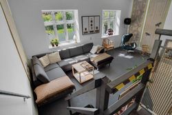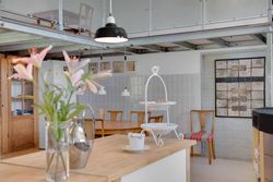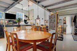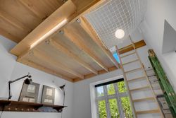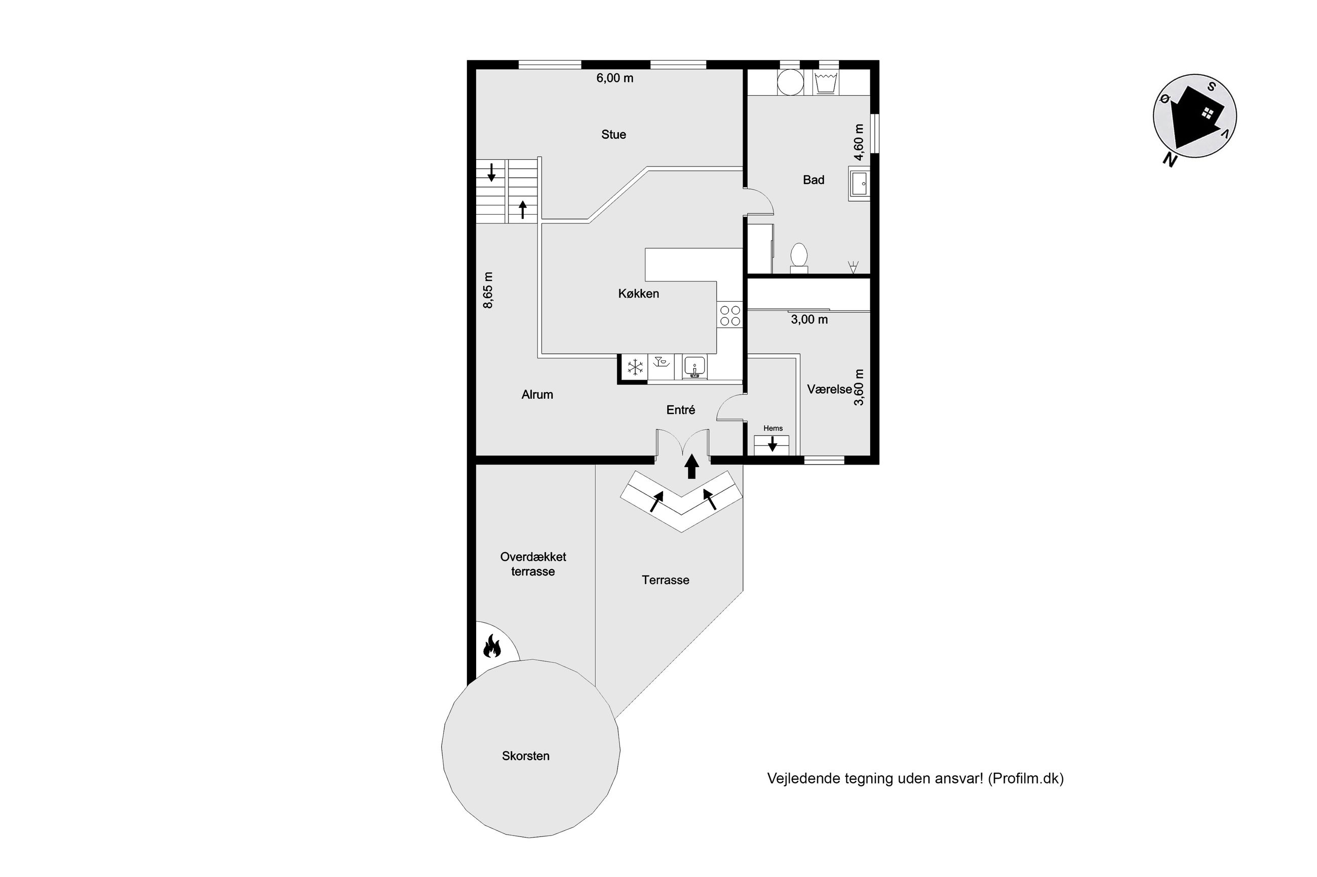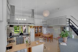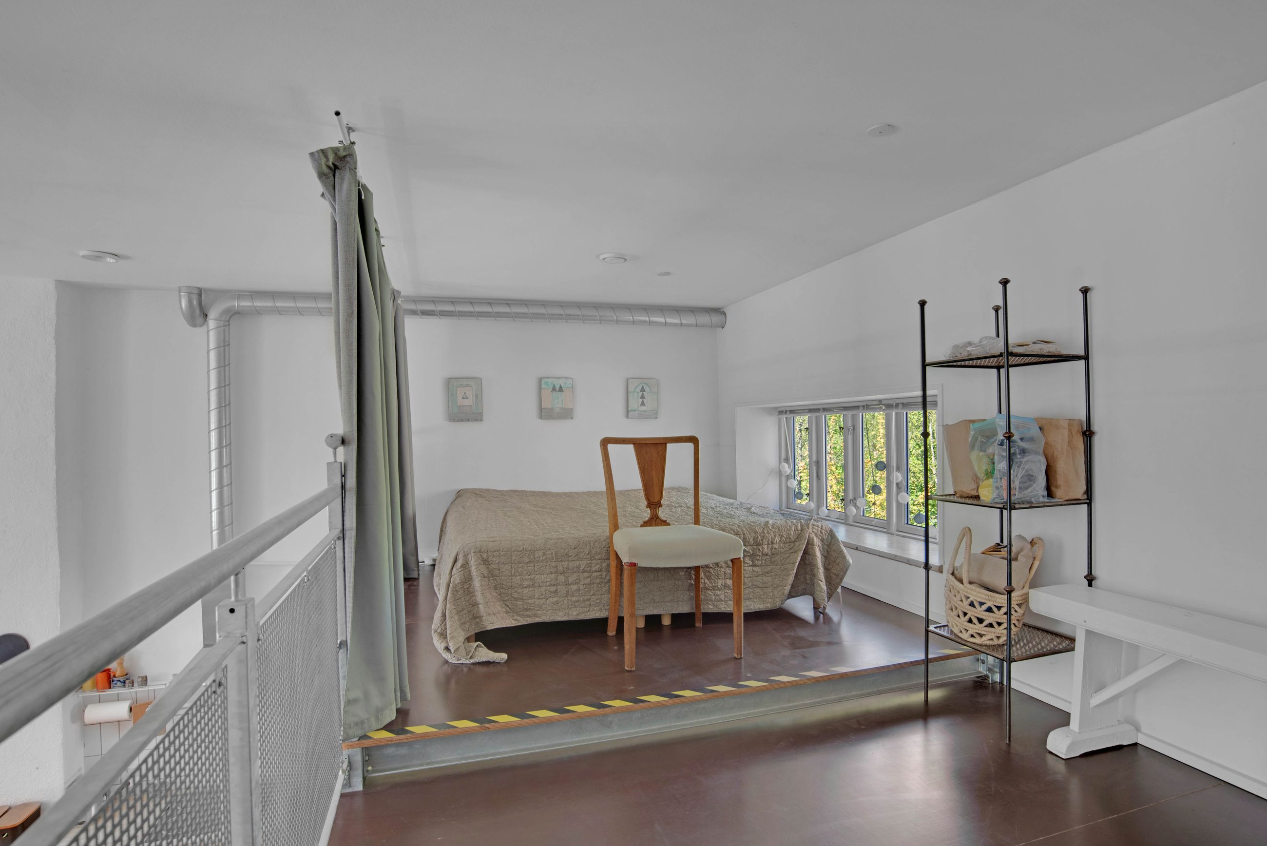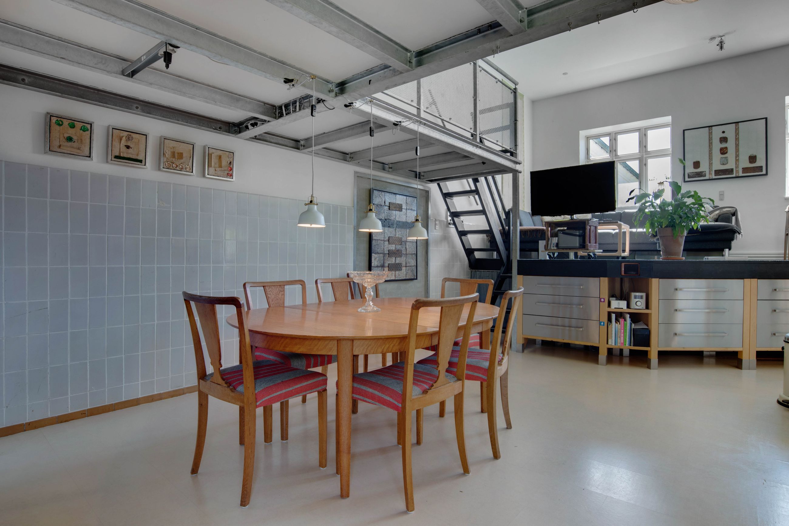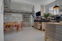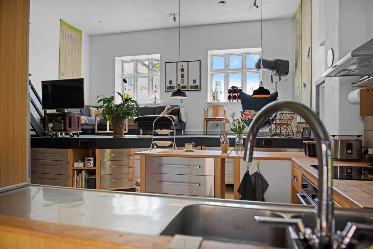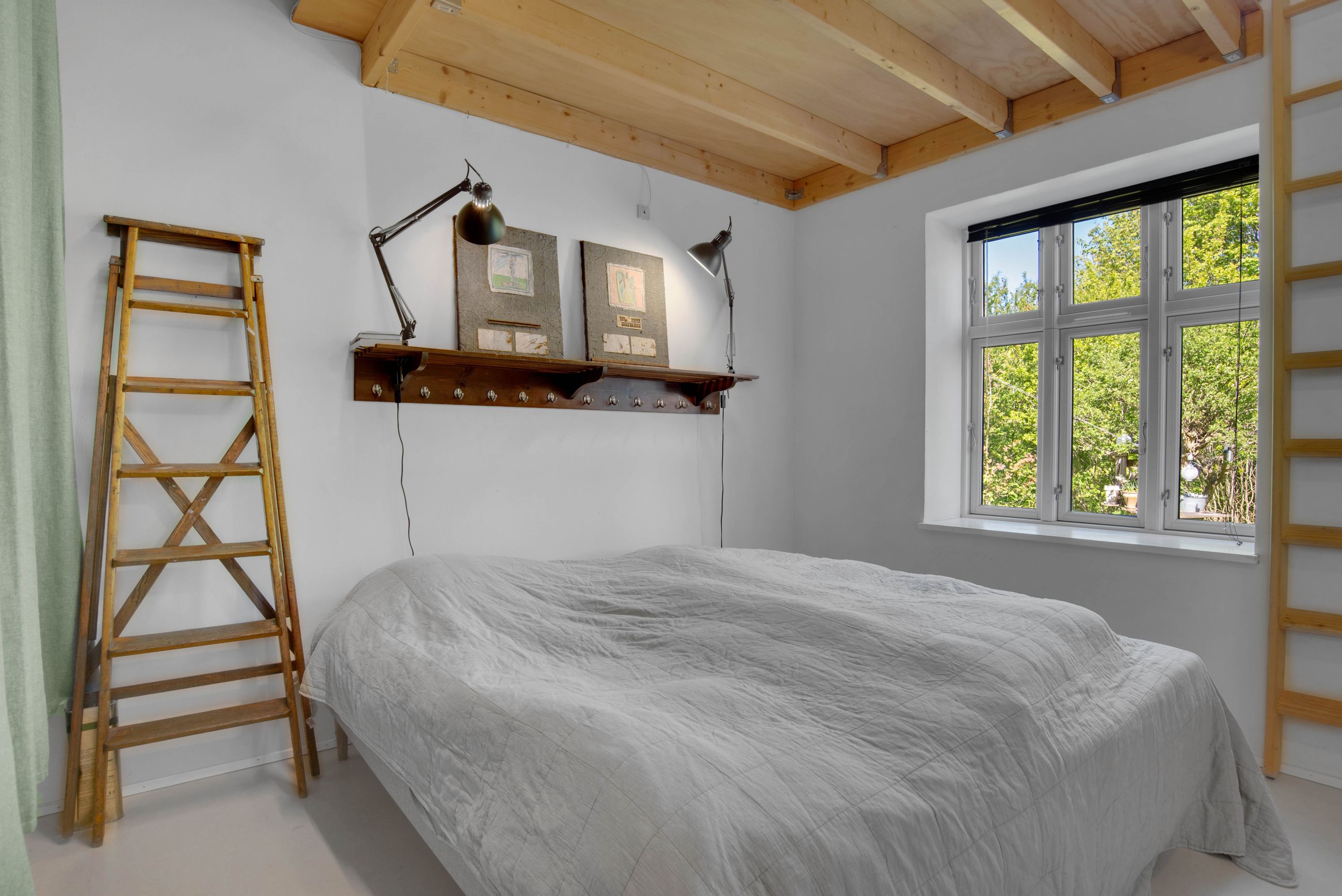 Lejligheden er indrettet med entré, et lyst køkken/alrum og stue i ét, hvor niveauforskellene skaber en spændende og dynamisk rumfornemmelse. Dertil kommer et badeværelse samt et værelse med trappe op til en hems - perfekt som ekstra soveplads, kontor eller kreativ krog.