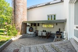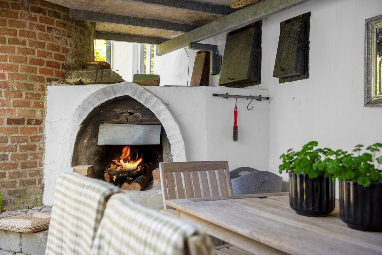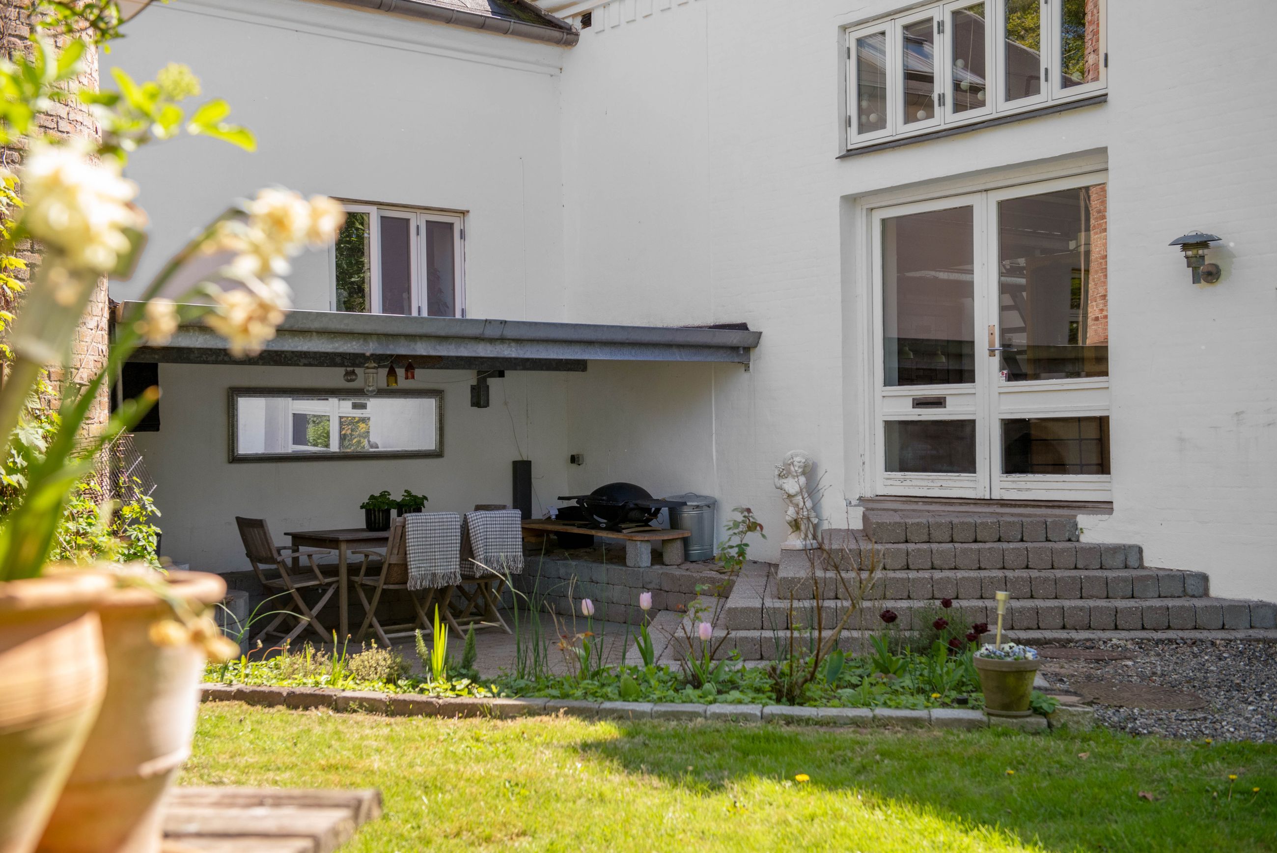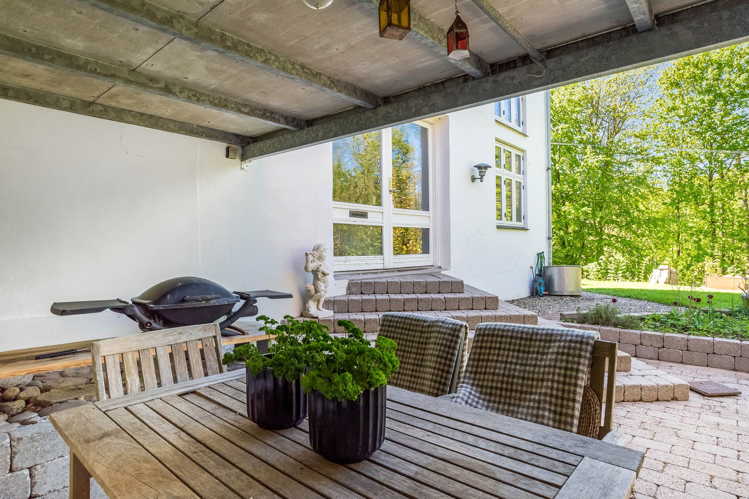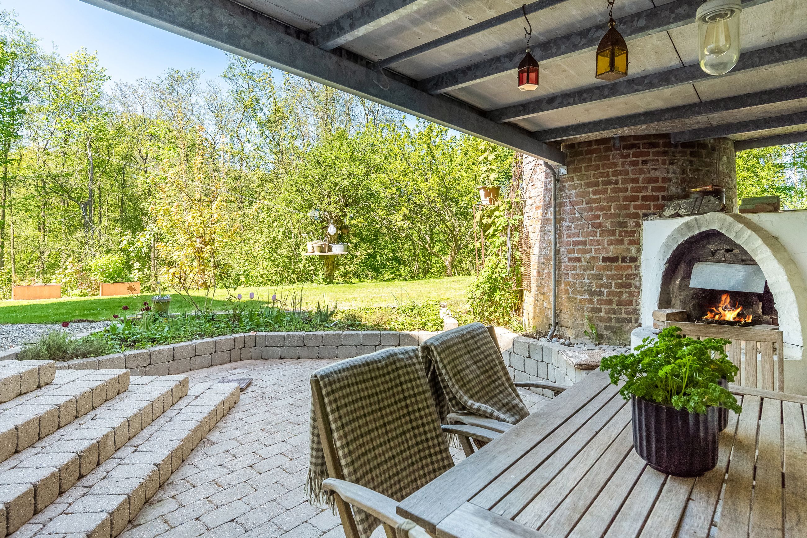Udenfor venter en skøn terrasse, hvor et overdækket område med en udendørs pejs forlænger udesæsonen og skaber de ideelle rammer for samvær og afslapning.