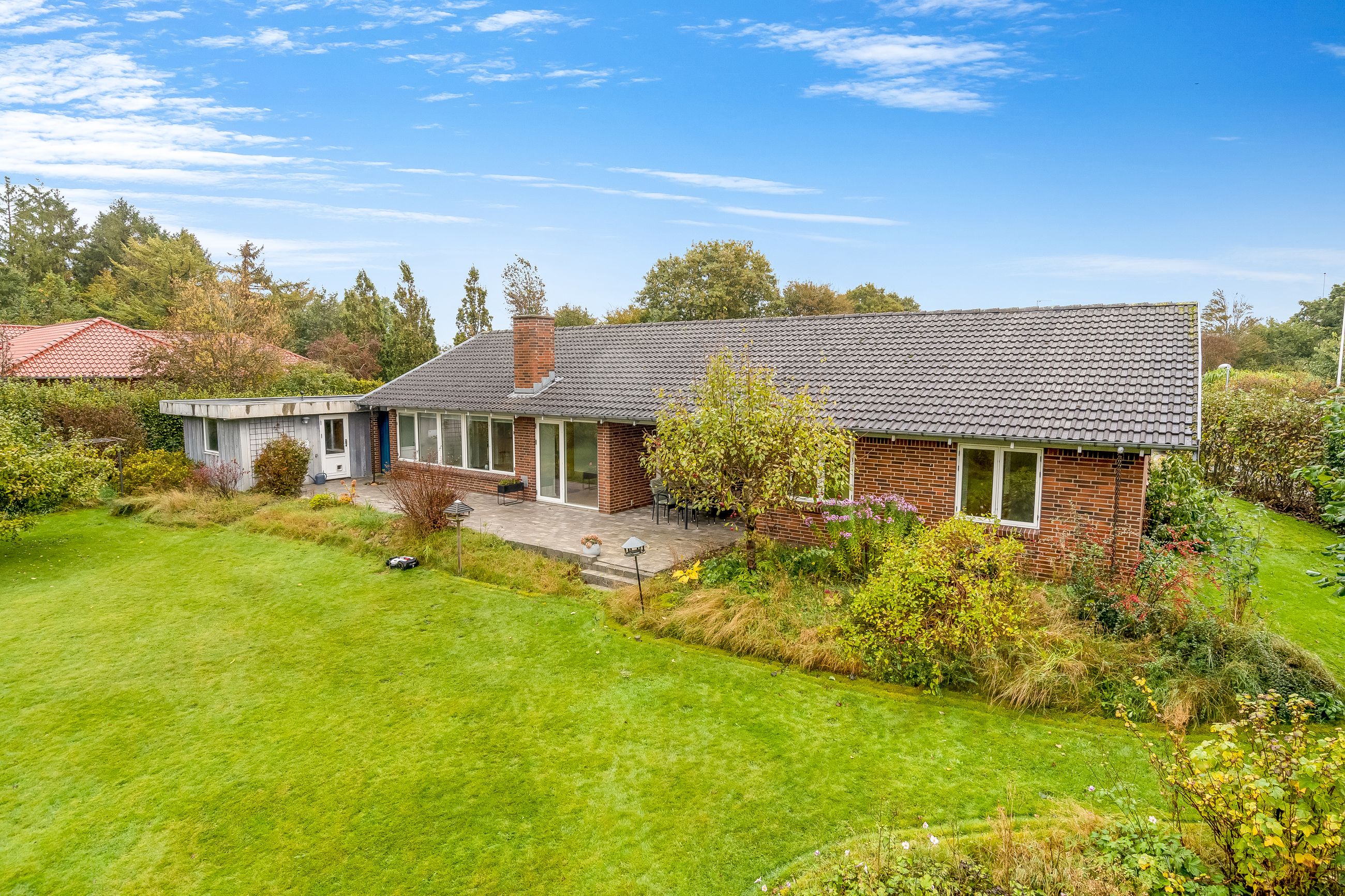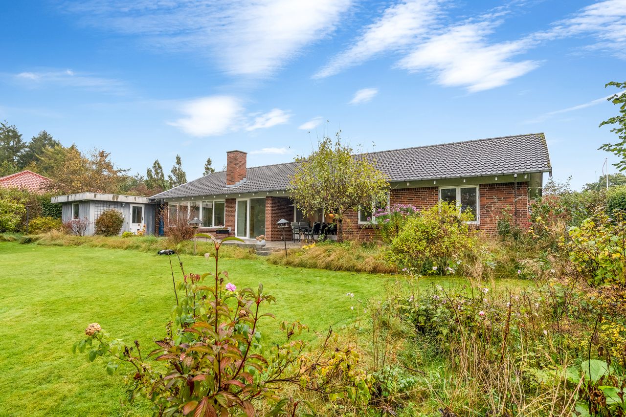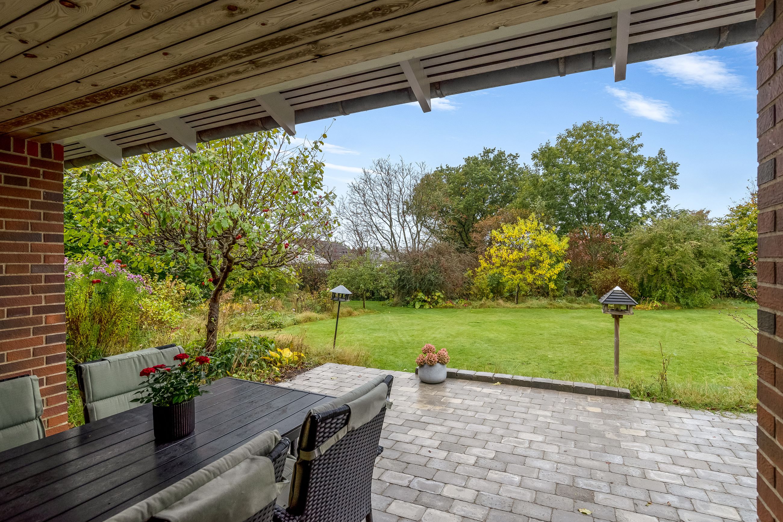 Den syd-/vestvendte og fredelige have byder på terrasse, stor græsplæne og hyggelig beplantning. Til huset hører desuden et isoleret skur og en carport.