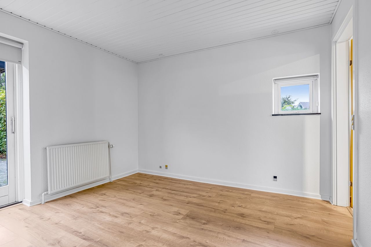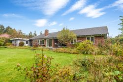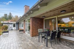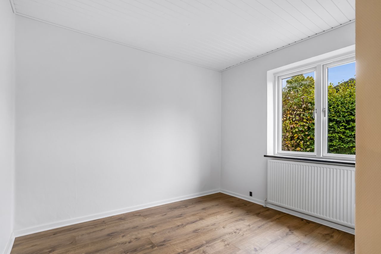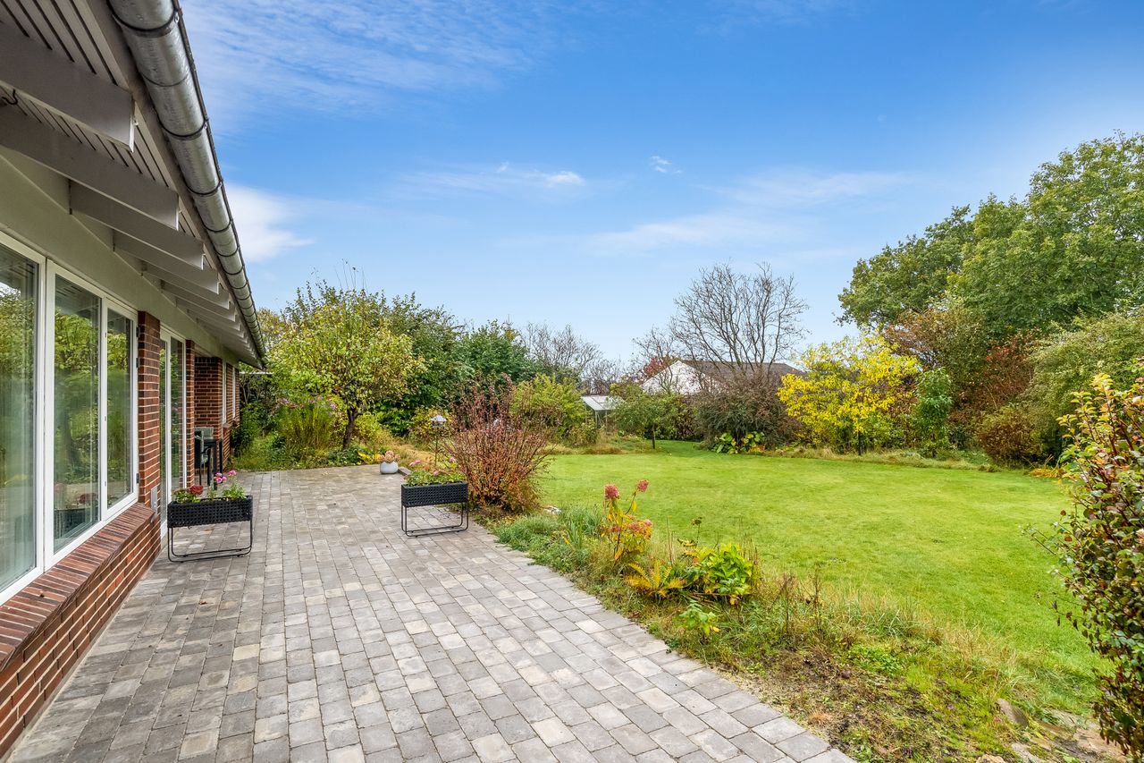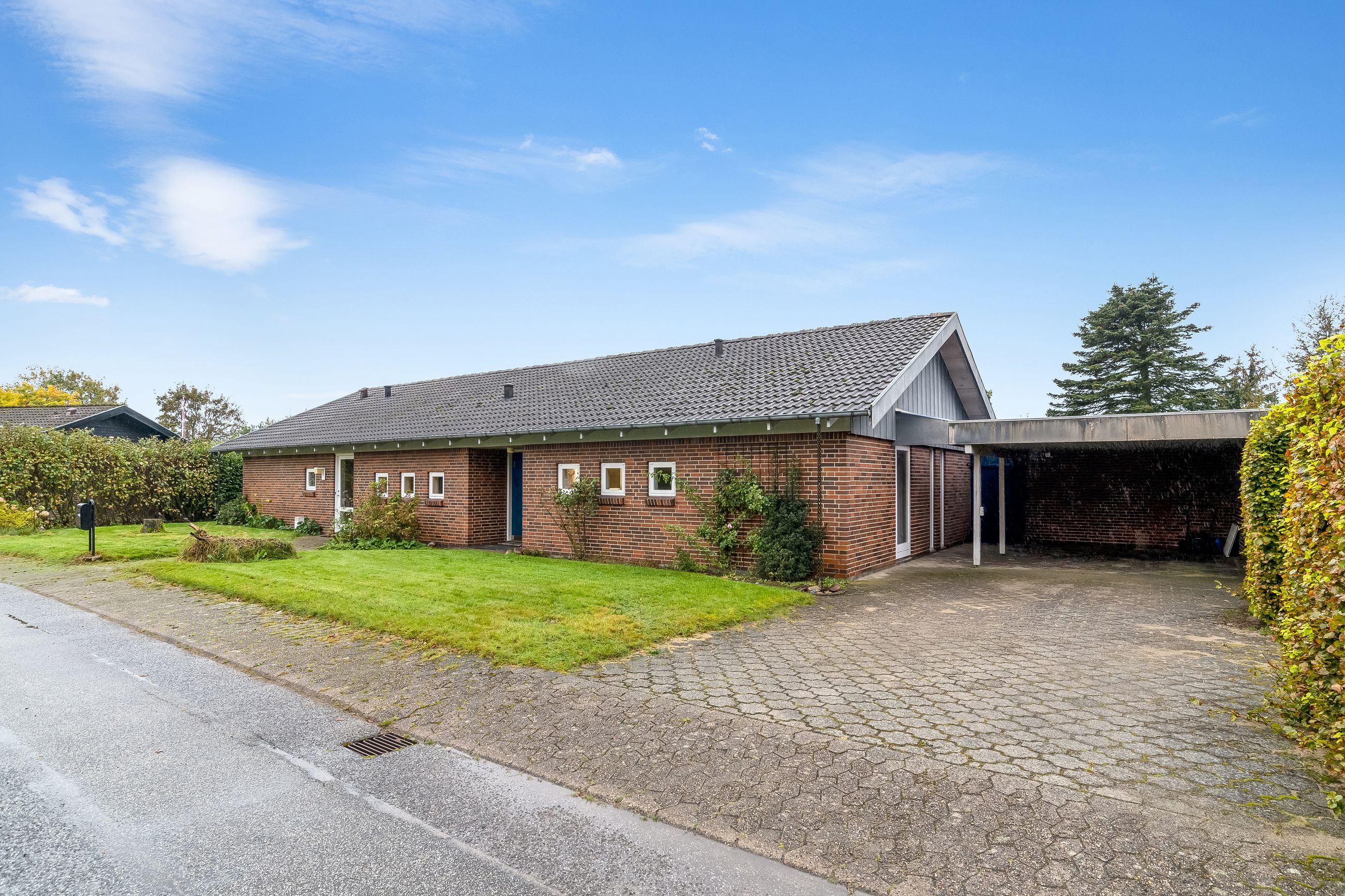 Den syd-/vestvendte og fredelige have byder på terrasse, stor græsplæne og hyggelig beplantning. Til huset hører desuden et isoleret skur og en carport.