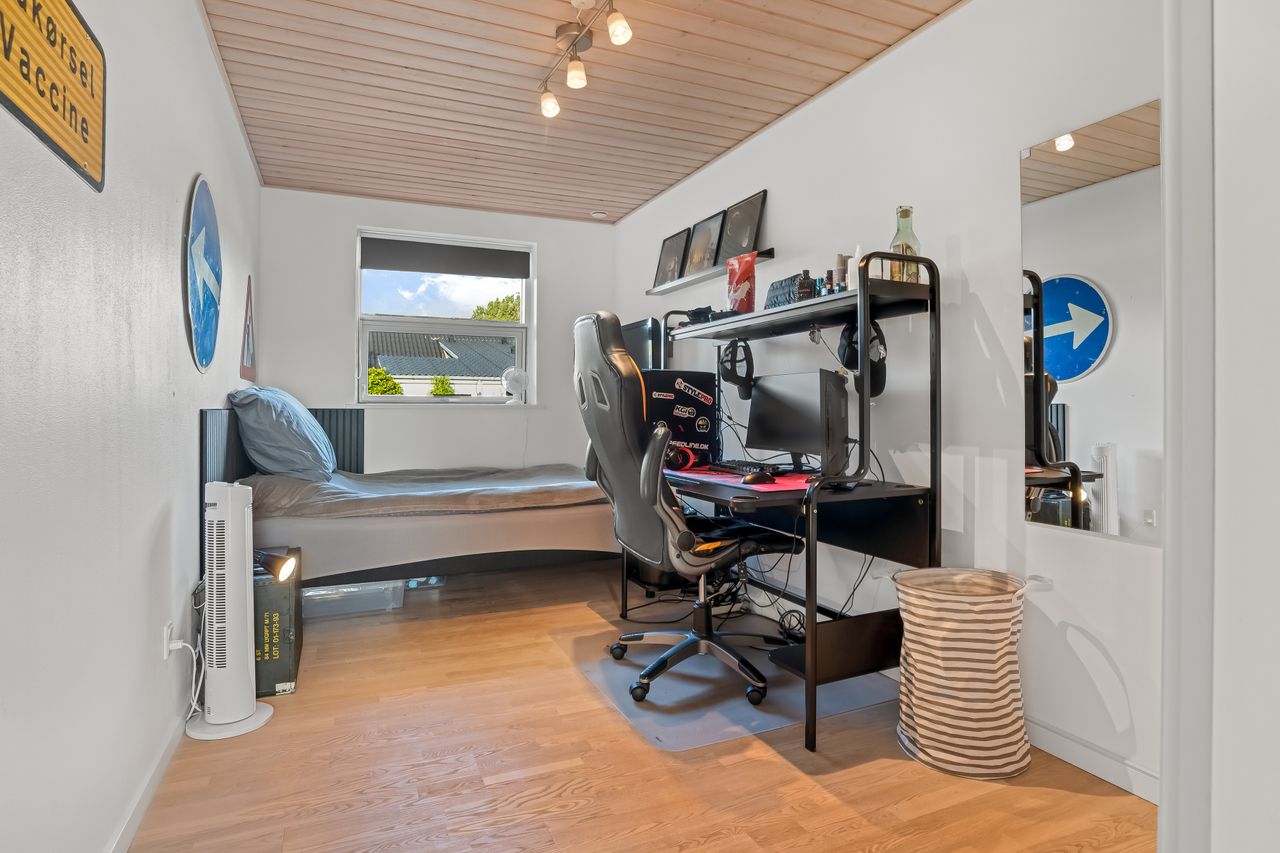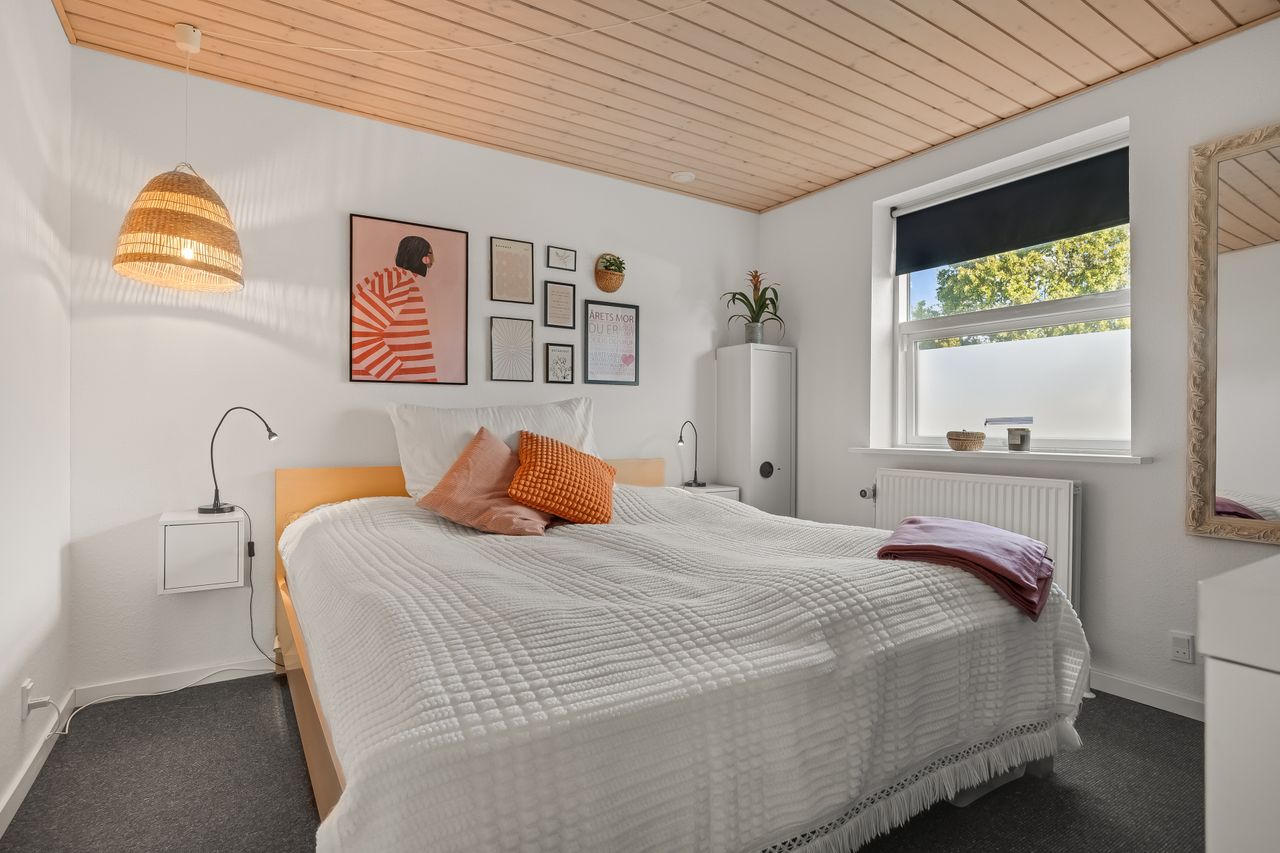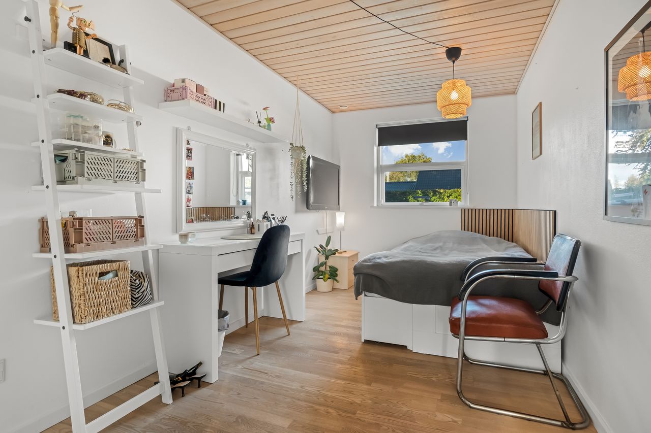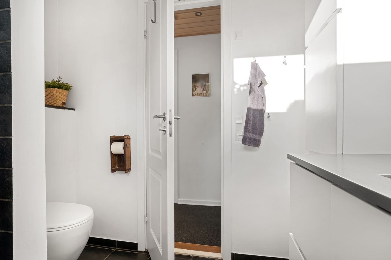 En fordelingsgang med udgang til indkørslen fører til et gæstetoilet, et nydeligt badeværelse i samme tidløse stil som køkken og bryggers samt tre værelser. Yderligere to værelser er placeret med adgang fra bryggerset, hvilket giver huset i alt fem værelser og gode muligheder for børnefamilien eller dem, der har behov for hjemmekontor.