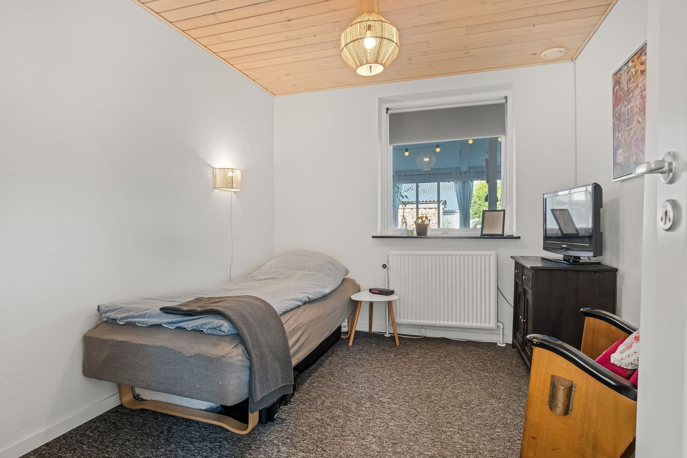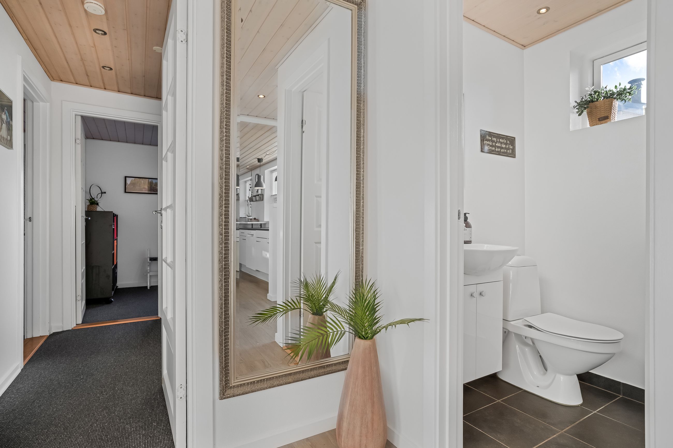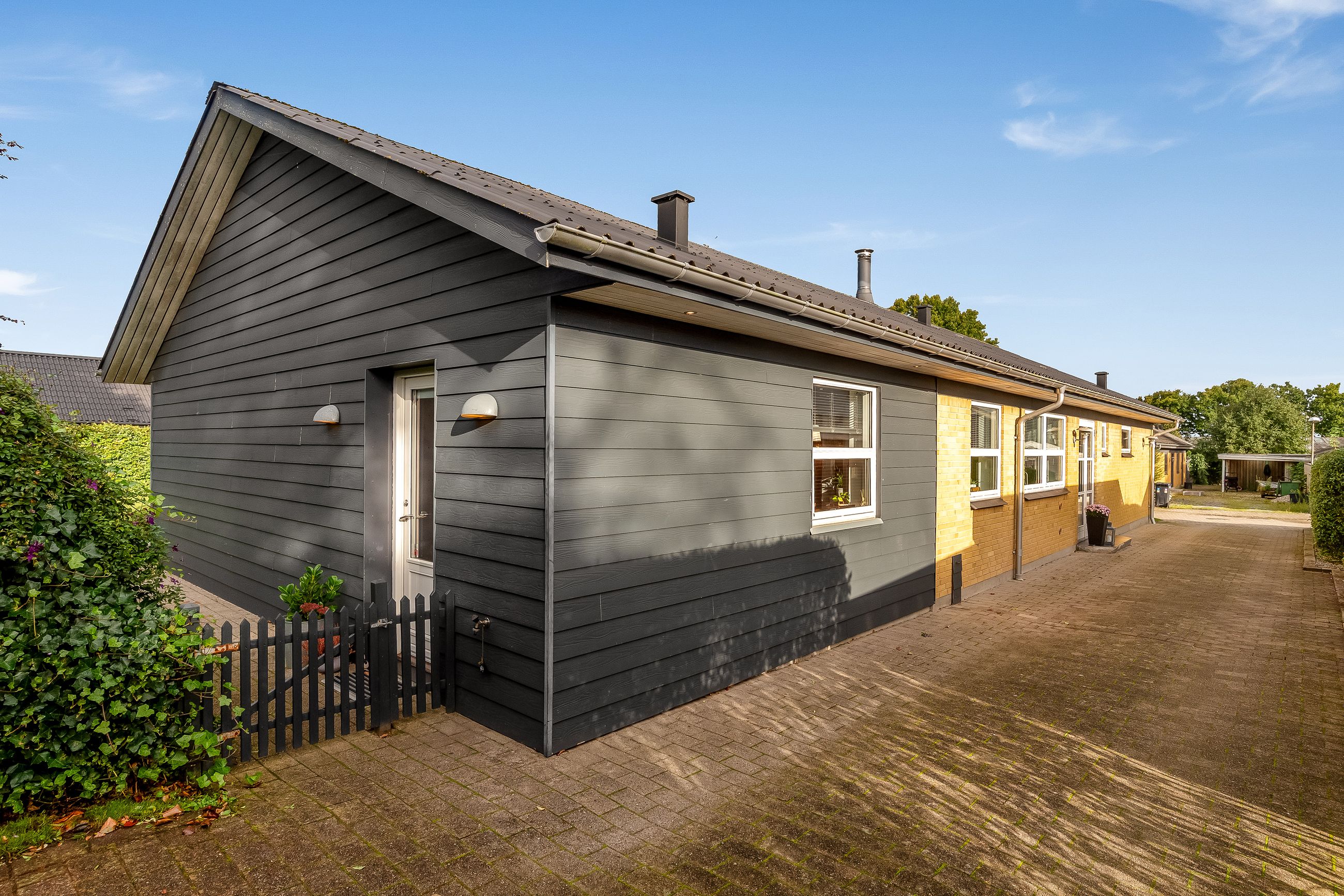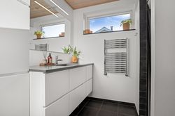 En fordelingsgang med udgang til indkørslen fører til et gæstetoilet, et nydeligt badeværelse i samme tidløse stil som køkken og bryggers samt tre værelser. Yderligere to værelser er placeret med adgang fra bryggerset, hvilket giver huset i alt fem værelser og gode muligheder for børnefamilien eller dem, der har behov for hjemmekontor.