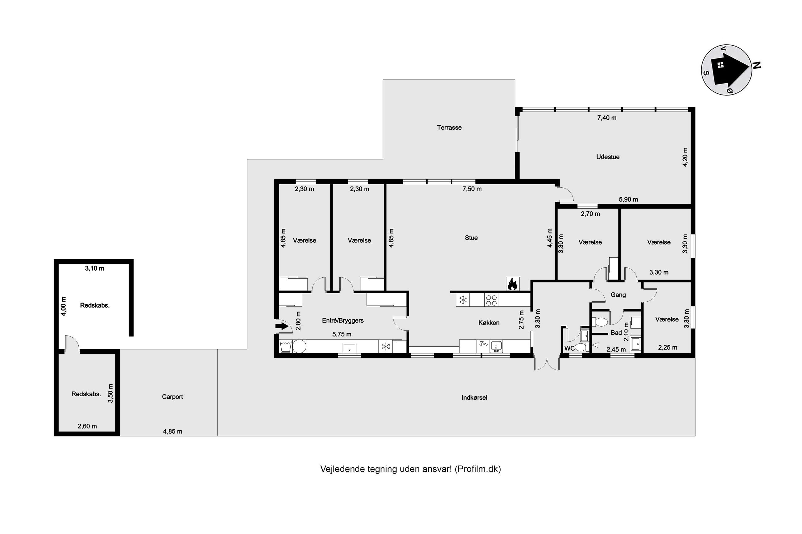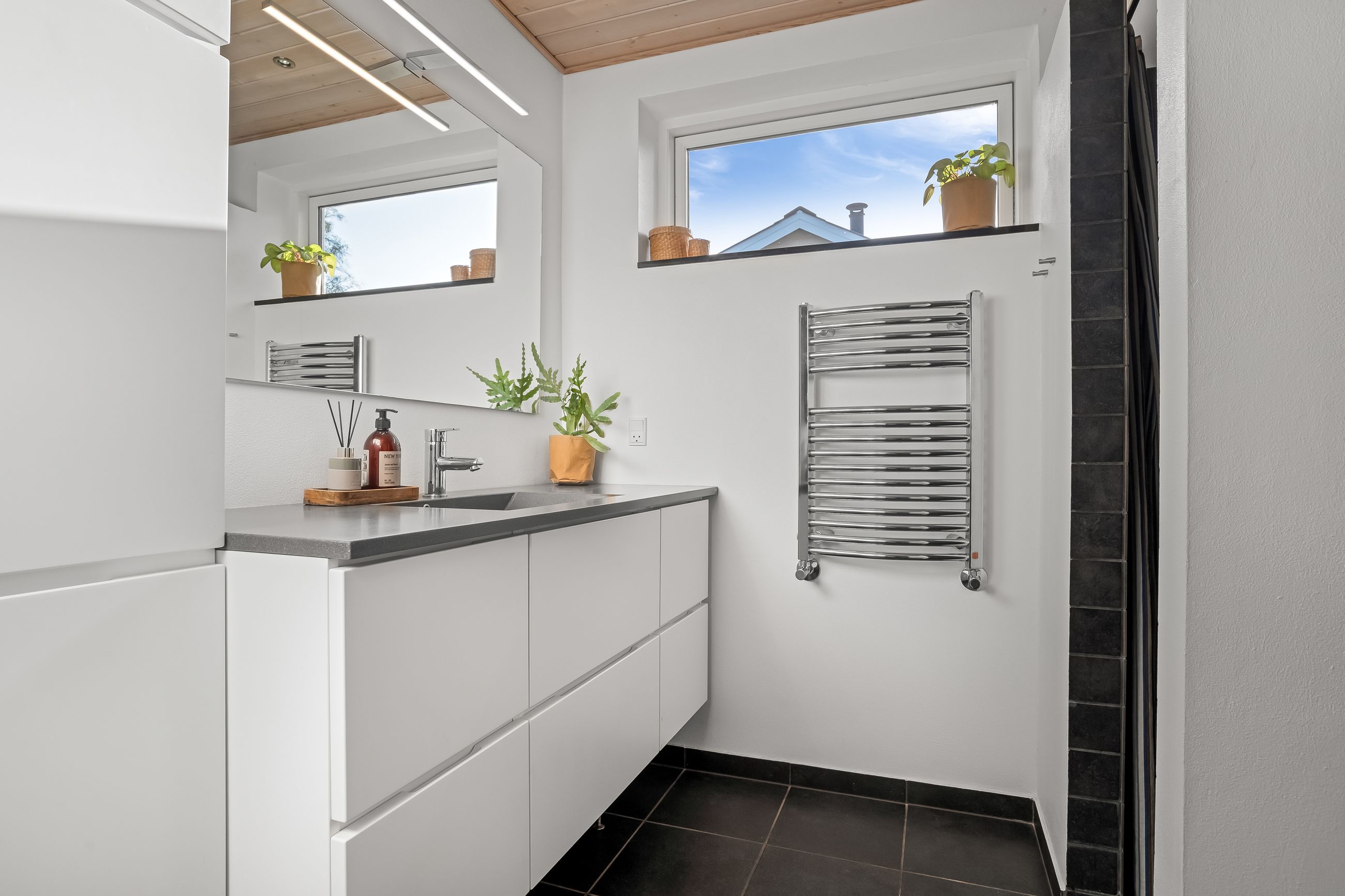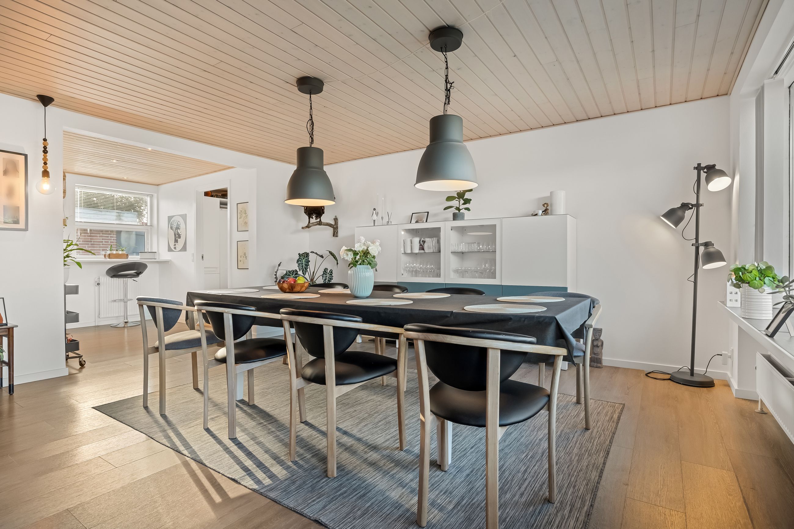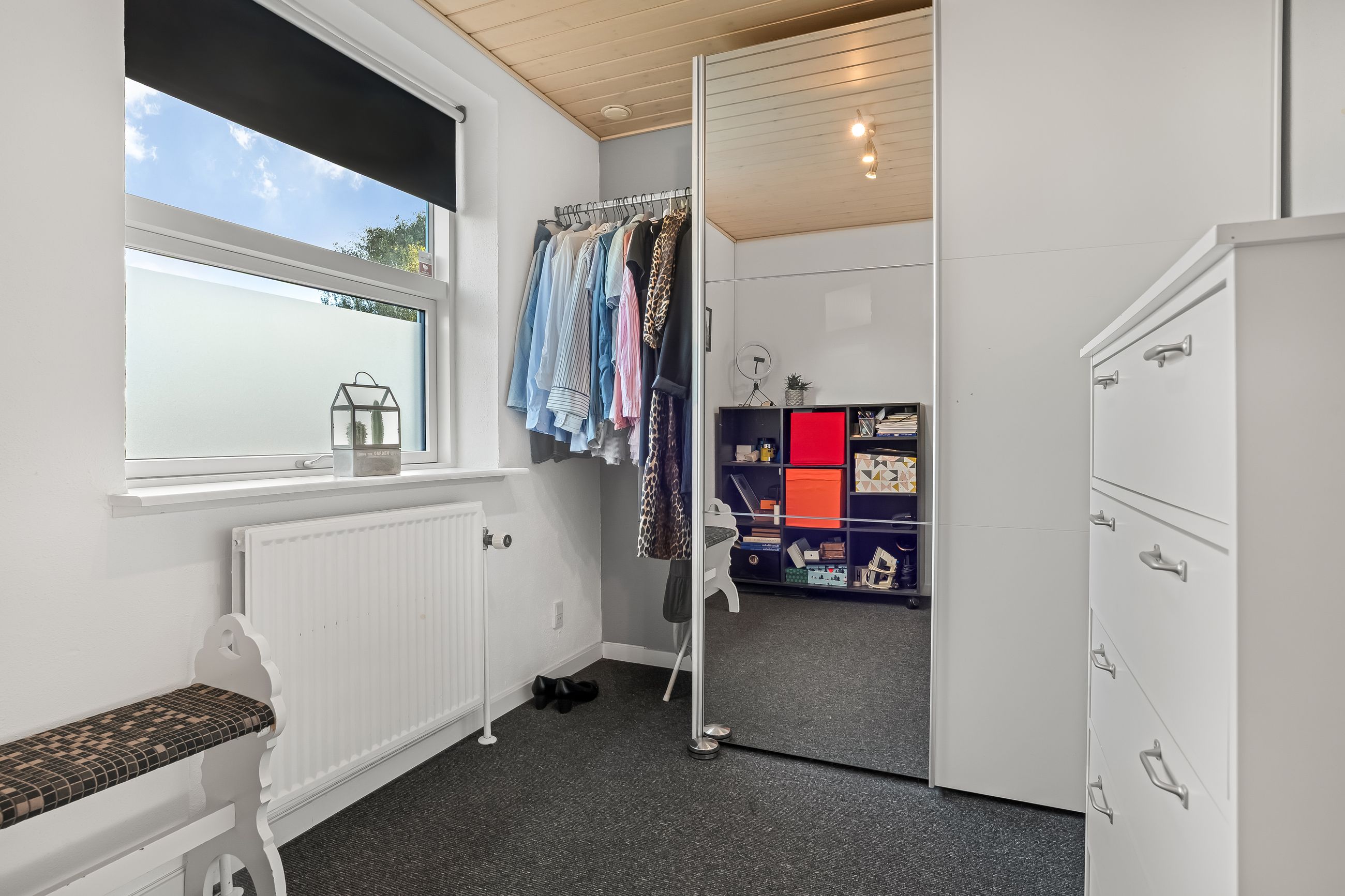 En fordelingsgang med udgang til indkørslen fører til et gæstetoilet, et nydeligt badeværelse i samme tidløse stil som køkken og bryggers samt tre værelser. Yderligere to værelser er placeret med adgang fra bryggerset, hvilket giver huset i alt fem værelser og gode muligheder for børnefamilien eller dem, der har behov for hjemmekontor.
