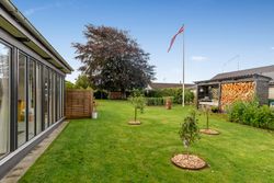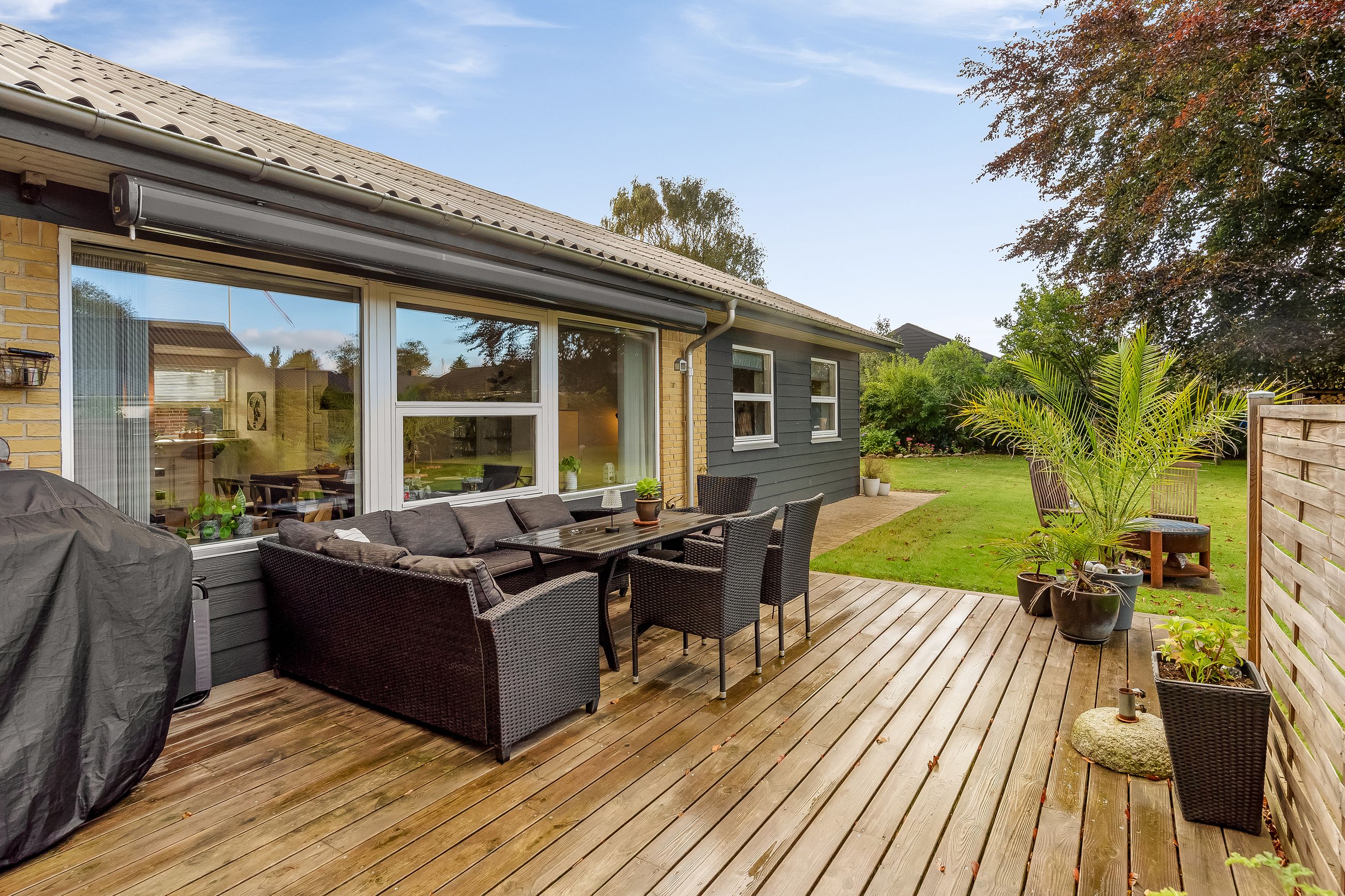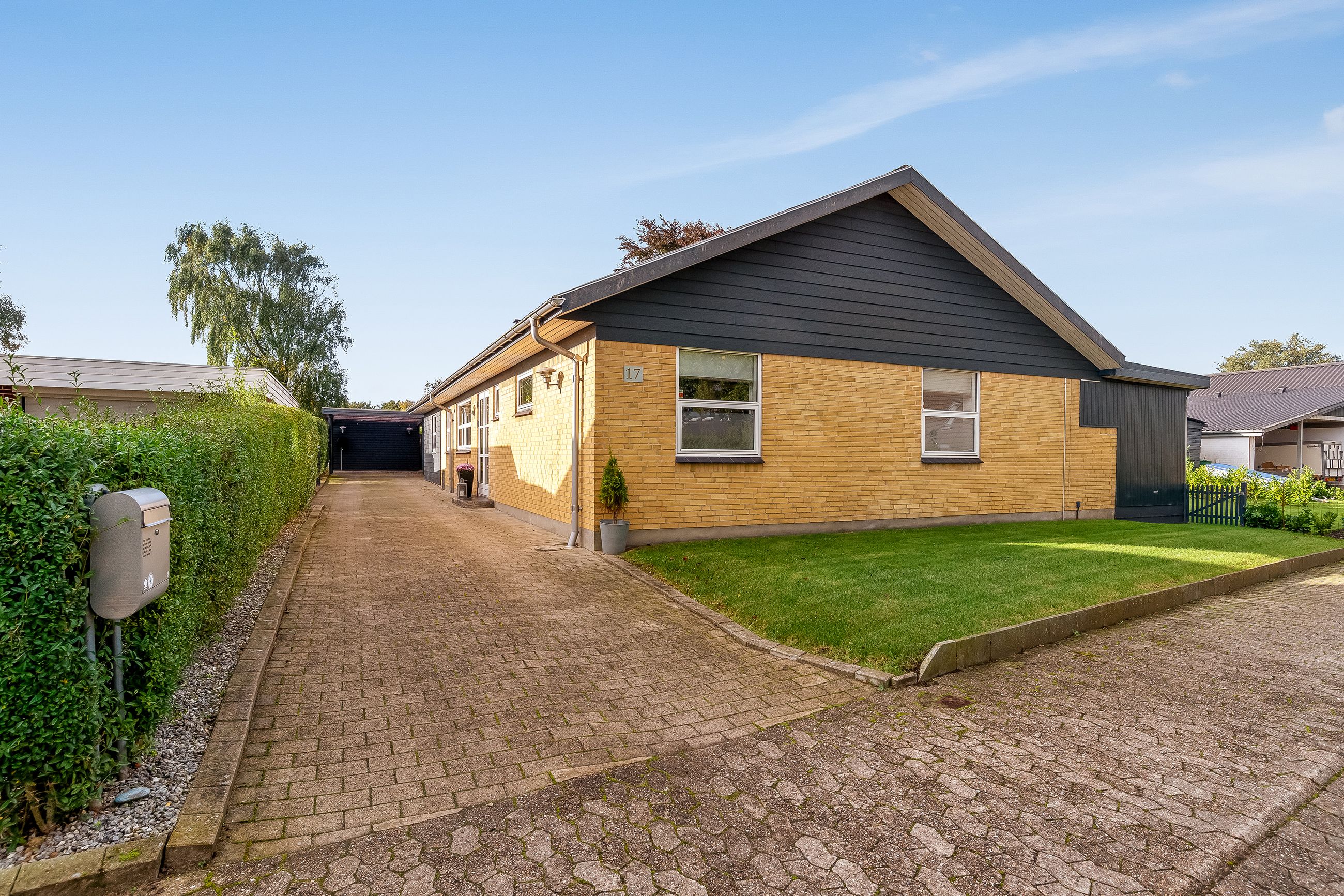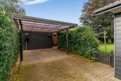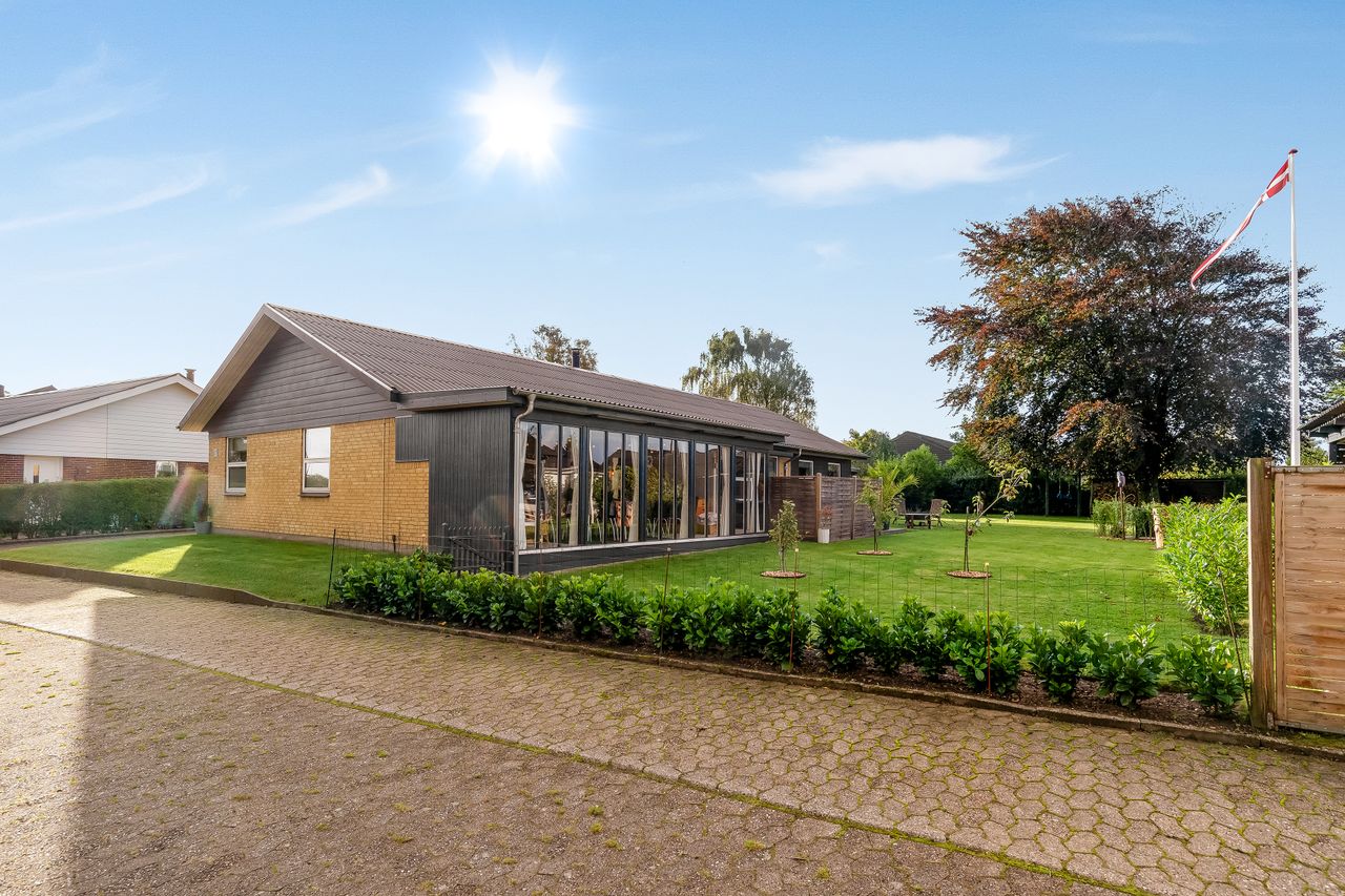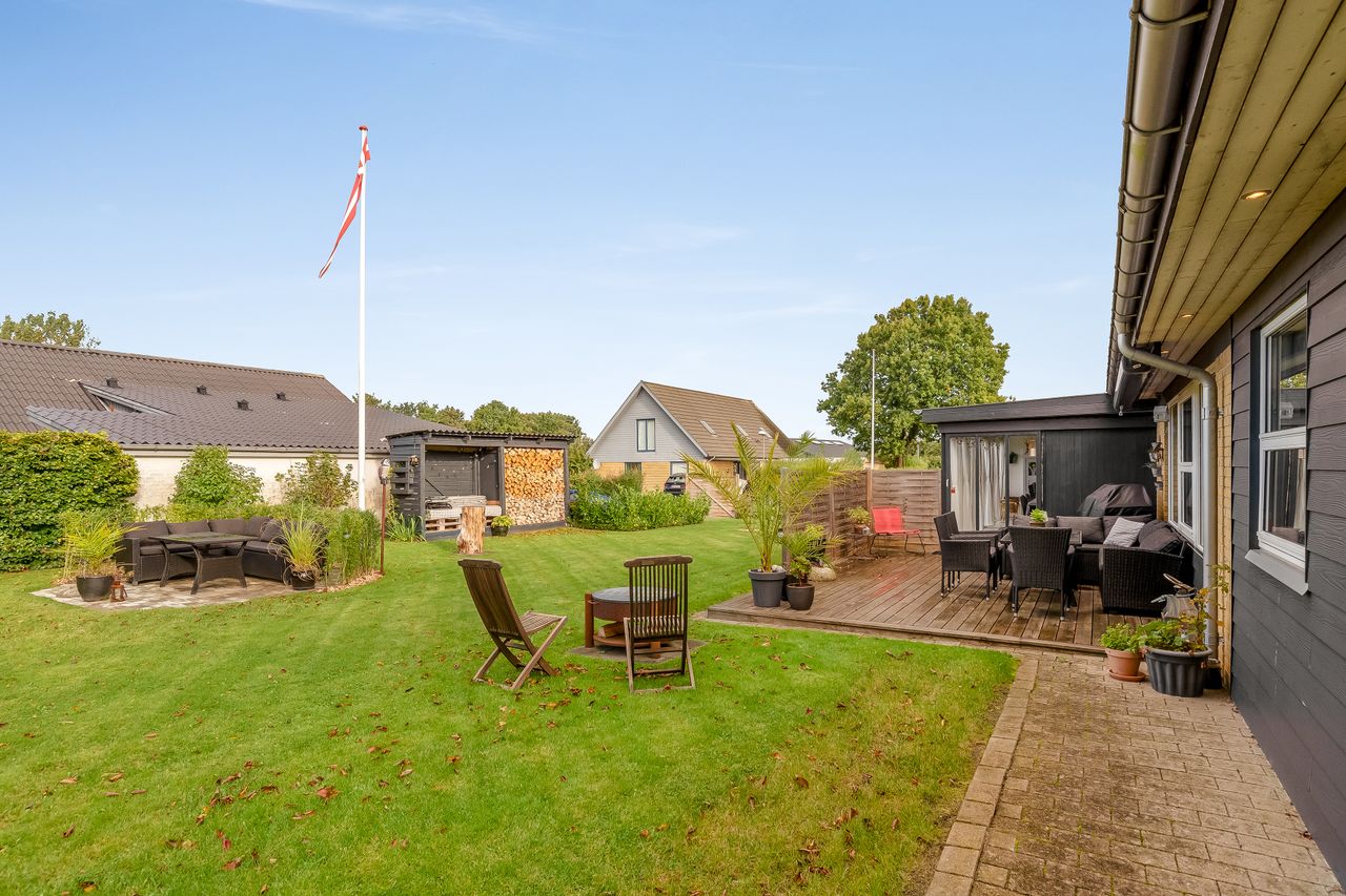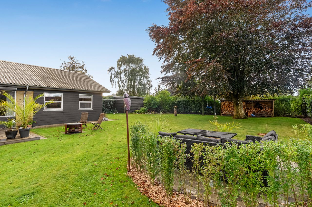 Haven er hyggeligt anlagt med flere kroge og varieret beplantning. Til ejendommen hører carport i forlængelse af indkørslen med installeret ladestander samt redskabsskur.