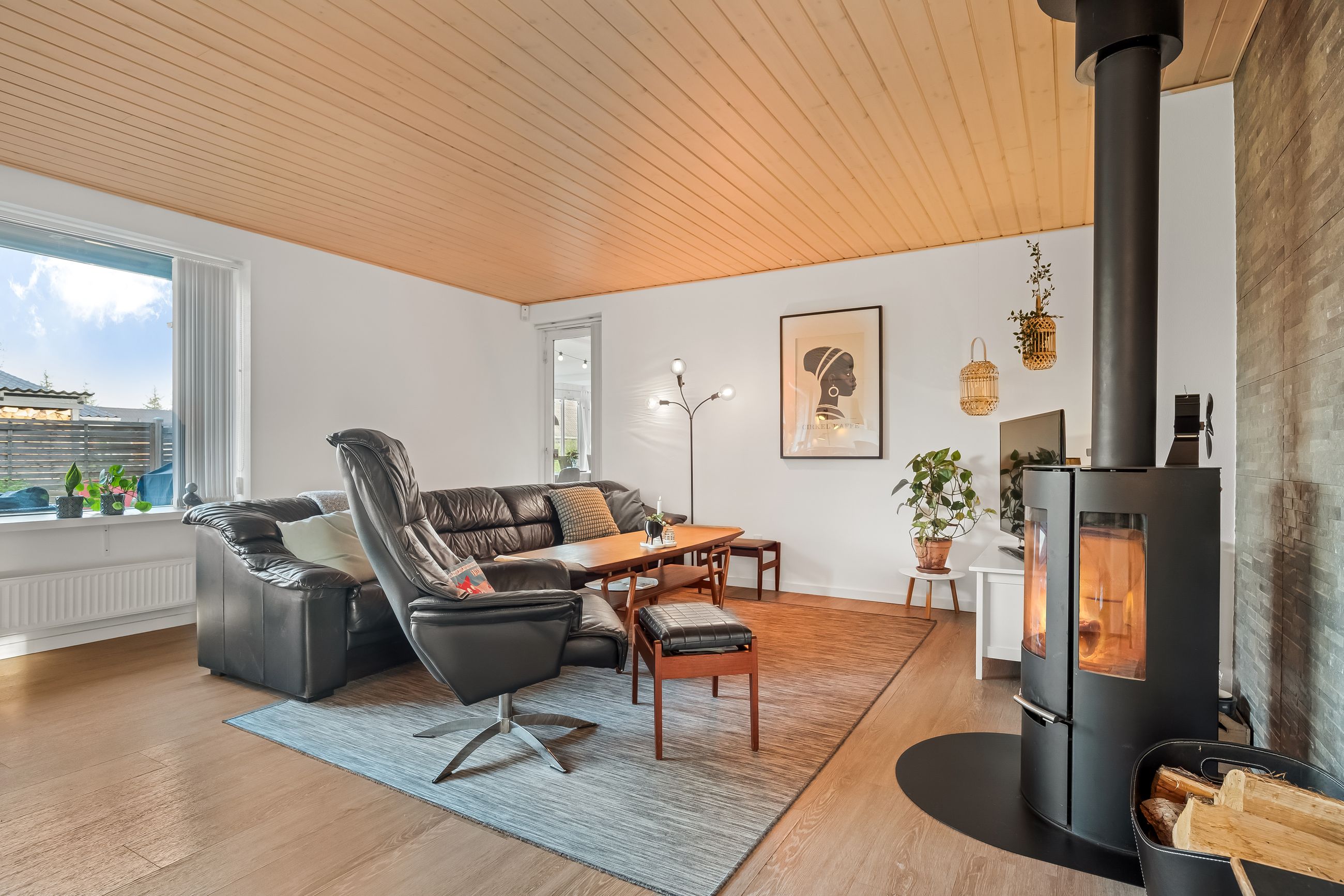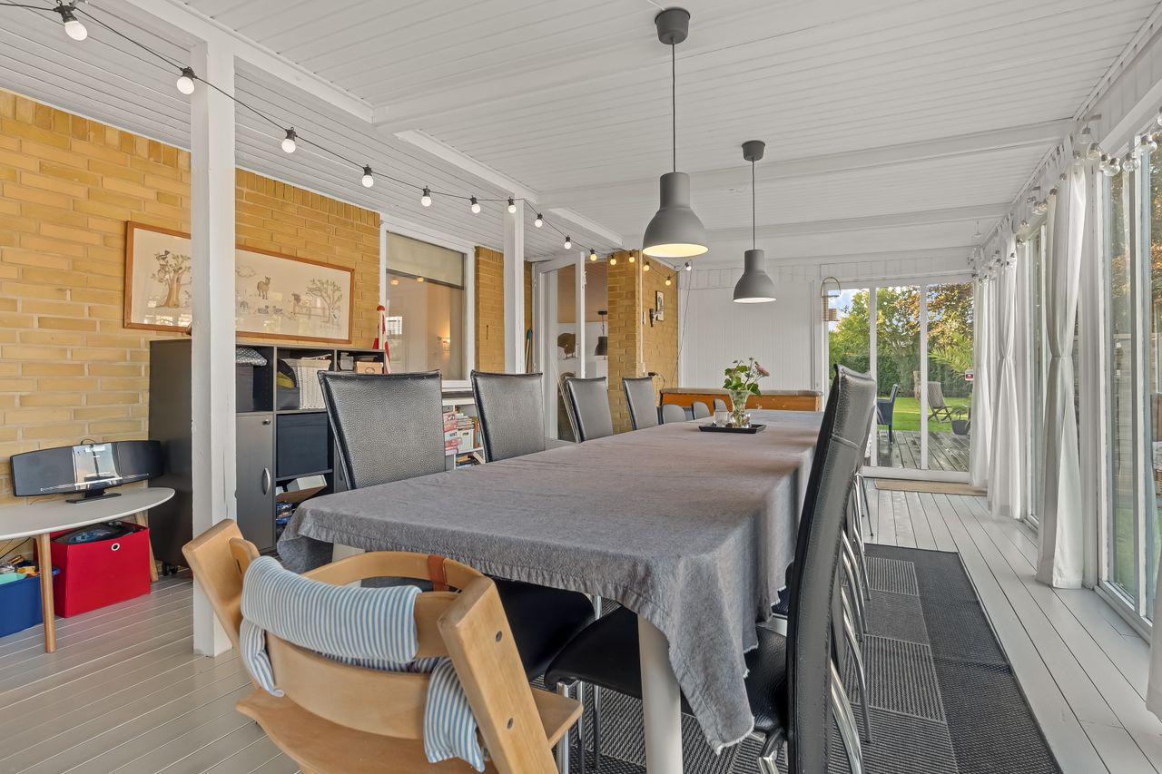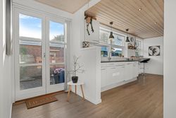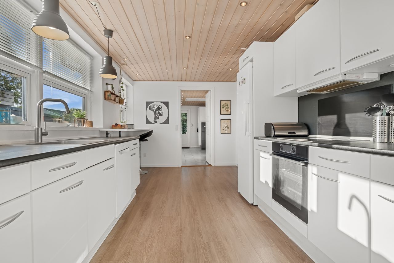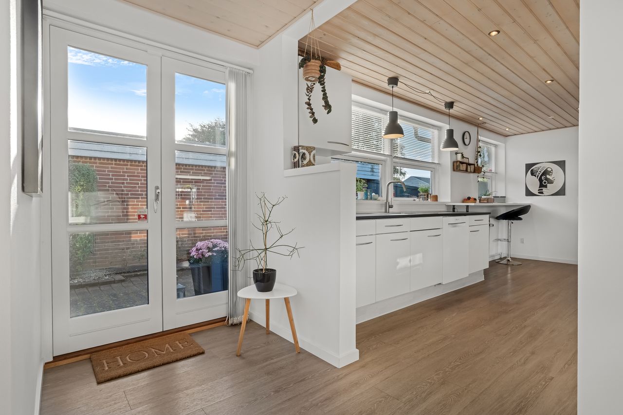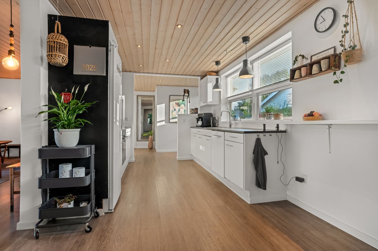 Boligen fremstår indbydende og funktionelt indrettet med entré/bryggers med lyst inventar, vaskefaciliteter og god opbevaringsplads. Herfra er der adgang til køkkenet, der ligger i delvis åben forbindelse med stuen. Stuen har en hyggelig brændeovn og udgang til en stor udestue, som giver direkte adgang til den sydvestvendte terrasse – perfekt til at nyde aftensolen.