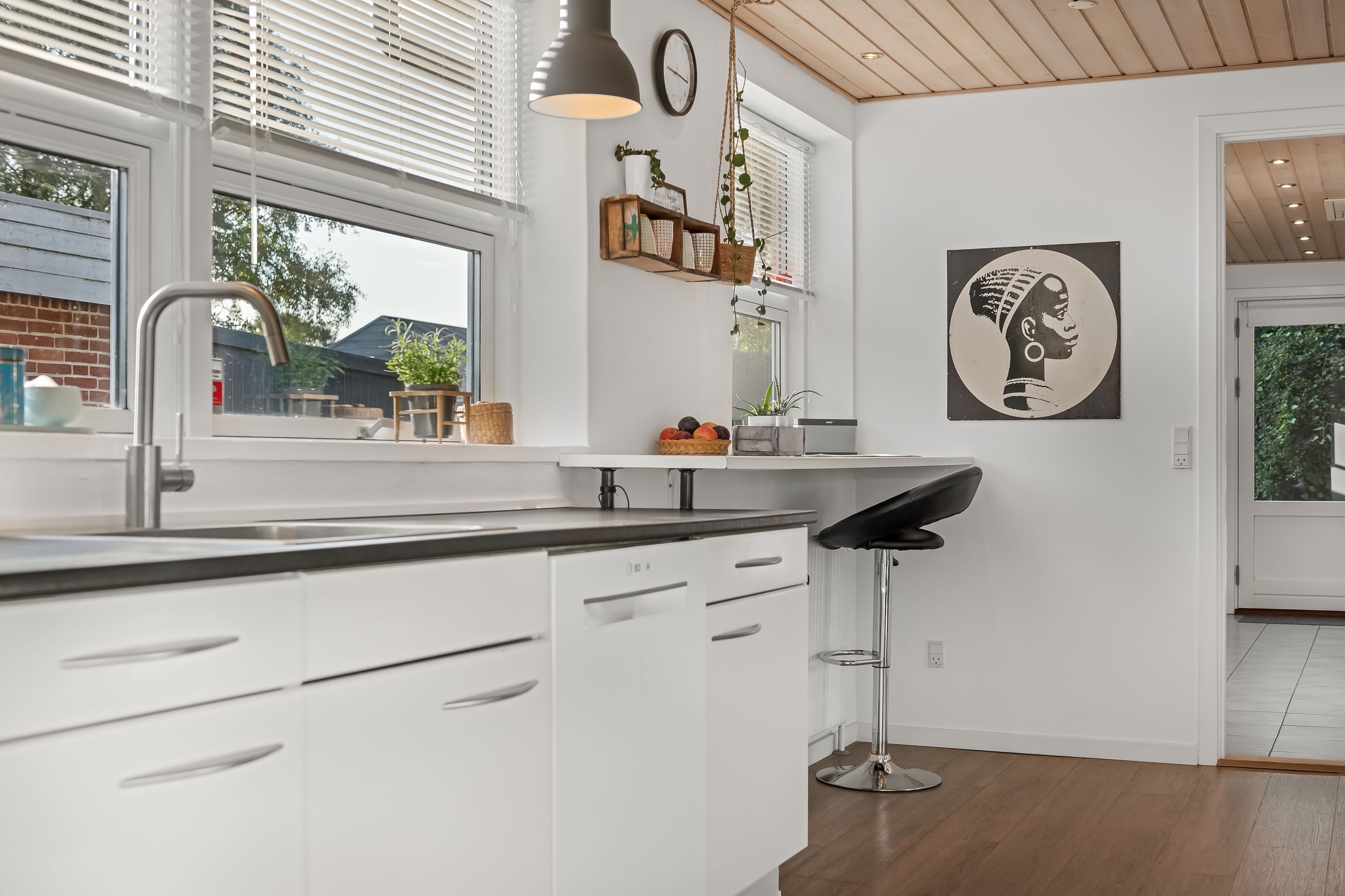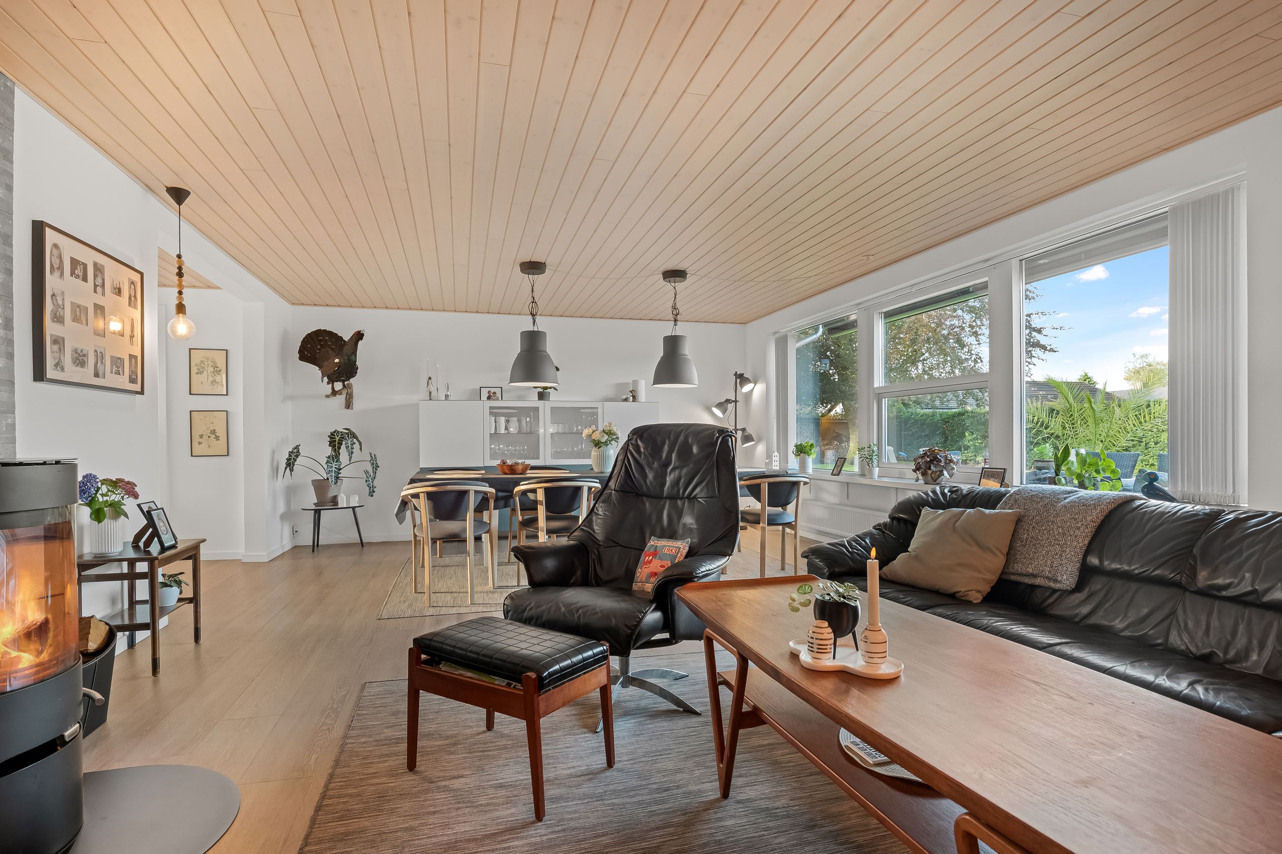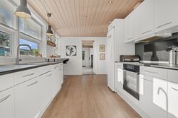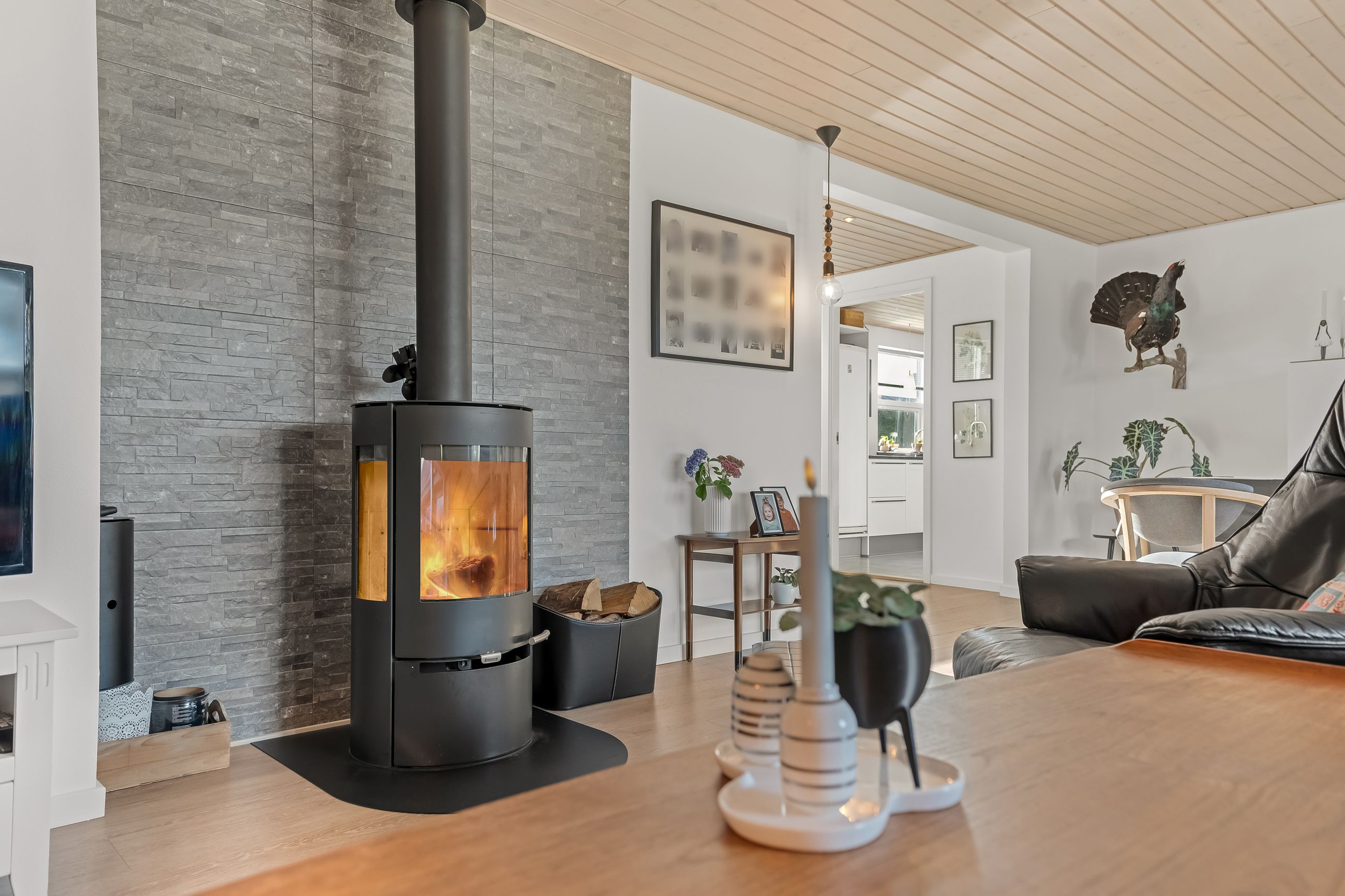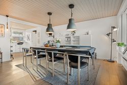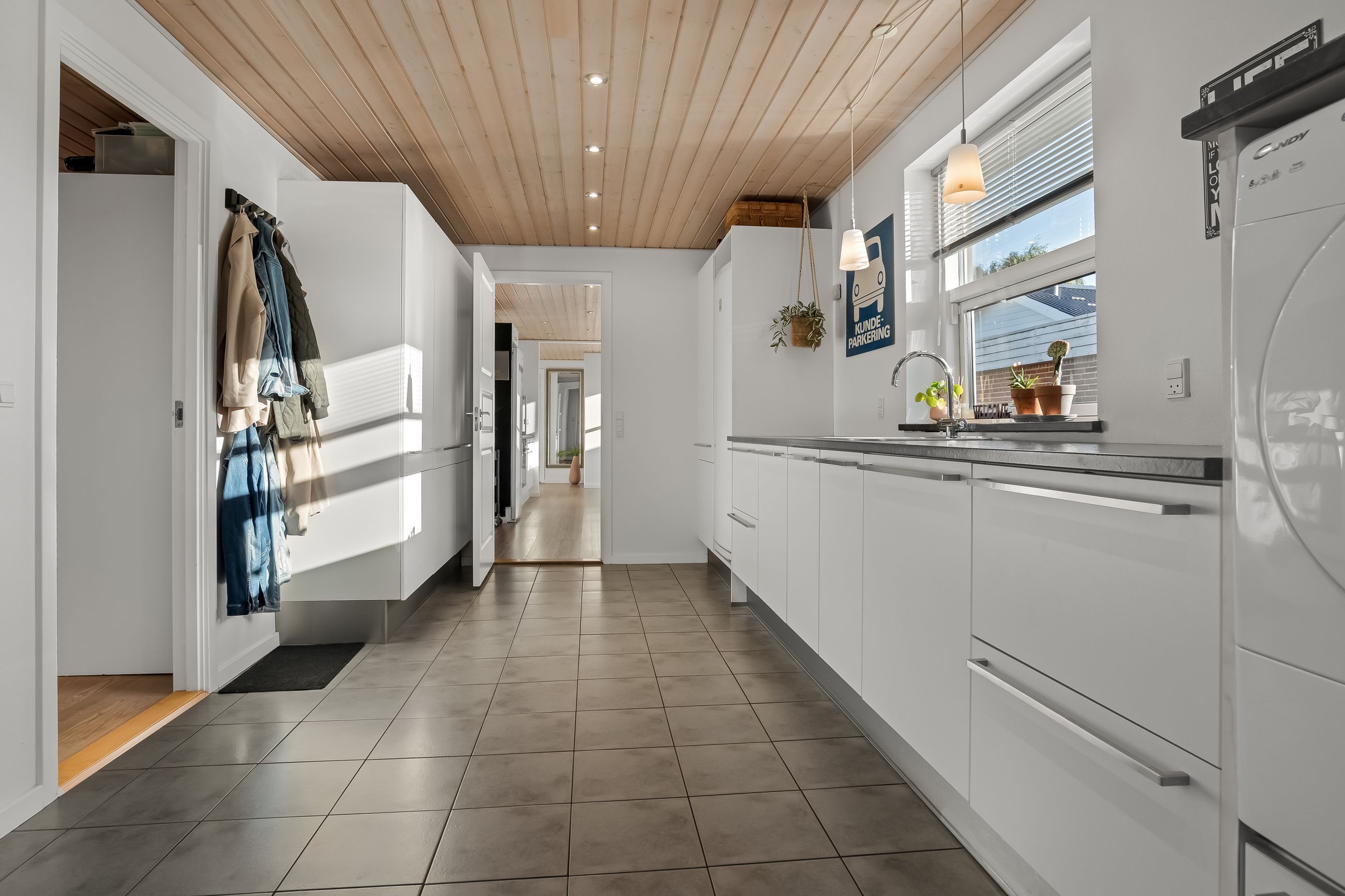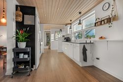 Boligen fremstår indbydende og funktionelt indrettet med entré/bryggers med lyst inventar, vaskefaciliteter og god opbevaringsplads. Herfra er der adgang til køkkenet, der ligger i delvis åben forbindelse med stuen. Stuen har en hyggelig brændeovn og udgang til en stor udestue, som giver direkte adgang til den sydvestvendte terrasse – perfekt til at nyde aftensolen.