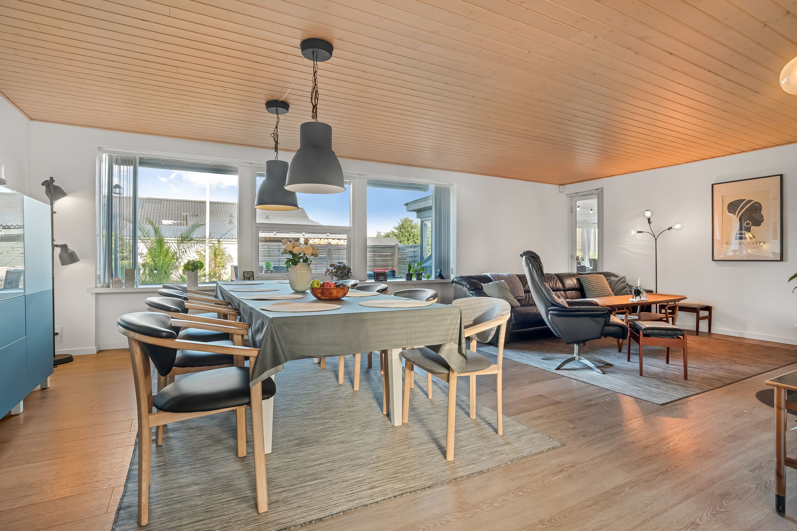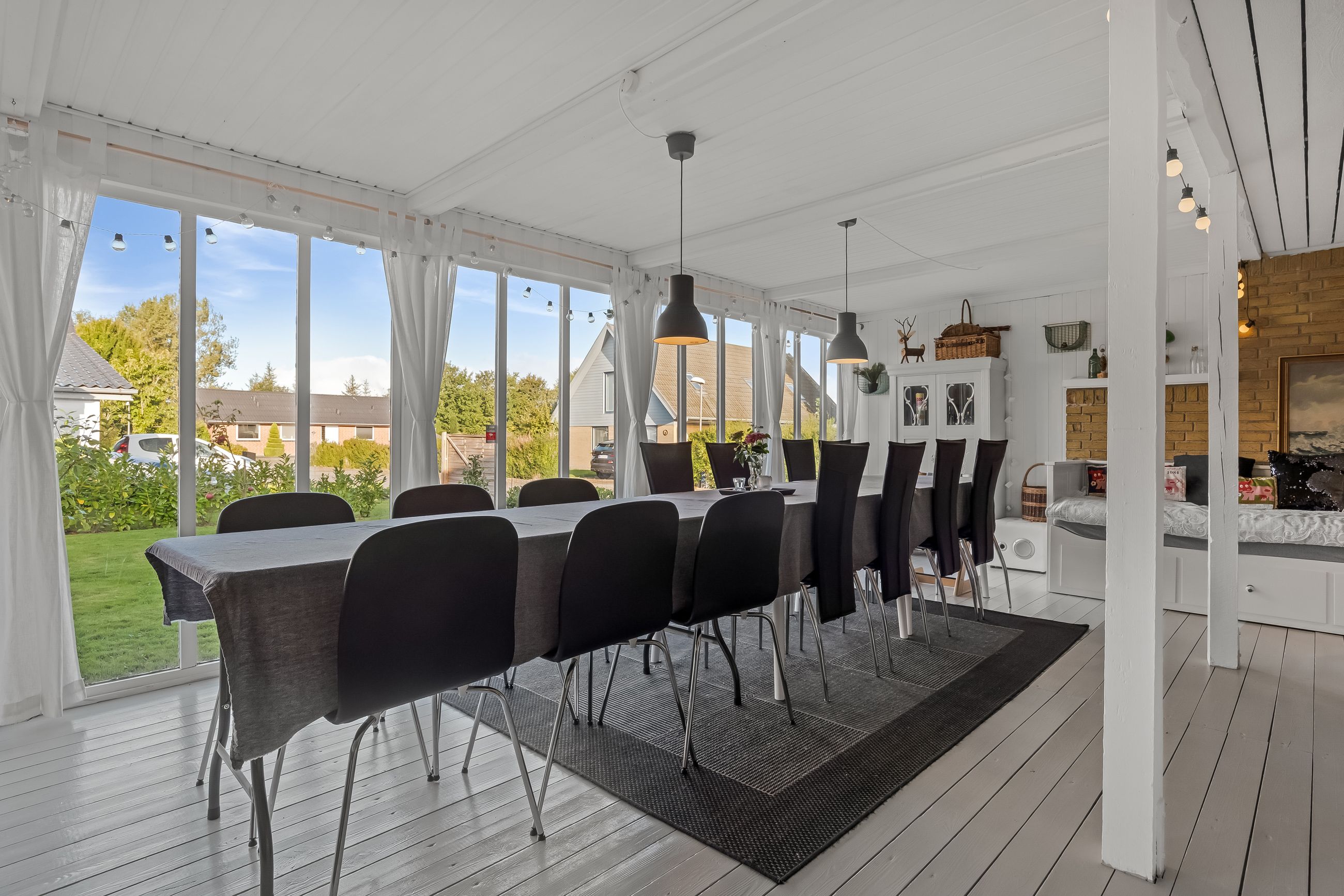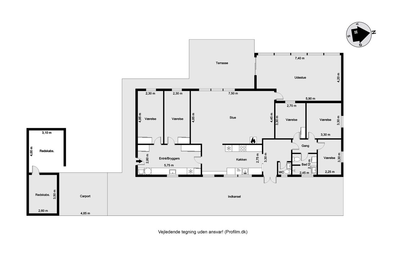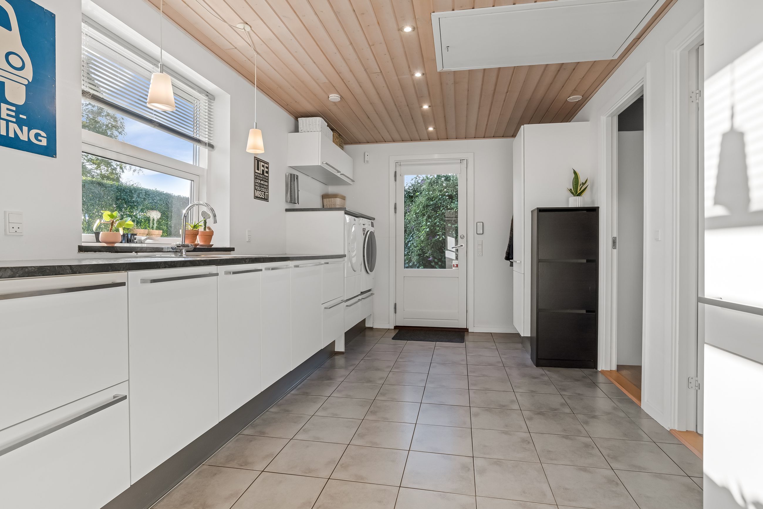 Boligen fremstår indbydende og funktionelt indrettet med entré/bryggers med lyst inventar, vaskefaciliteter og god opbevaringsplads. Herfra er der adgang til køkkenet, der ligger i delvis åben forbindelse med stuen. Stuen har en hyggelig brændeovn og udgang til en stor udestue, som giver direkte adgang til den sydvestvendte terrasse – perfekt til at nyde aftensolen.
