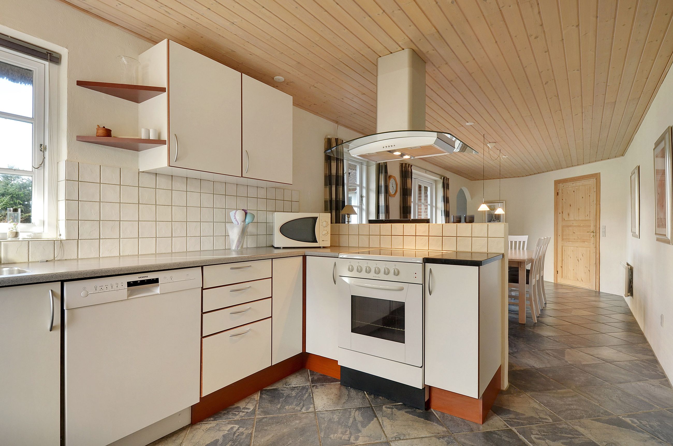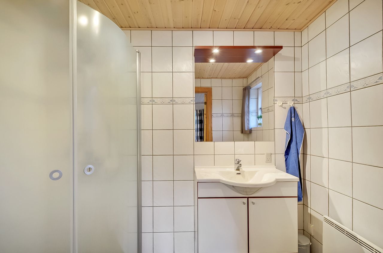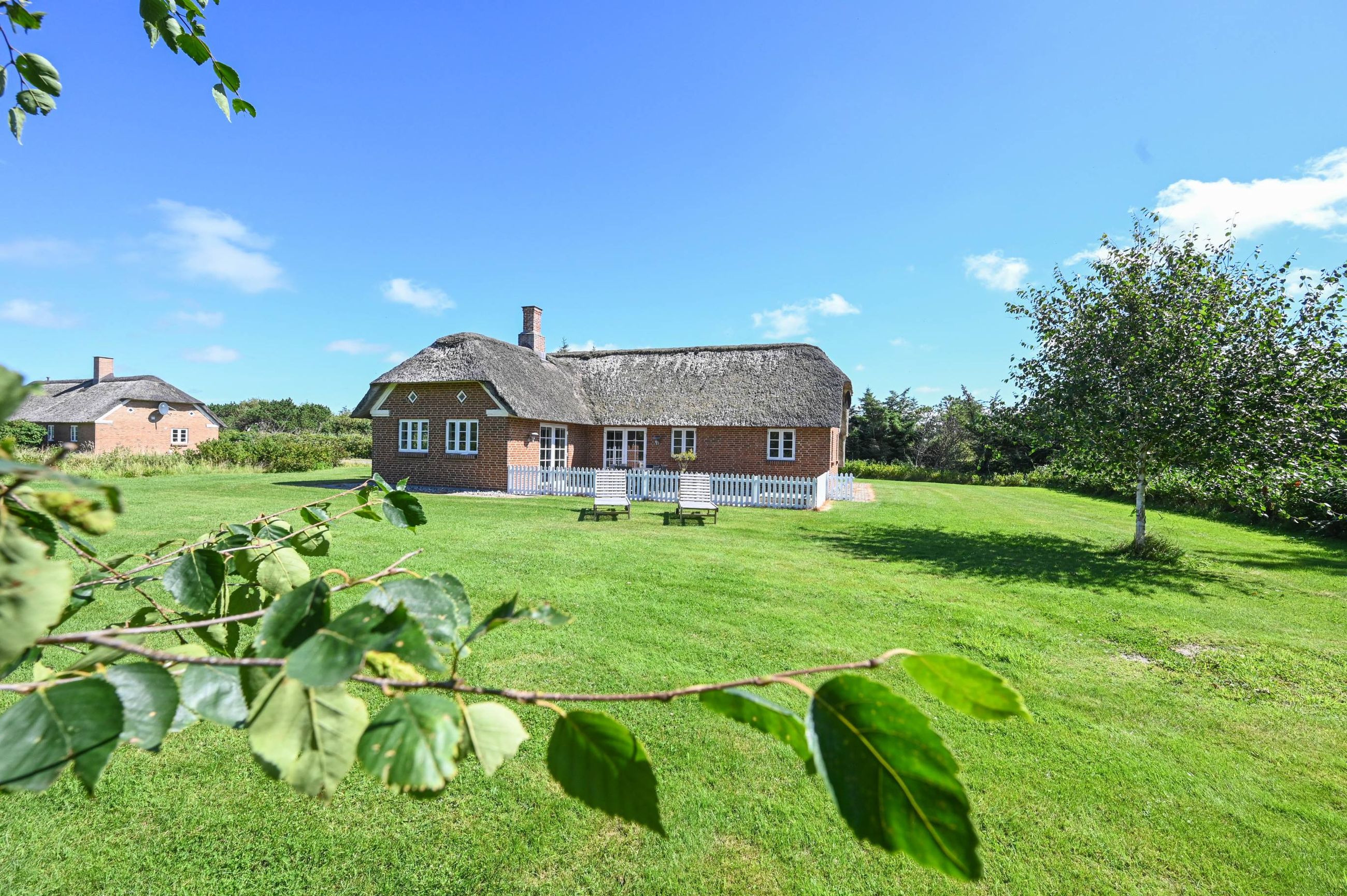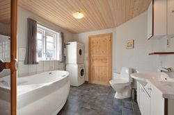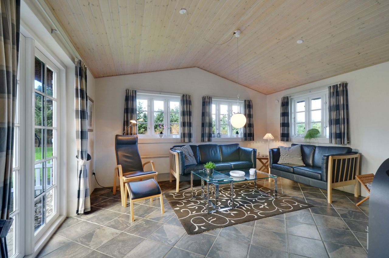 Selve huset, opført i mursten med stråtag, rummer pænt køkken med spiseplads. Herfra er der udgang til den gode terrasse. God opholdsstue med brændeovn og ligeledes med udgang til terrassen. 3 gode værelser, hvoraf det ene har direkte adgang til badeværelse. Ekstra badeværelse med sauna, spa og vaskesøjle. Entré med varmepumpe. Der er tilhørende integreret udhus med plads til bl.a. grill, haveredskaber mv. Et rigtig godt hus, som er velegnet til såvel eget brug som udlejning.