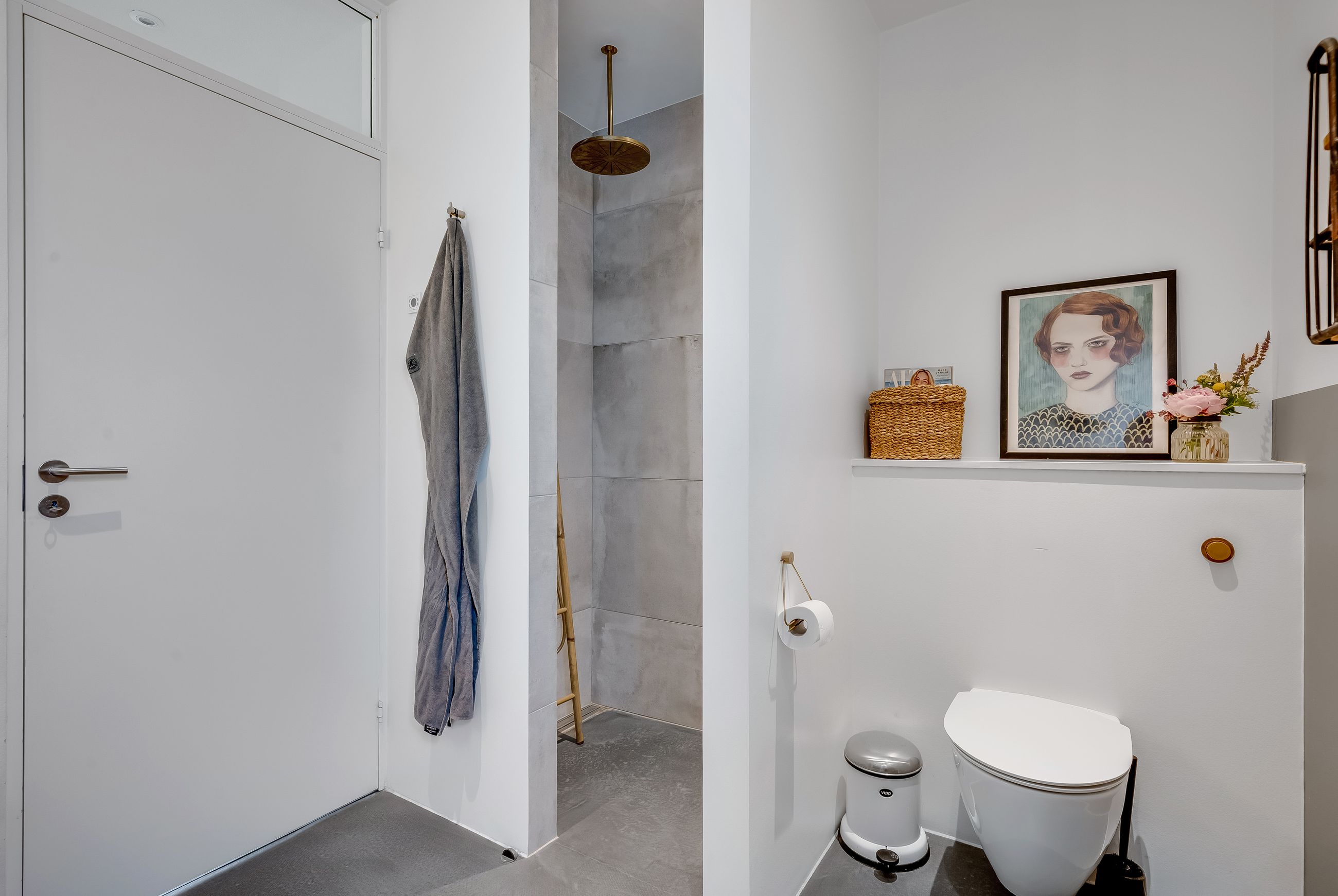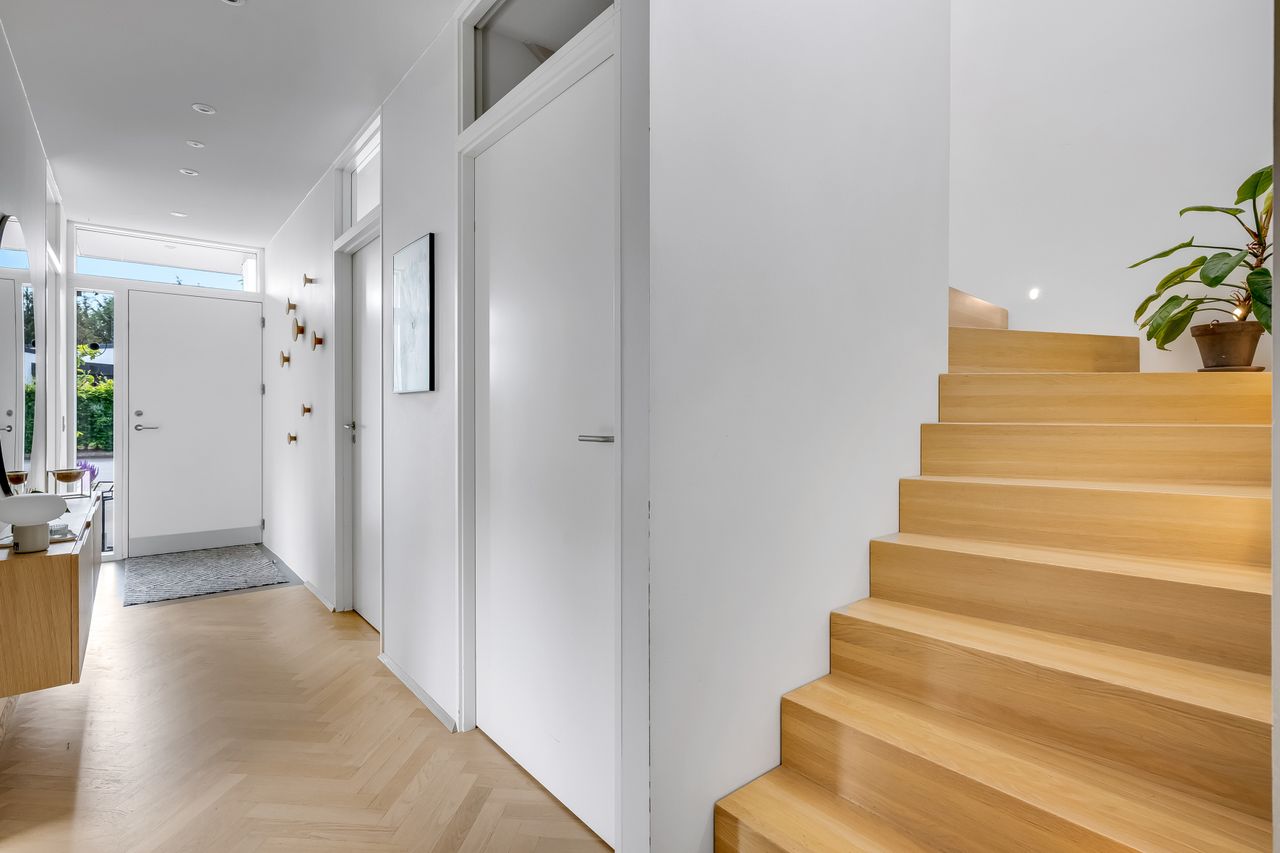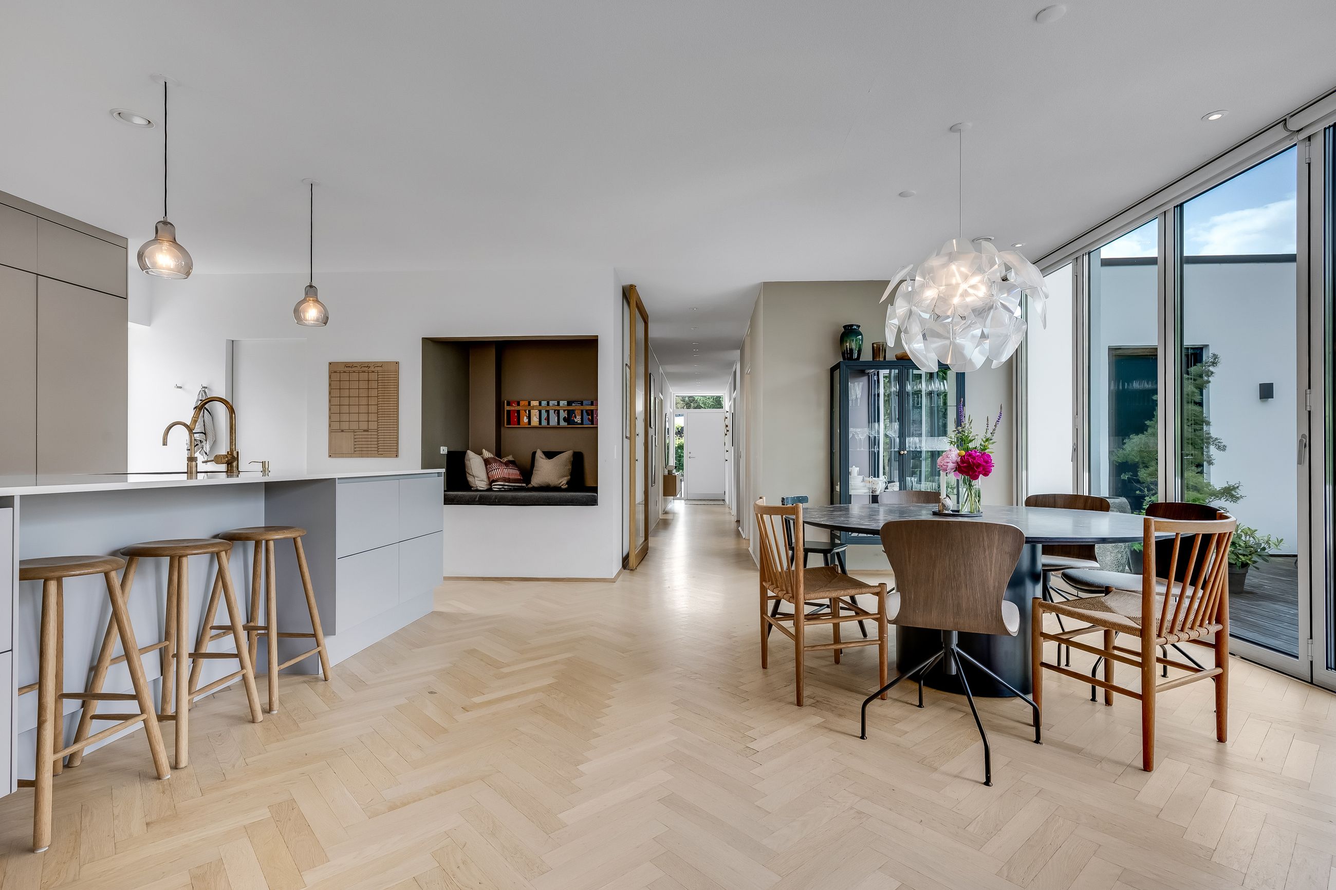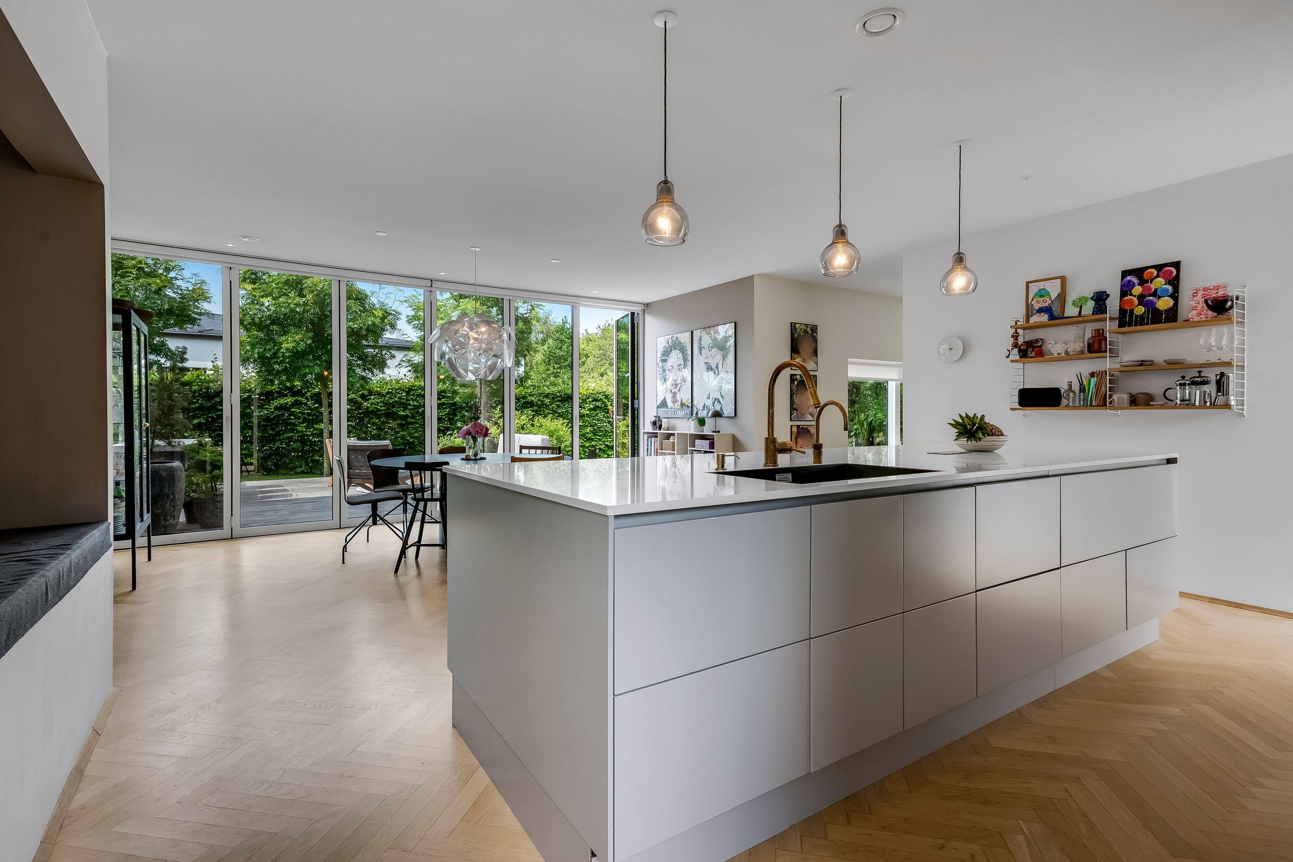 Ejendommen fremstår med et strømlinet og velgennemtænkt udtryk – både ude og inde. Her er der virkelig kræset for detaljerne, og materialevalget emmer af kvalitet og æstetik.