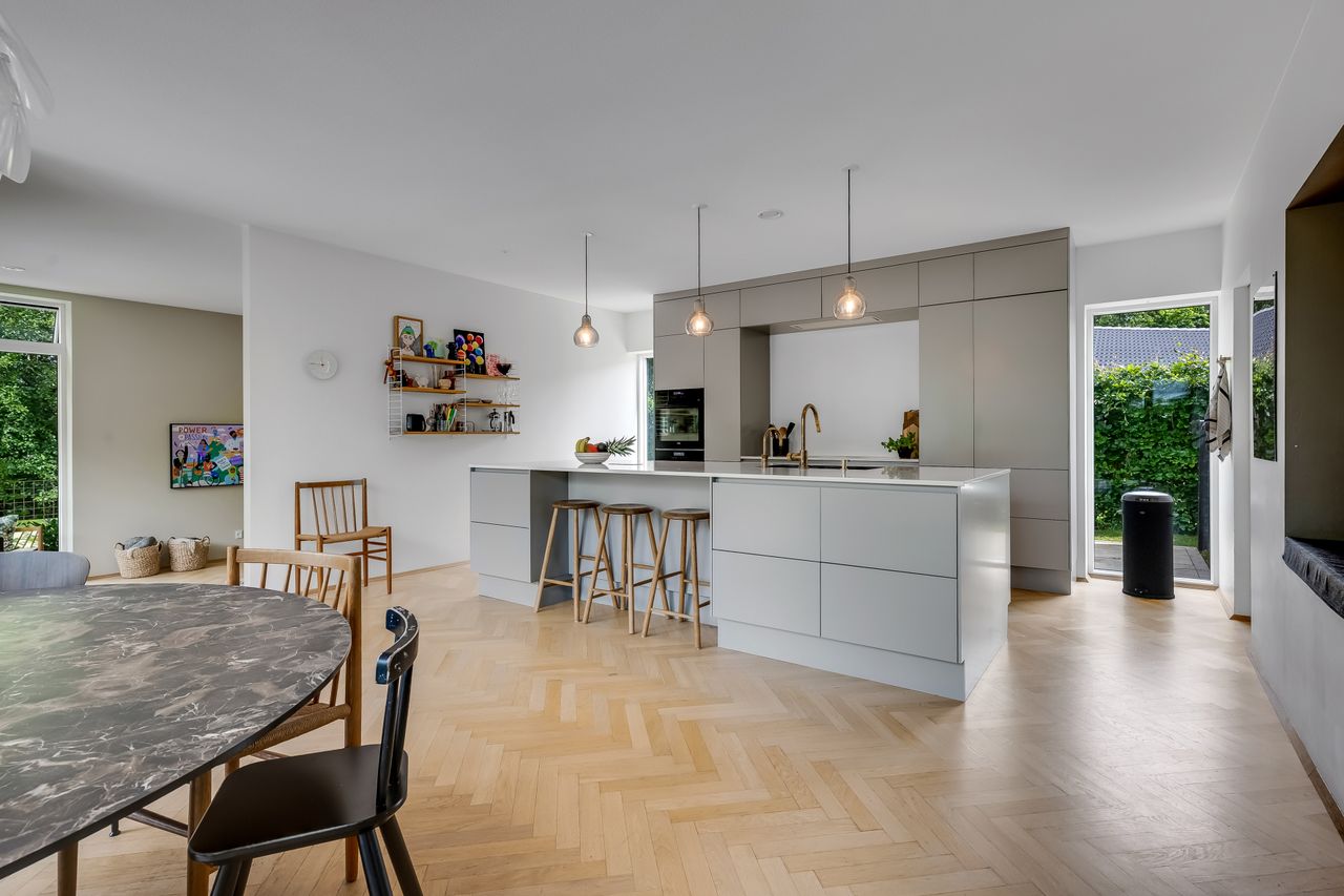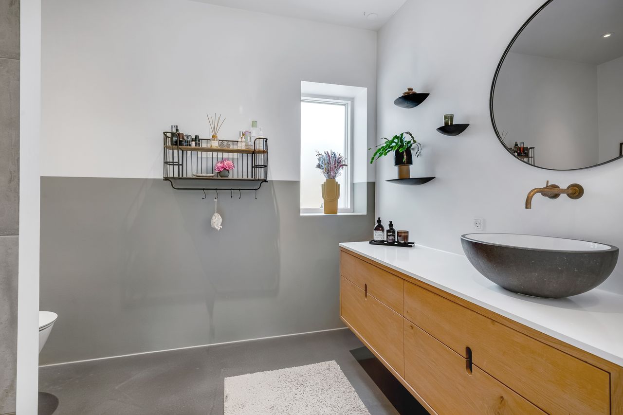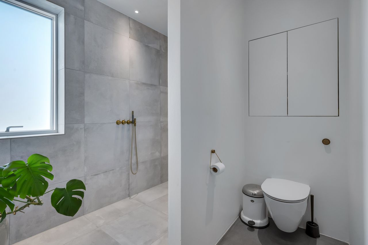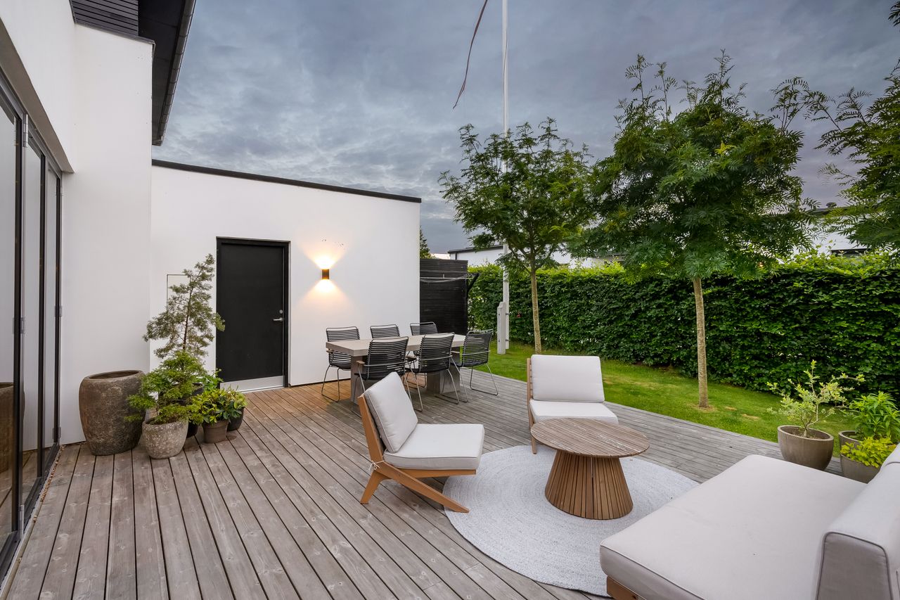 Ejendommen fremstår med et strømlinet og velgennemtænkt udtryk – både ude og inde. Her er der virkelig kræset for detaljerne, og materialevalget emmer af kvalitet og æstetik.