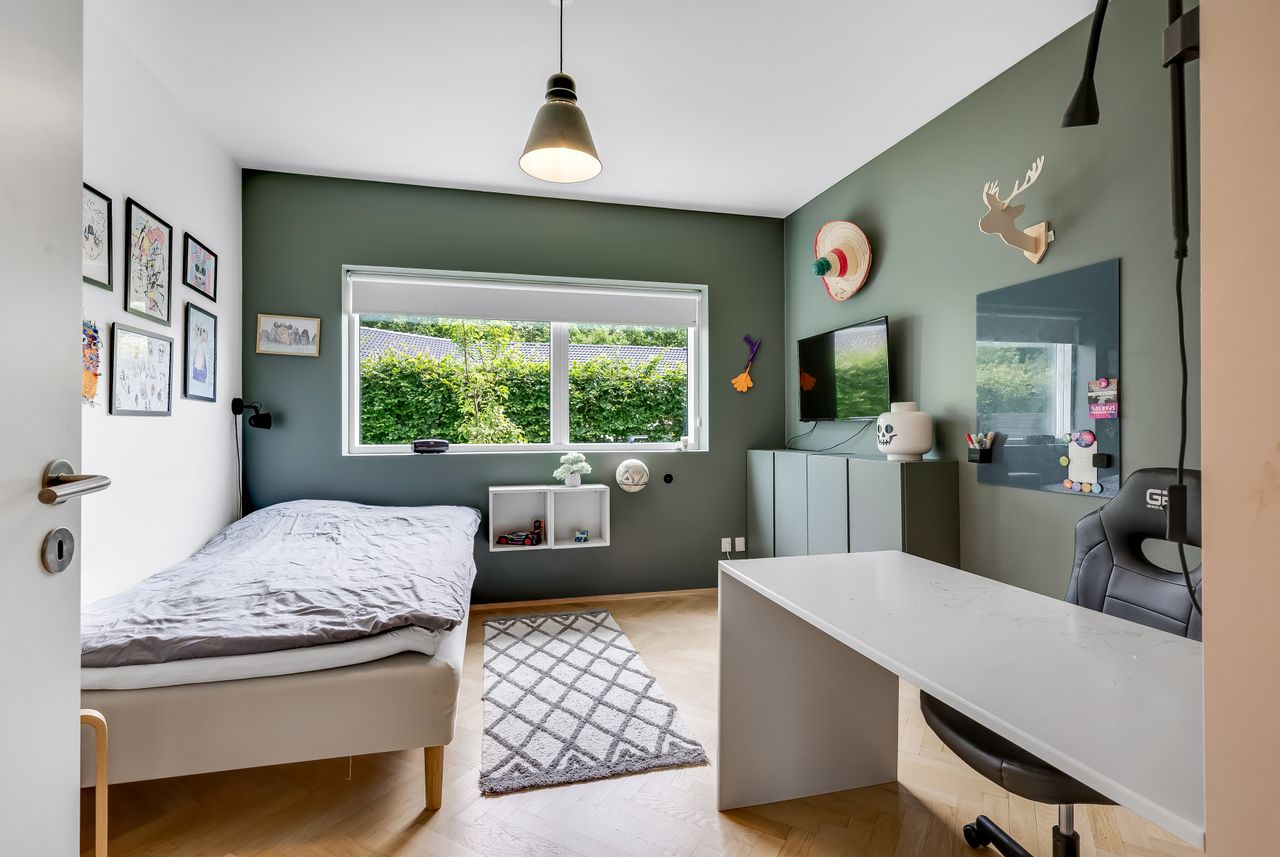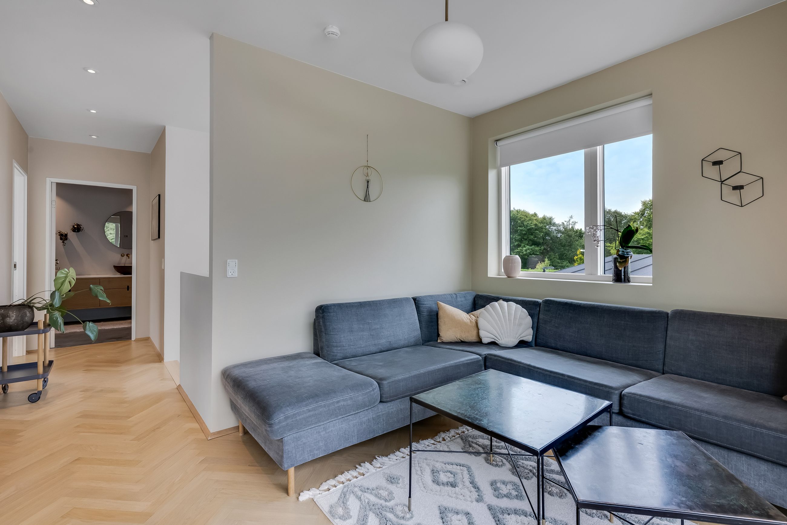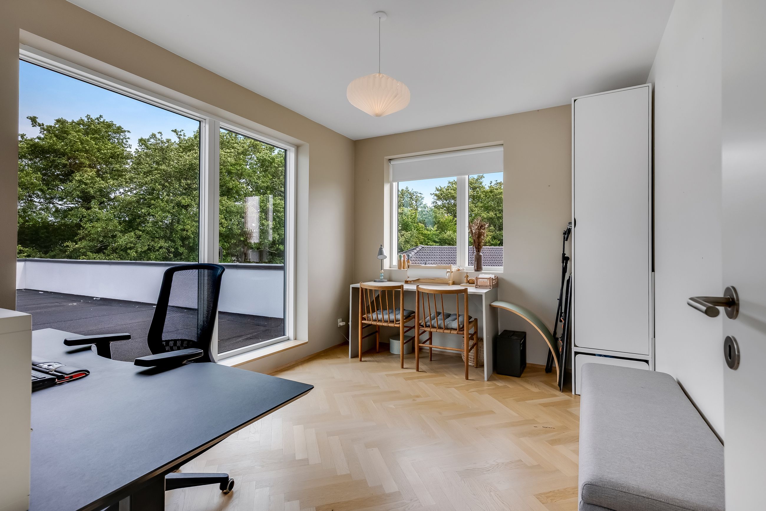 På første sal byder boligen på et rummeligt repos med mange anvendelsesmuligheder – her kan let indrettes en ekstra stue, kontor eller hobbyrum. Der er forberedt til etablering af en tagterrasse, hvilket vil give et fantastisk uderum med udsigt over området. Forældreafdelingen rummer et dejligt soveværelse med walk-in-closet samt eget badeværelse med både bruseniche og badekar – ligeledes med snedkerlavet inventar i Dinesen. Et ekstra værelse fuldender førstesalen og kan anvendes efter behov.