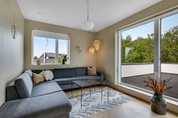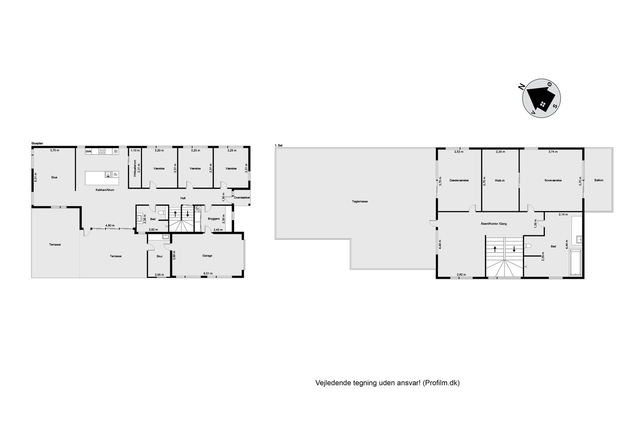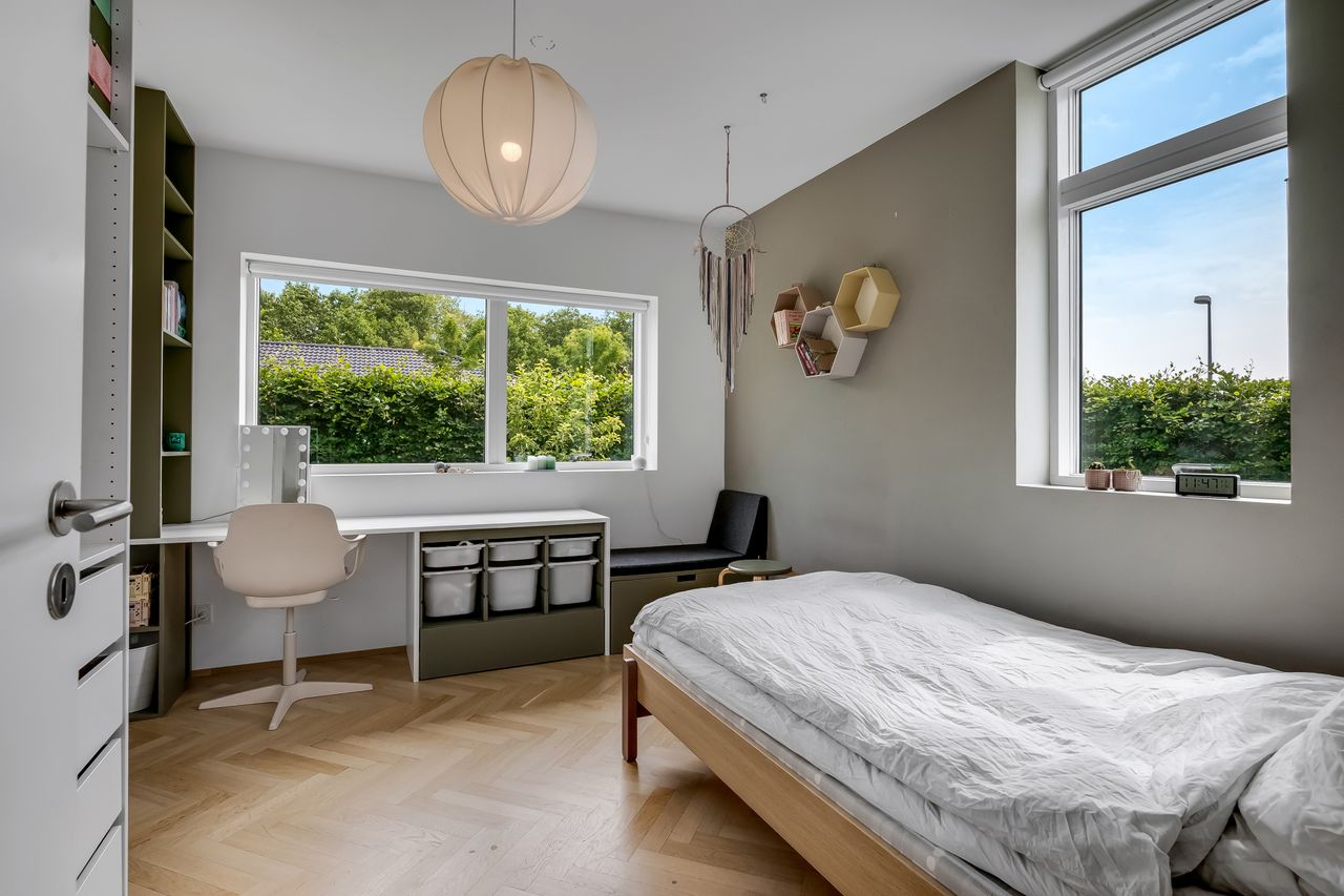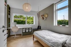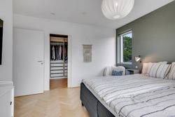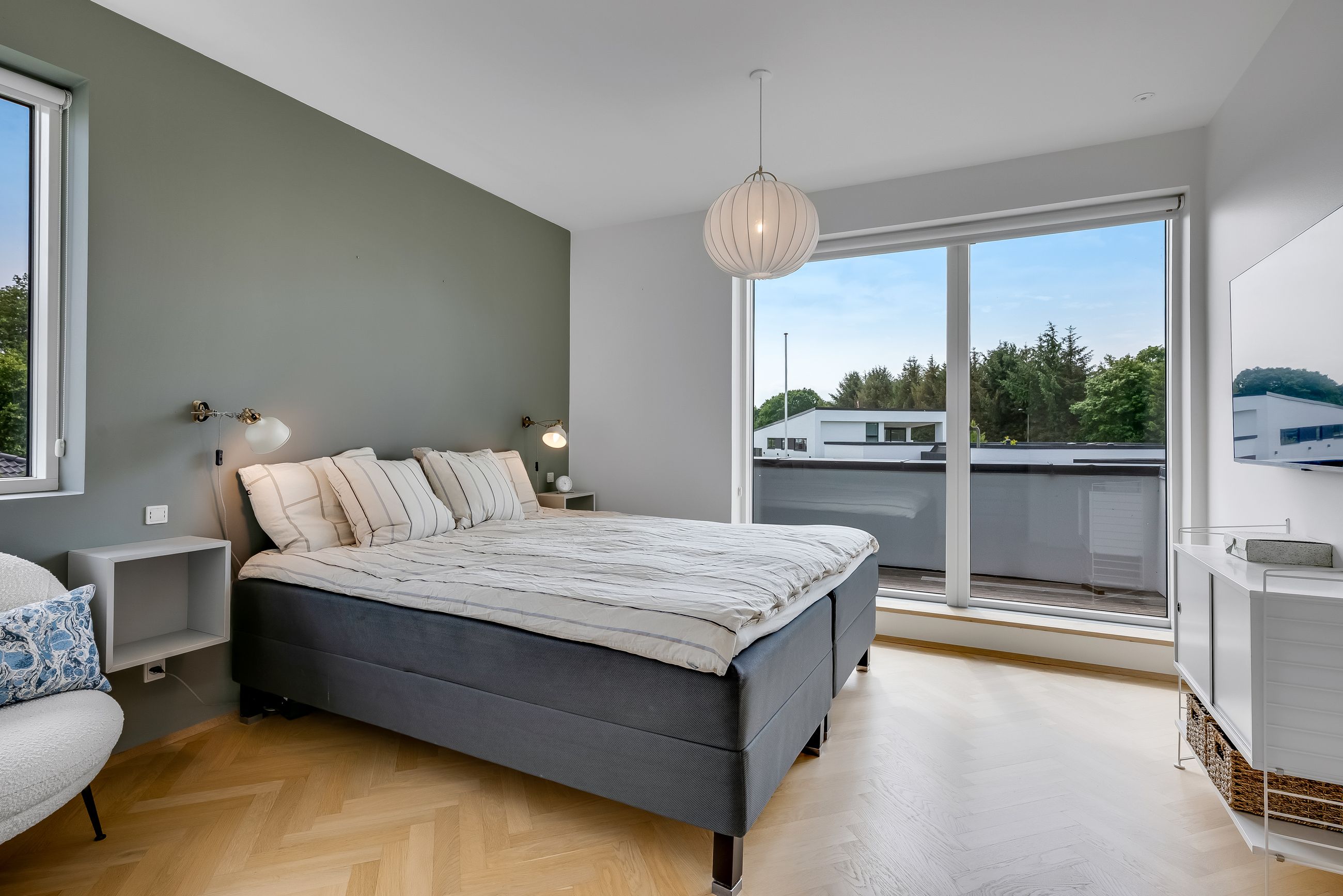 På første sal byder boligen på et rummeligt repos med mange anvendelsesmuligheder – her kan let indrettes en ekstra stue, kontor eller hobbyrum. Der er forberedt til etablering af en tagterrasse, hvilket vil give et fantastisk uderum med udsigt over området. Forældreafdelingen rummer et dejligt soveværelse med walk-in-closet samt eget badeværelse med både bruseniche og badekar – ligeledes med snedkerlavet inventar i Dinesen. Et ekstra værelse fuldender førstesalen og kan anvendes efter behov.