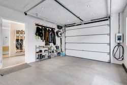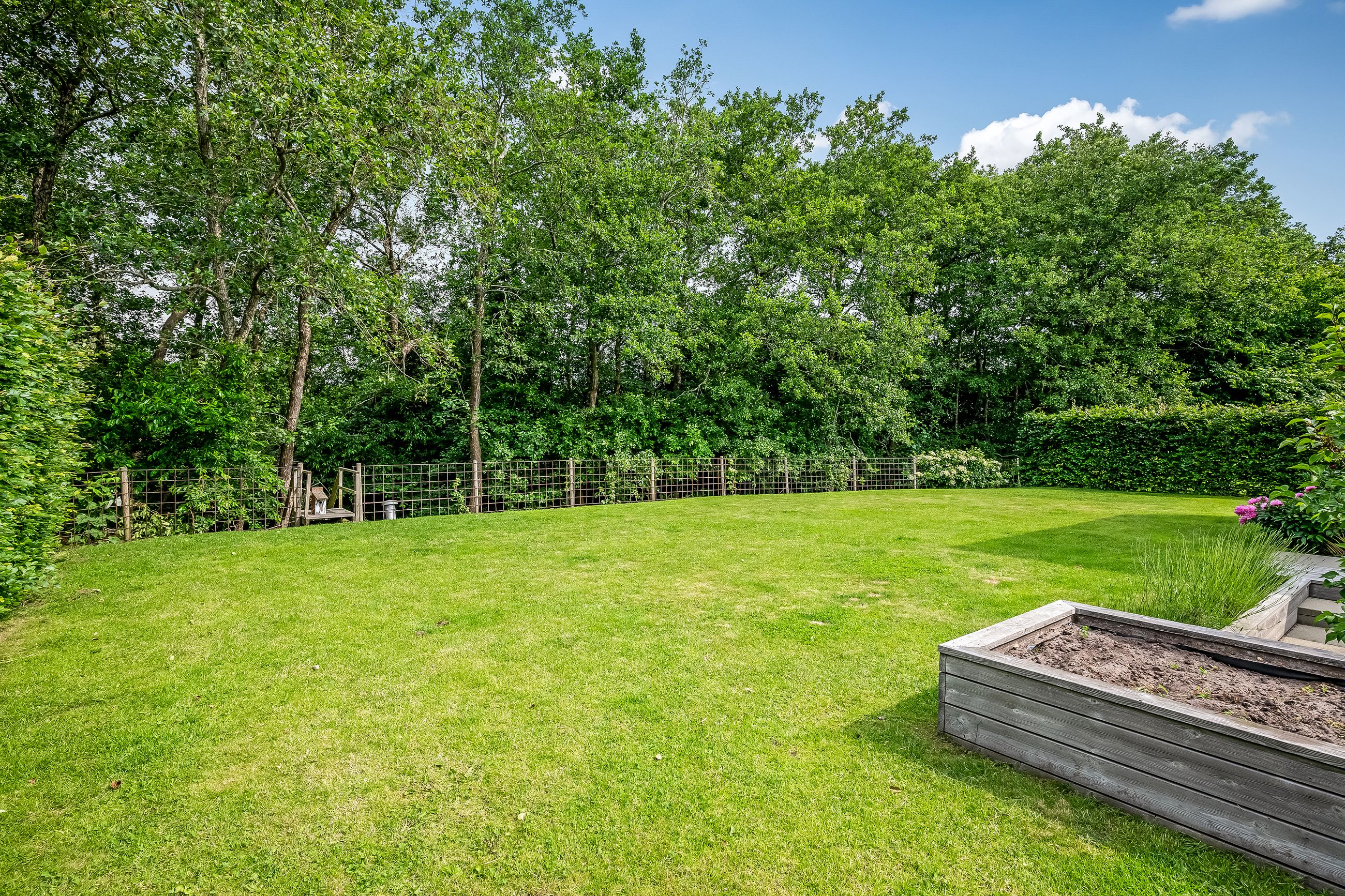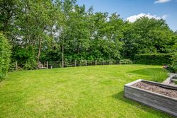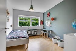Stueplan rummer desuden tre gode børneværelser og et nydeligt badeværelse. Badeværelset er udstyret med snedkerlavet inventar udført i massive Dinesen-planker – en detalje der både skaber varme og karakter. Bryggerset, som også er med Svane-inventar, fungerer som et praktisk gennemgangsrum mellem hus og garage, hvilket gør hverdagen ekstra funktionel. Via garagen er der adgang til skuret og videre ud til haven, som ligger ugenert og op til et tæt beplantet område – perfekt til dem, der ønsker fred og ro omkring sig.