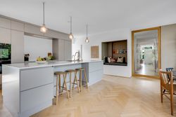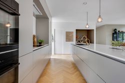 Køkkenet er udstyret med inventar fra Svane og tilhørende viktualierum, og som en praktisk og familievenlig detalje er her også indrettet en alkove, hvor børnene kan slappe af, mens dagens måltider tilberedes. Alrummet forbindes med en hyggelig stue, som indbyder til ro og nærvær.
