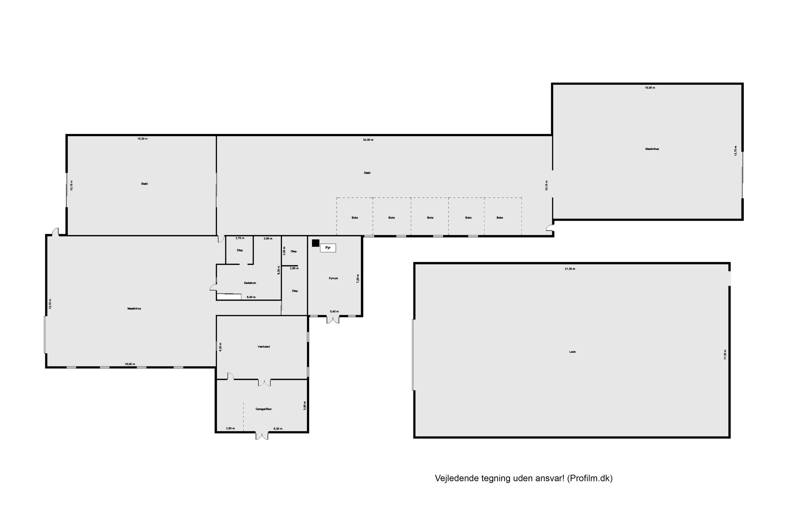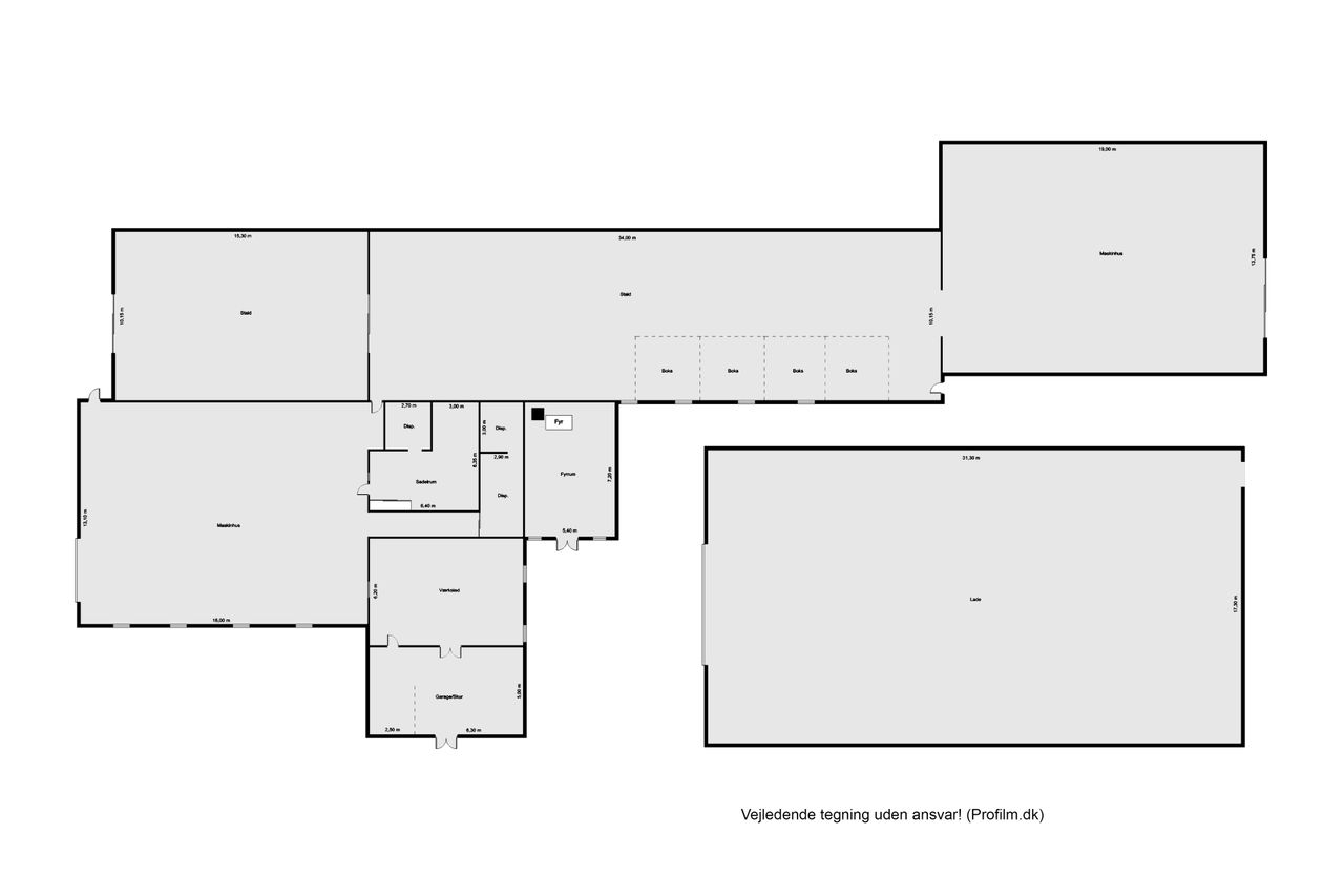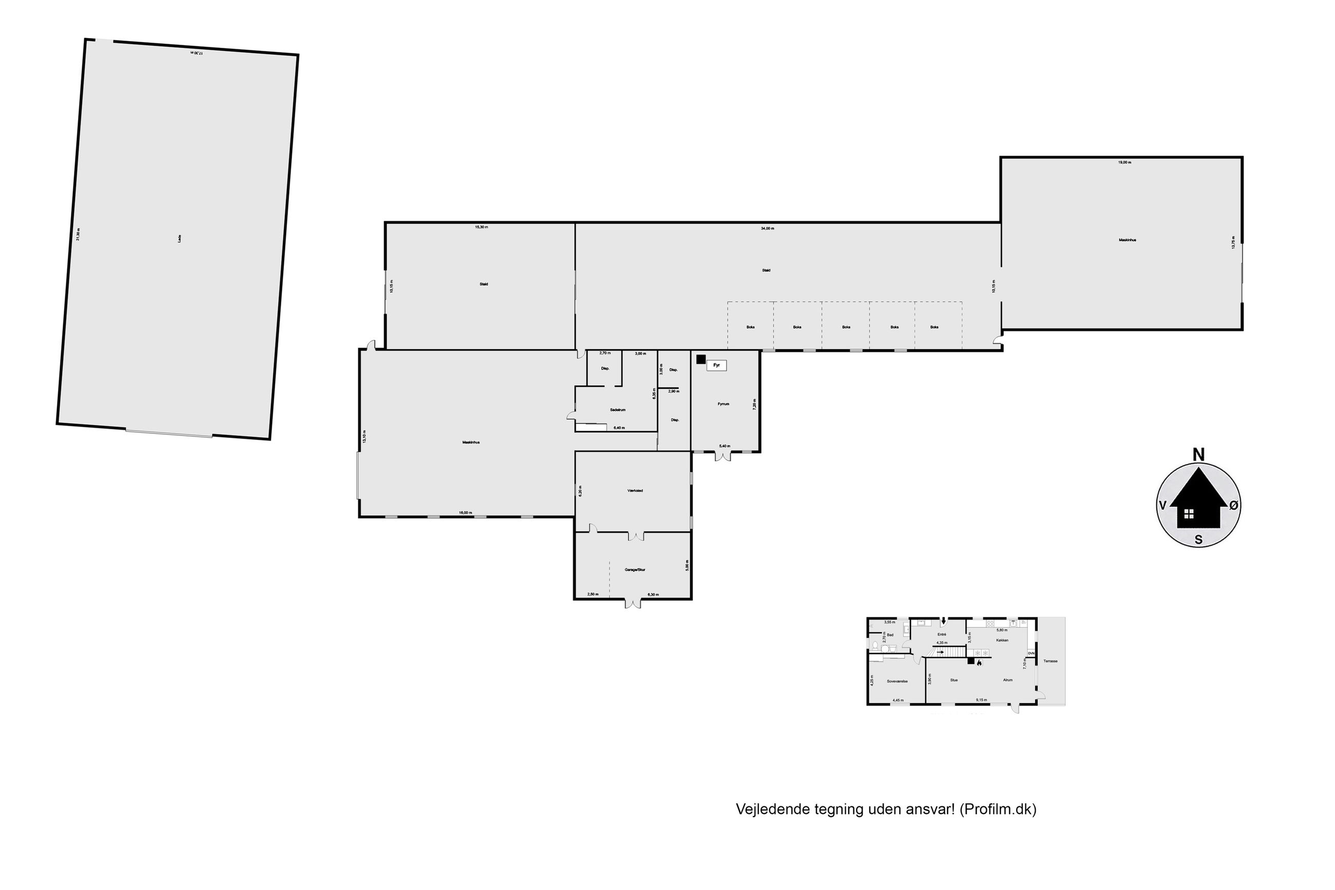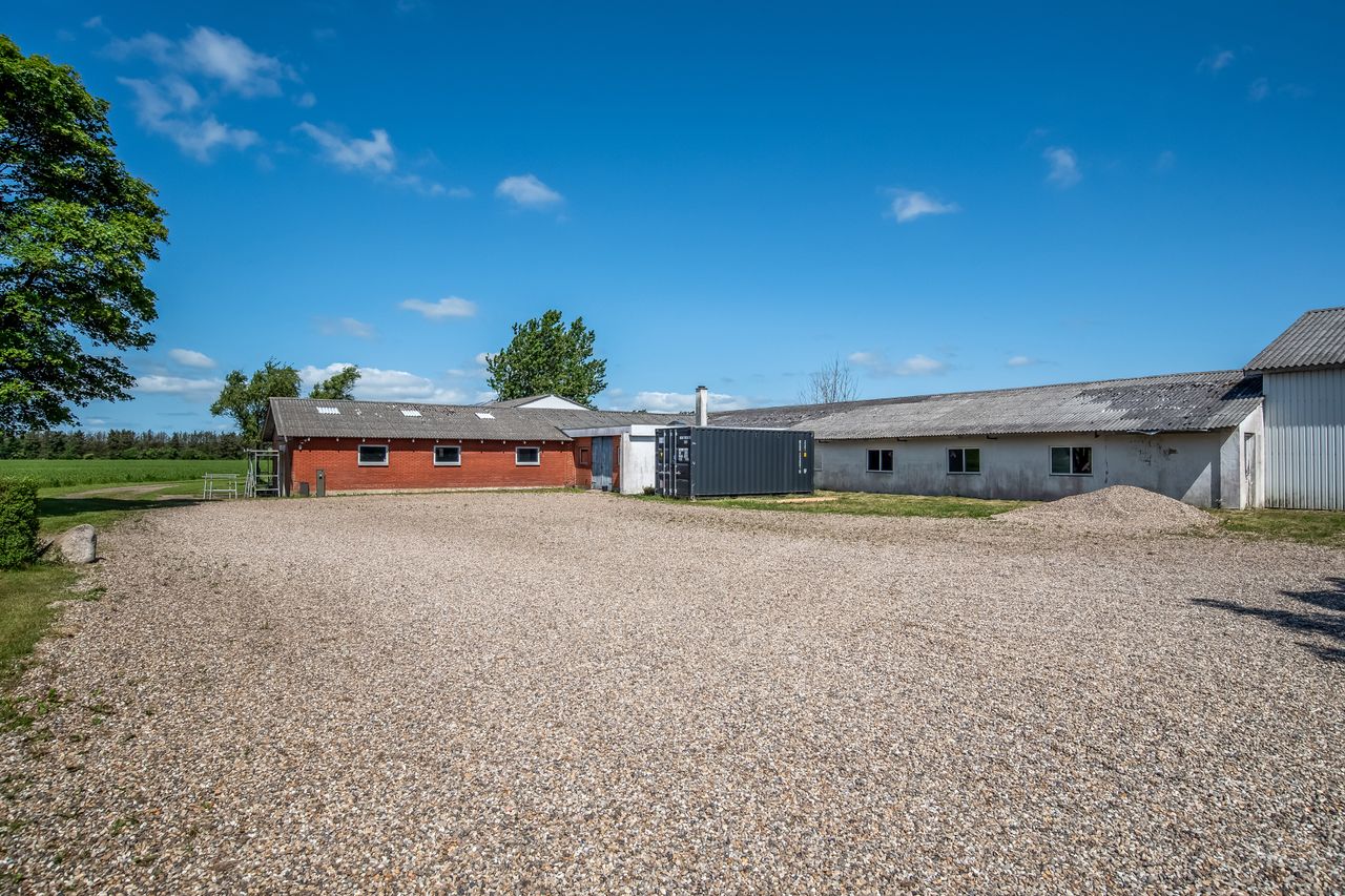 Til ejendommen hører en række anvendelige udbygninger, herunder to maskinhuse, staldbygninger med påbegyndt etablering af 4 hestebokse, fyrrum, flere disponible rum, værksted, garage/skur samt et isoleret sadelrum. Vestligst på grunden findes en rummelig lade på ca. 540 m2. Faciliteterne rummer således oplagte rammer for hestehold, løsdrift og opbevaring, men også for værksted eller anden fritidsbrug.