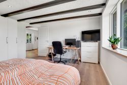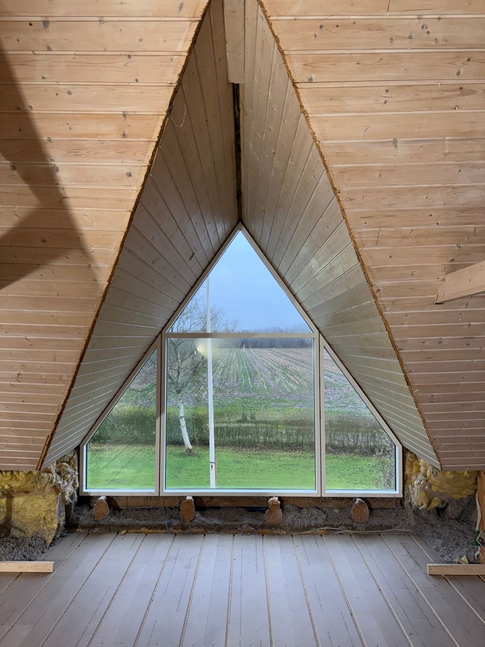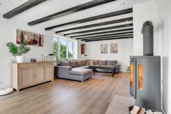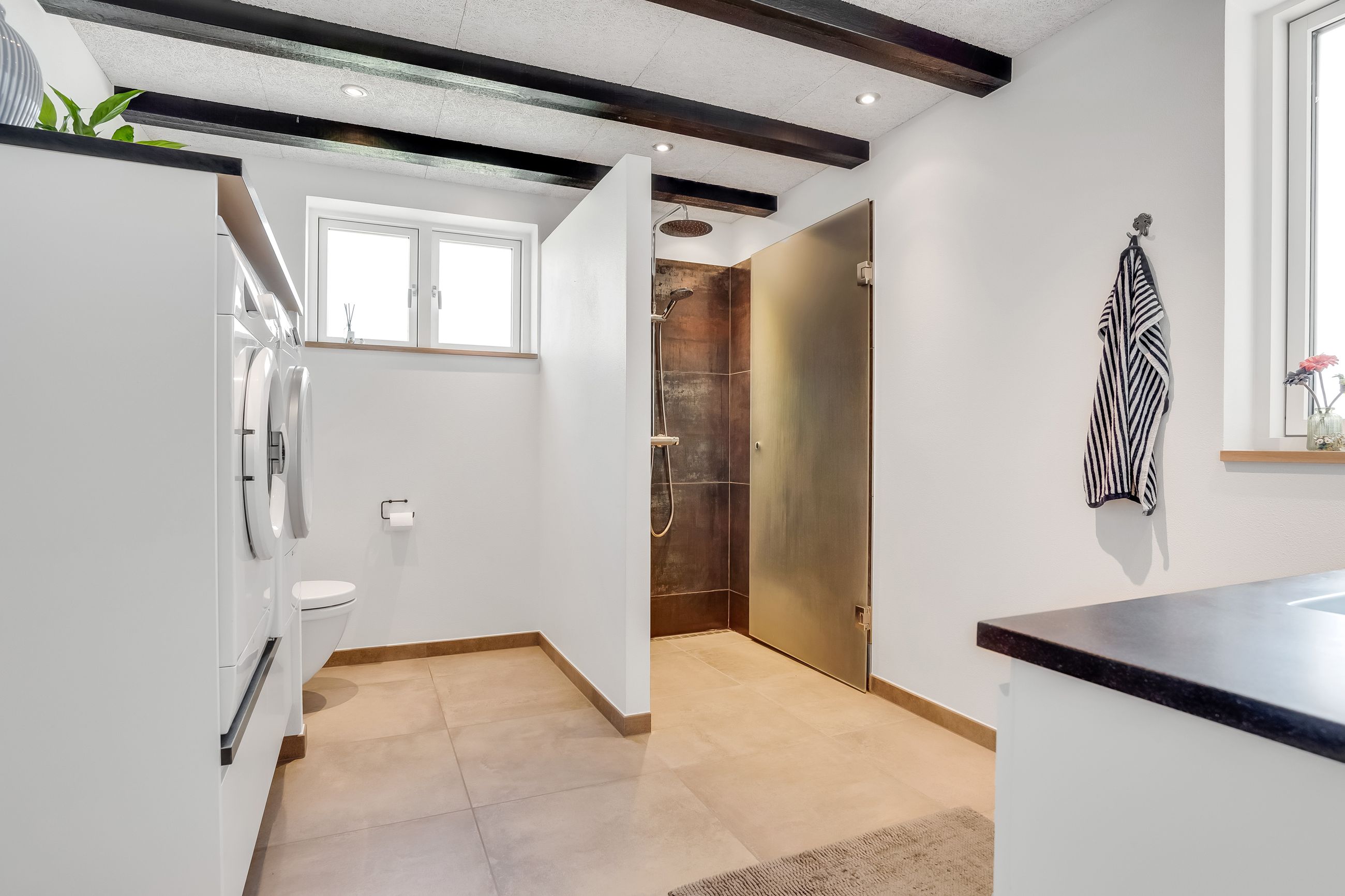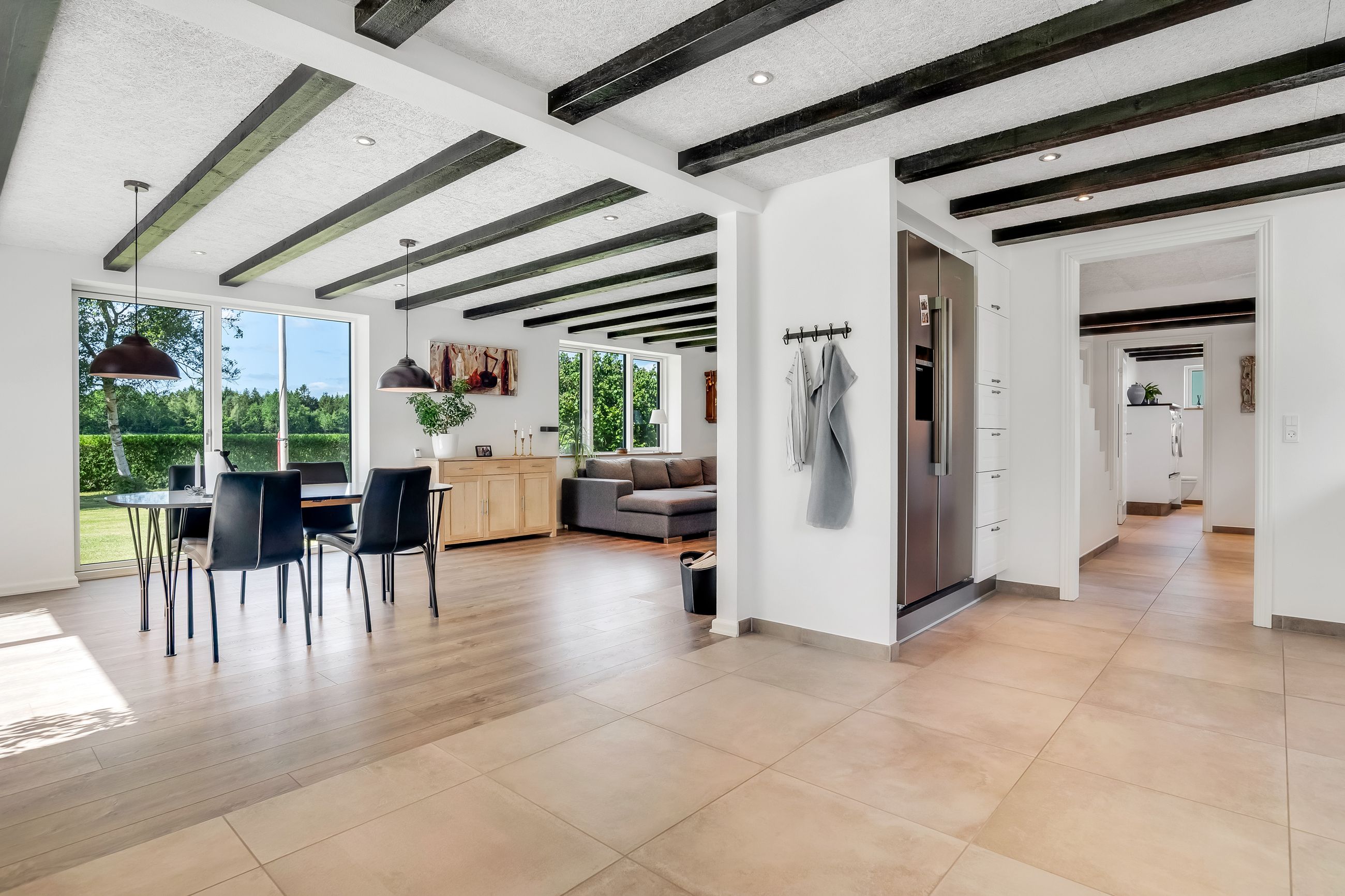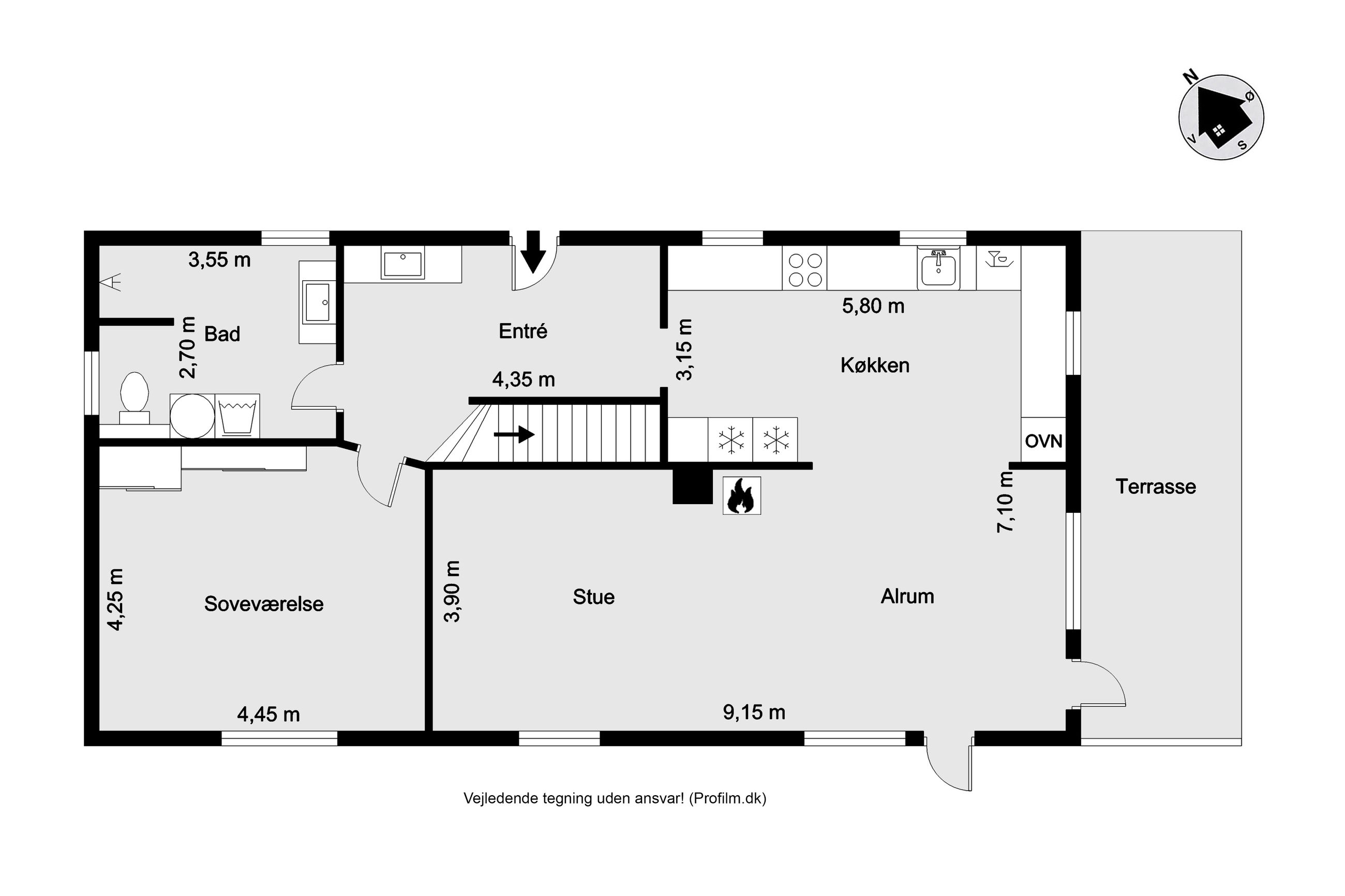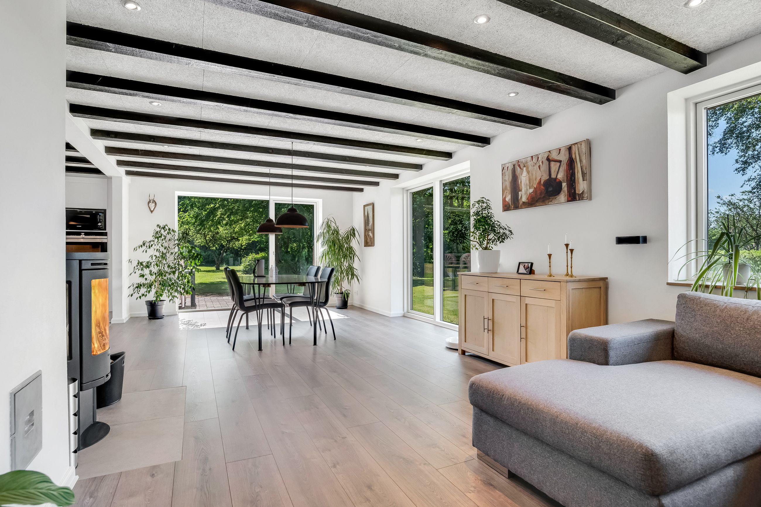 Planløsningen rummer en praktisk indgang, badeværelse, soveværelse samt et stort køkken/alrum og stue i åben forbindelse. Fra alrummet er der udgang til en østvendt terrasse med kig til ridebanen og markerne. Ønskes et ekstra værelse, kan en del af stuen nemt inddeles – gulvvarmen er forberedt til en sådan opdeling ved skorstenen.