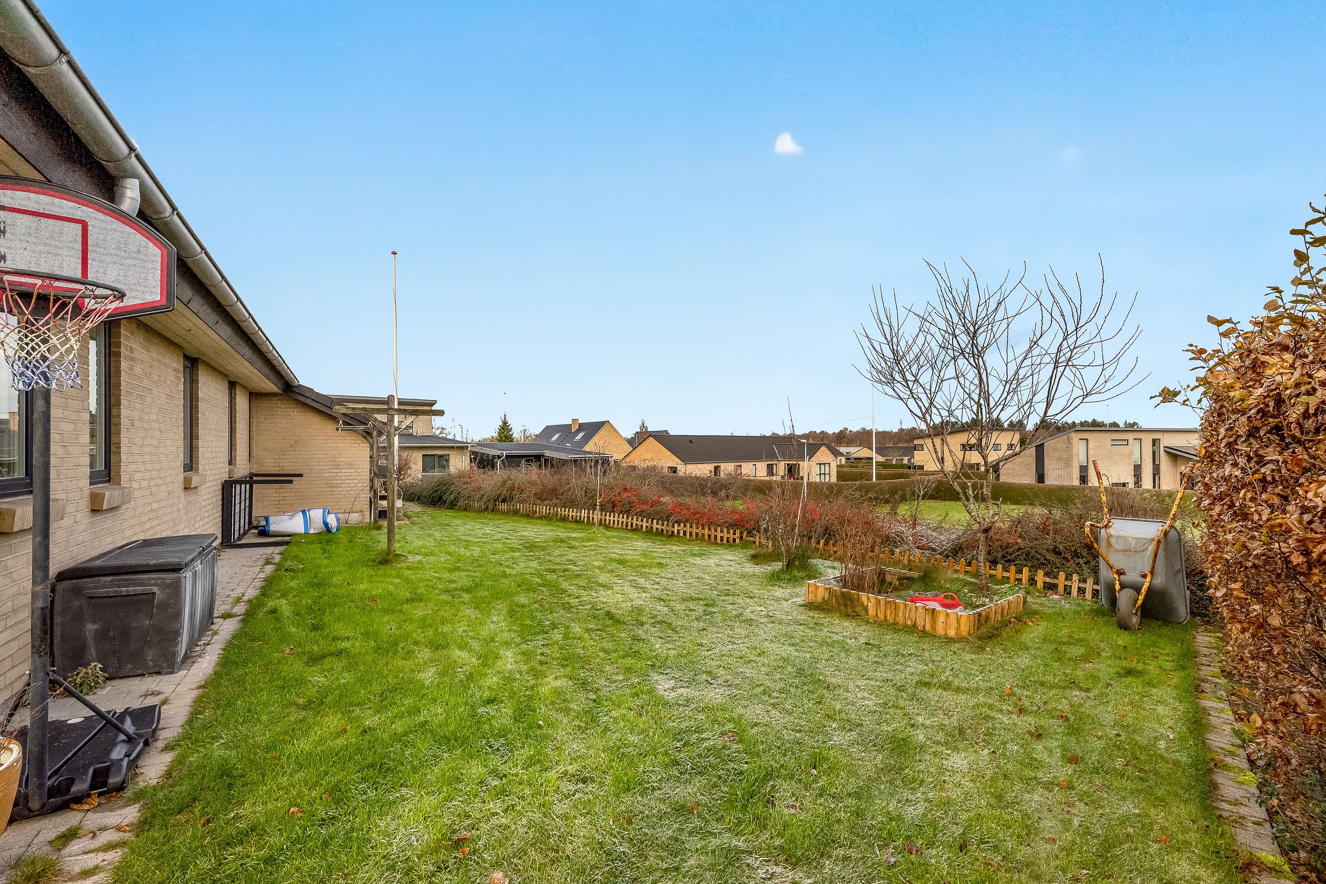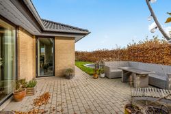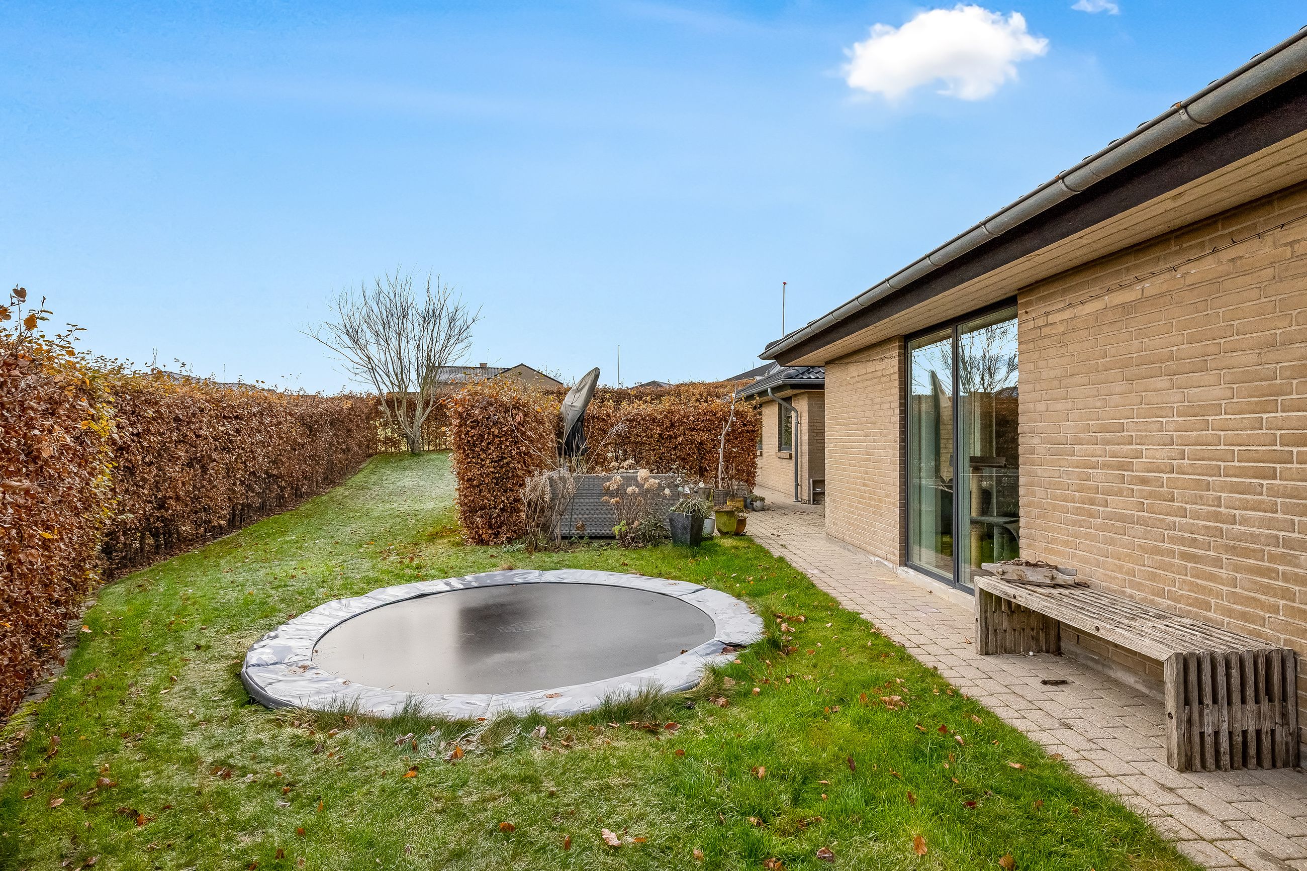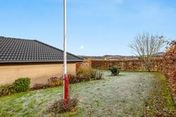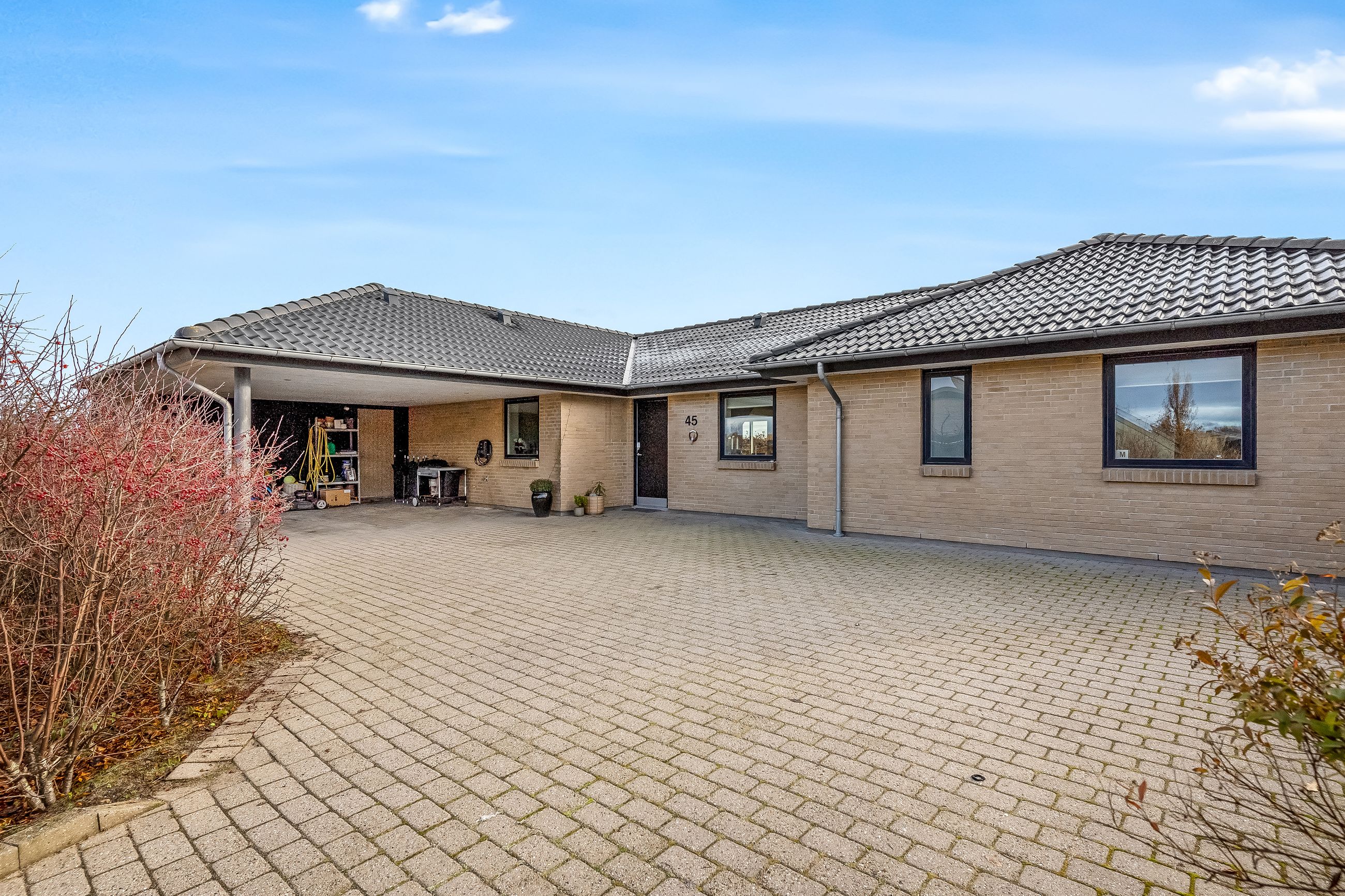 Til ejendommen hører en stor carport med tilhørende redskabsrum. Foran huset er der et stort, flisebelagt område med gode parkeringsforhold. Haven er overskuelig og let at holde – perfekt til familien, der ønsker en nem og funktionel udendørsramme.