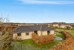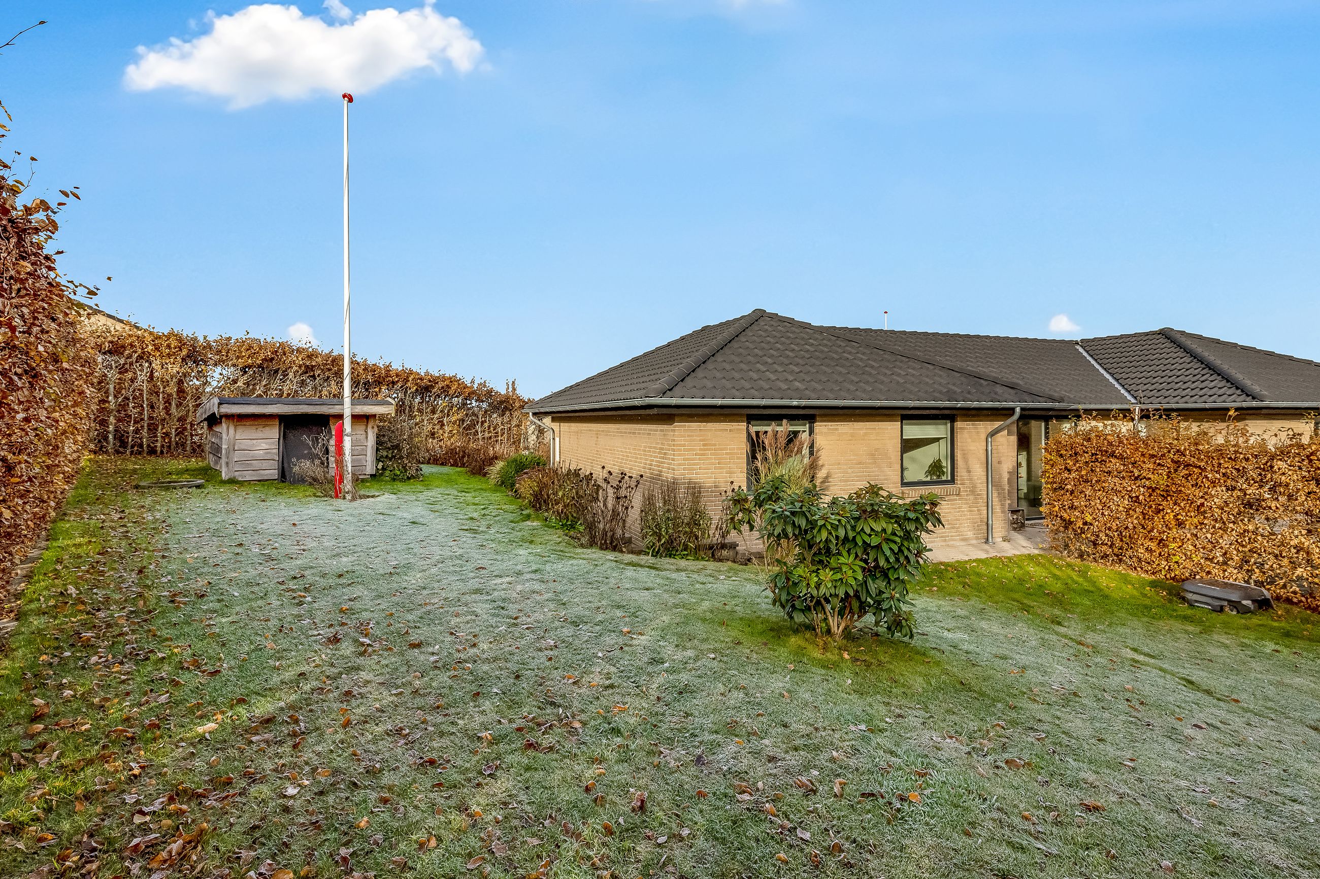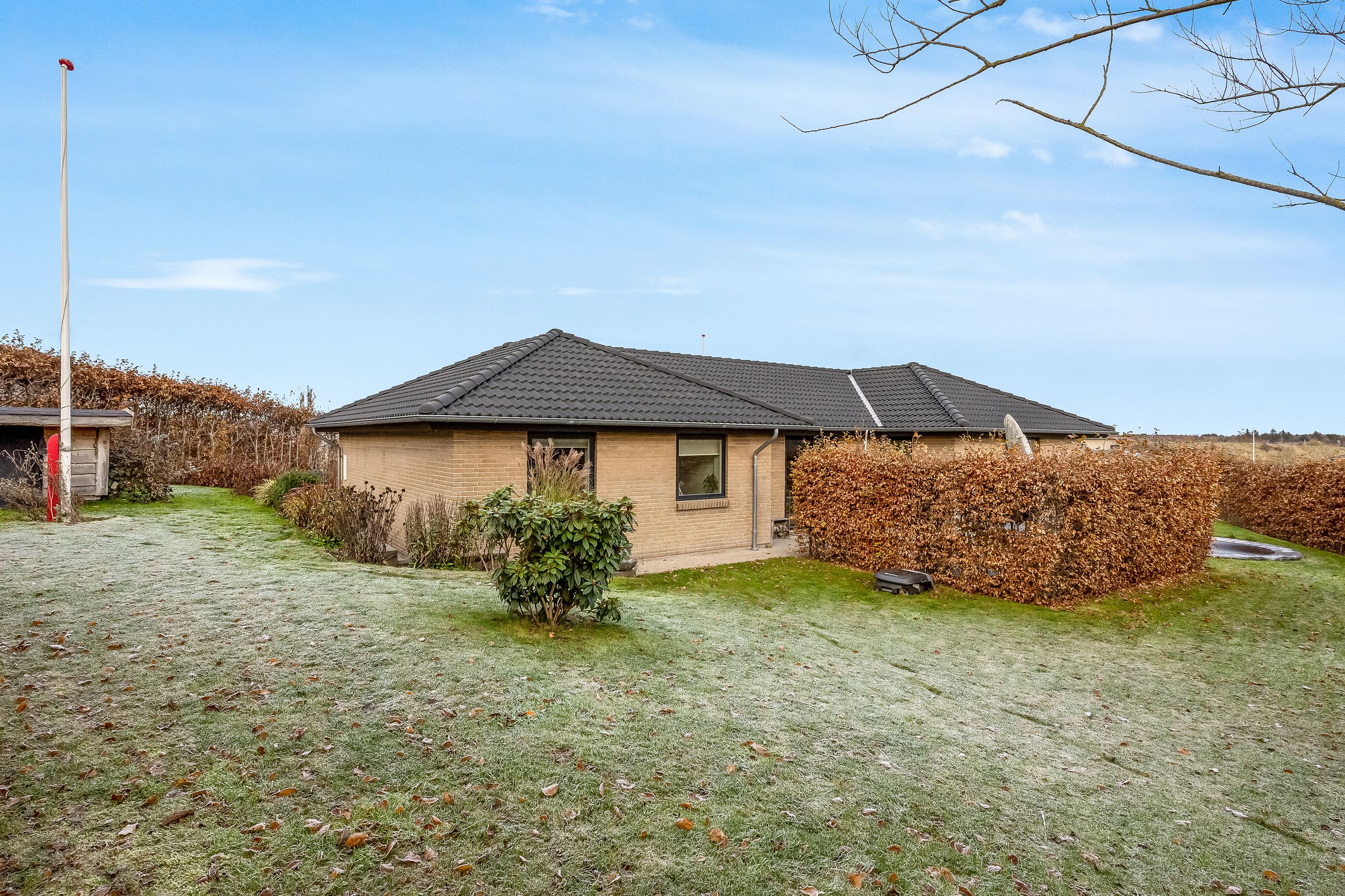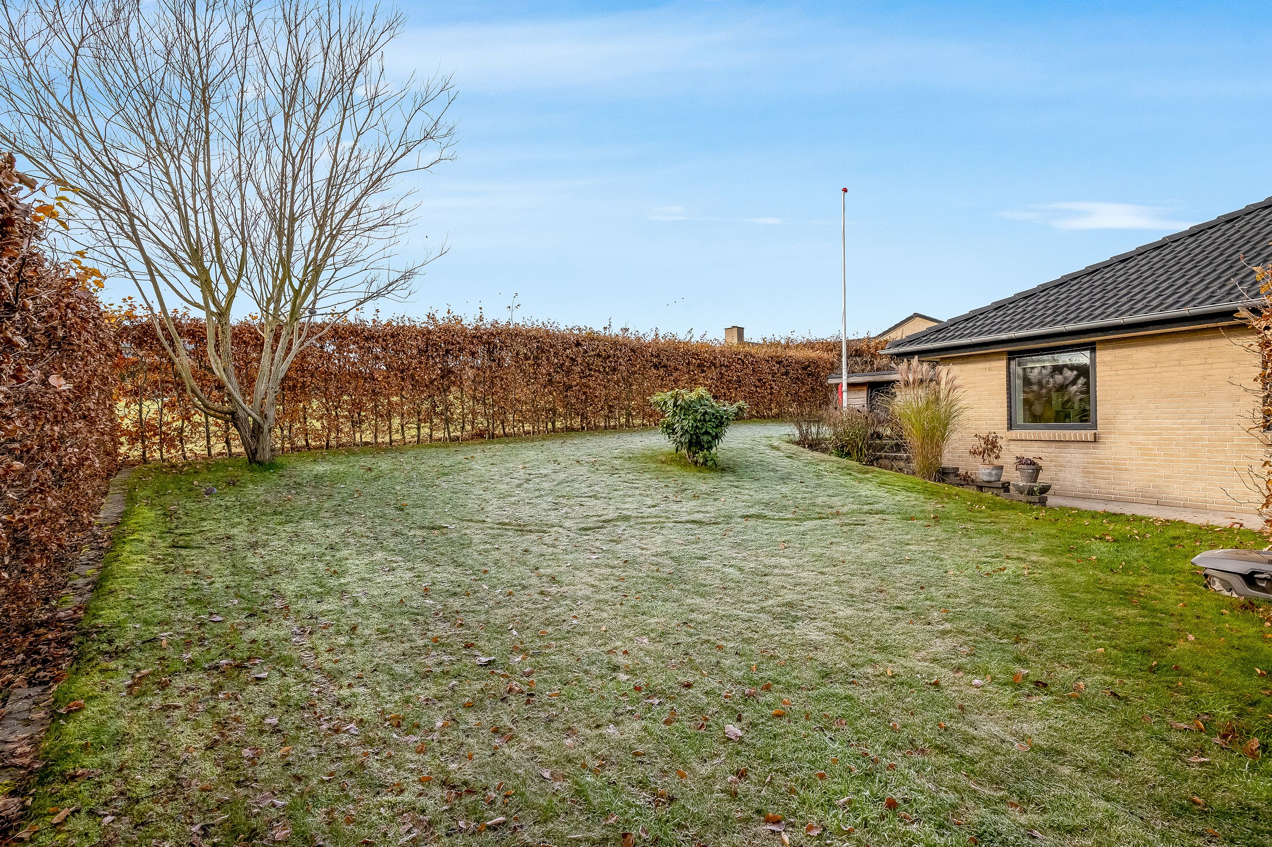 Til ejendommen hører en stor carport med tilhørende redskabsrum. Foran huset er der et stort, flisebelagt område med gode parkeringsforhold. Haven er overskuelig og let at holde – perfekt til familien, der ønsker en nem og funktionel udendørsramme.