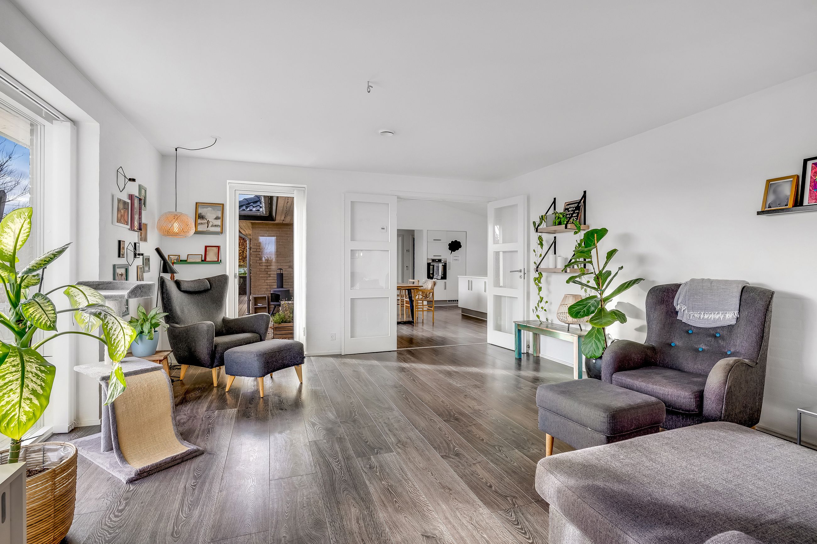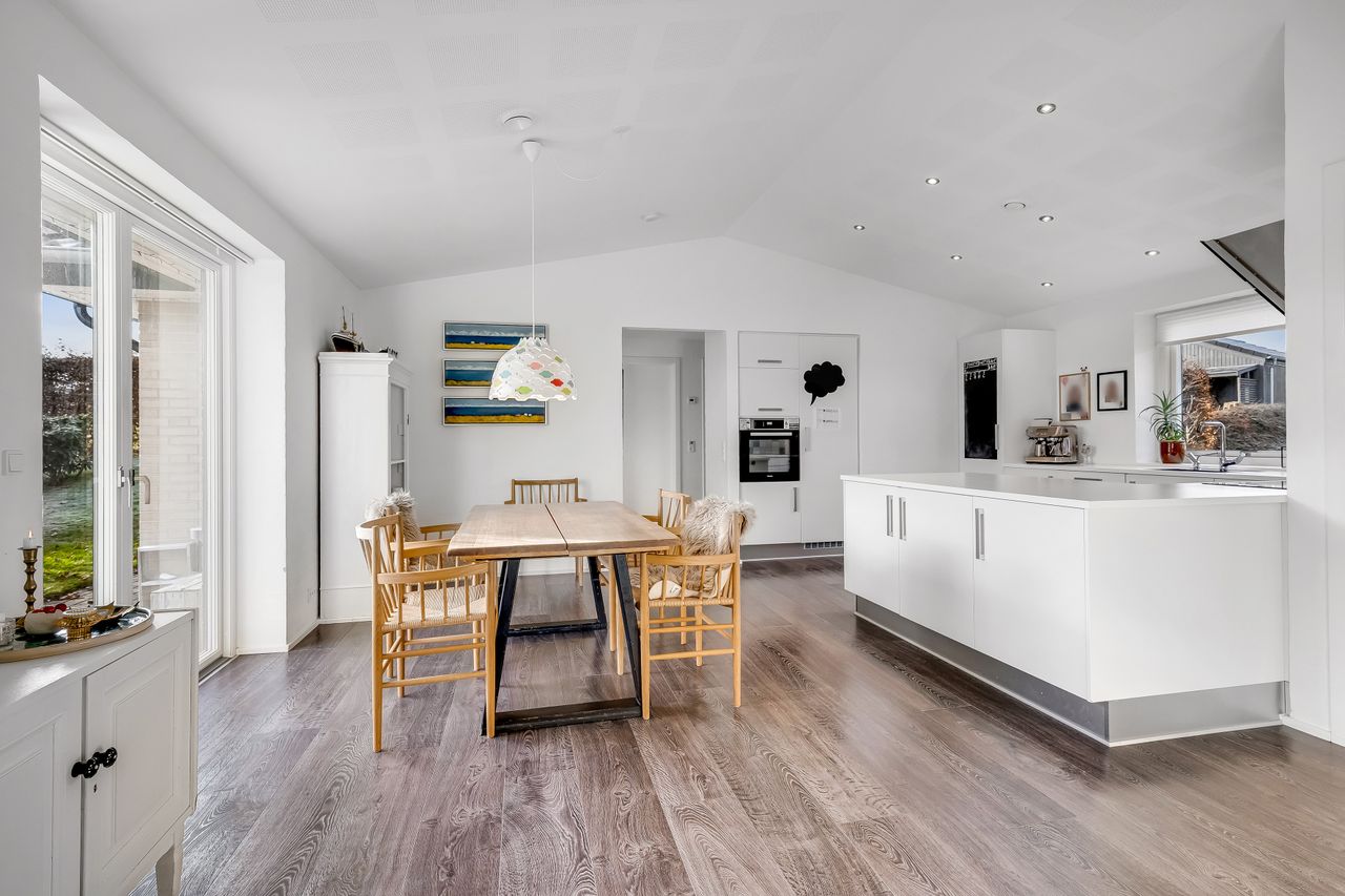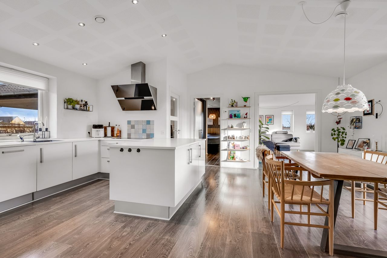Husets naturlige samlingspunkt er det lyse og rummelige køkken/alrum med god loftshøjde og et behageligt lysindfald. Her er der god plads til både madlavning og samvær, og fra alrummet er der udgang til en sydvendt terrasse, som forlænger opholdsmiljøet i sommerhalvåret. Stuen fremstår som et stort og indbydende opholdsrum med gode indretningsmuligheder. Den adskilte placering giver mulighed for både fælles ophold og mere rolige stunder.