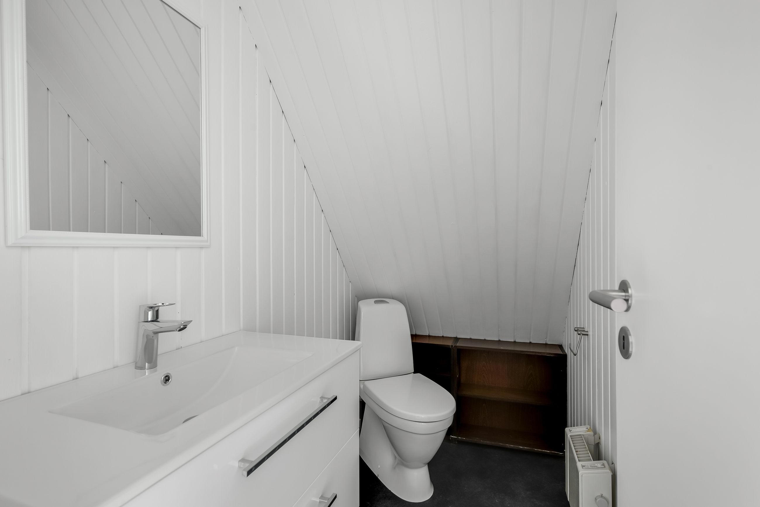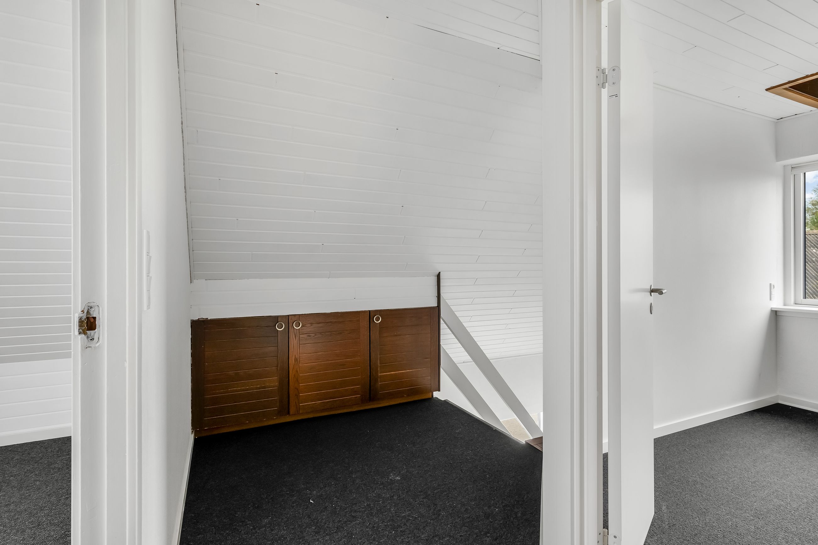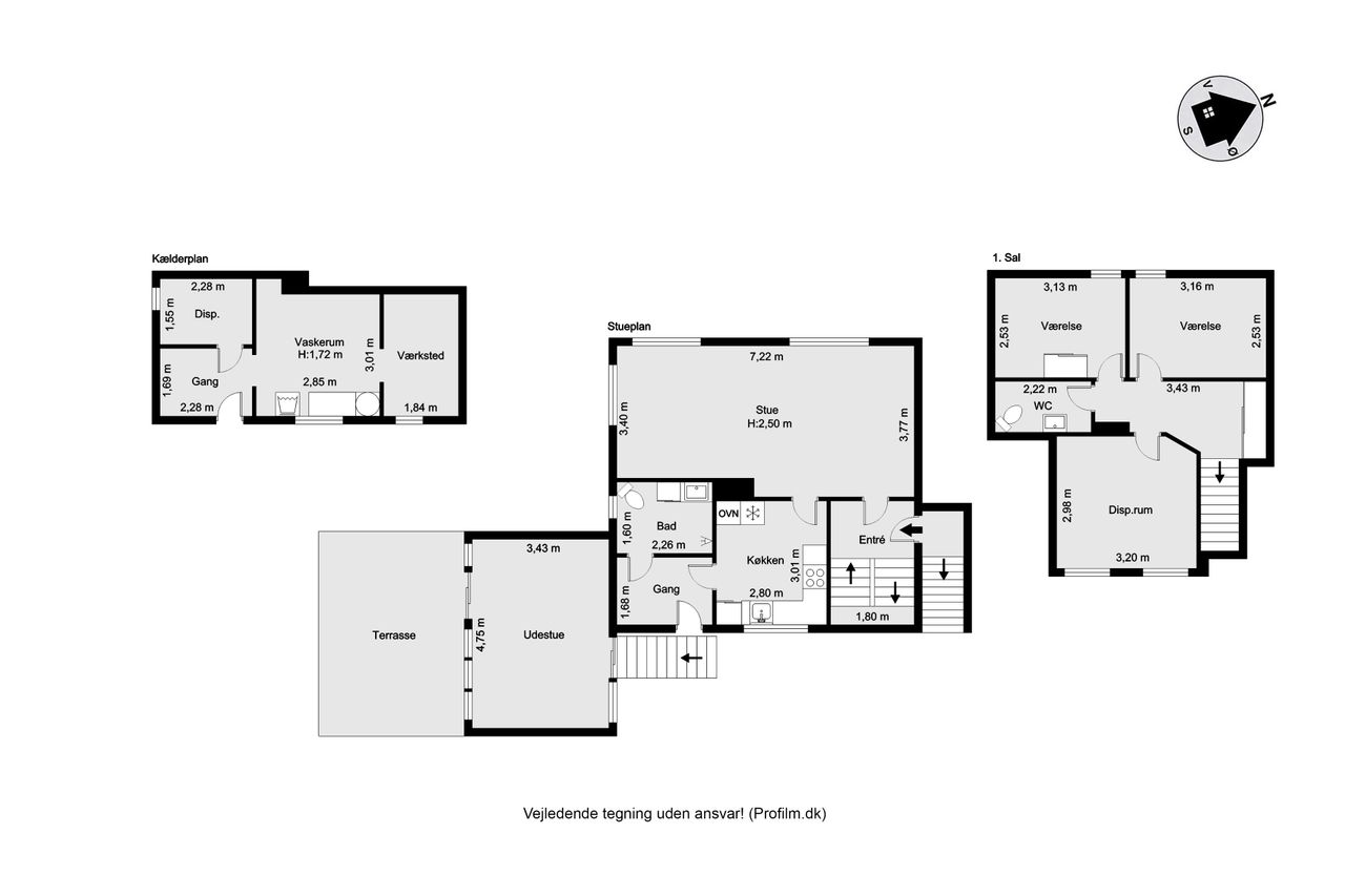 1. sal fungerer som værelsesafdeling med hele tre gode værelser samt et toilet, hvilket betyder, at boligen kan danne rammerne i hverdagen for både enlige, par eller små familier. Boligen har desuden en god kælder, hvor bryggers/fyrrum/værksted på praktisk vis er adskilt fra boligdelen.