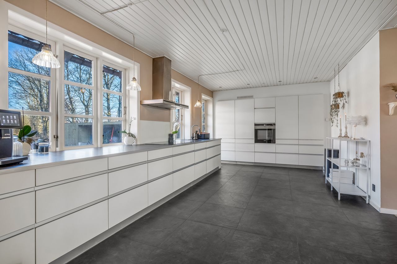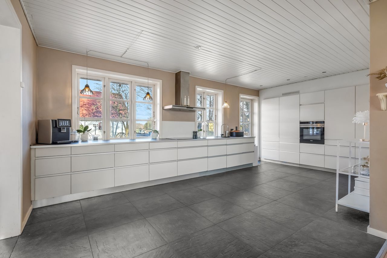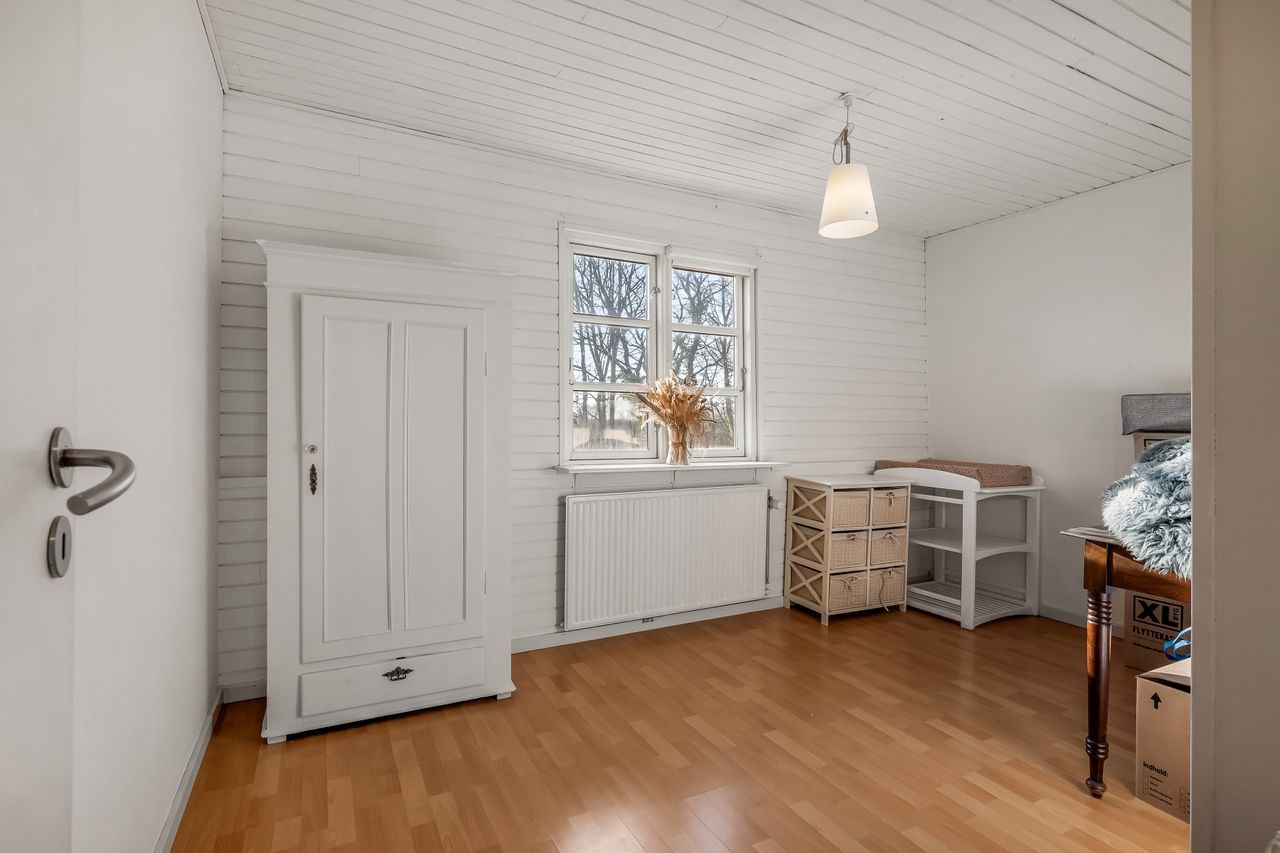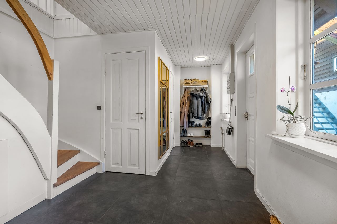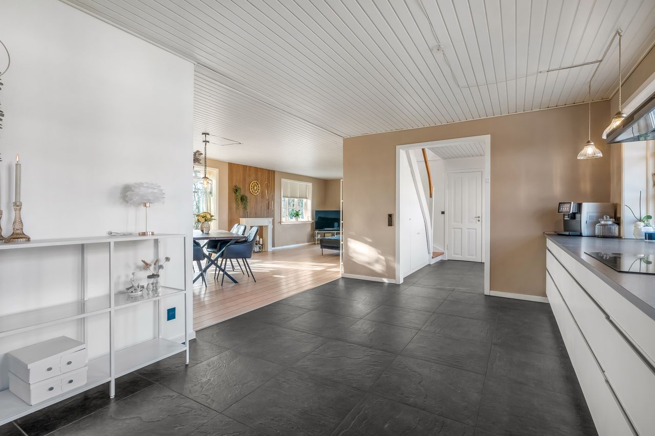 Stuehuset er i stueplan indrettet med entré, badeværelse og et værelse. Køkkenet fremstår lyst og tidløst og ligger i åben forbindelse med alrum og stue, hvilket skaber et naturligt samlingspunkt i boligen. Her er gode indretningsmuligheder samt et behageligt lysindfald. Fra stuen er der direkte udgang til haven og en stor terrasse, som giver fine rammer for udelivet.
