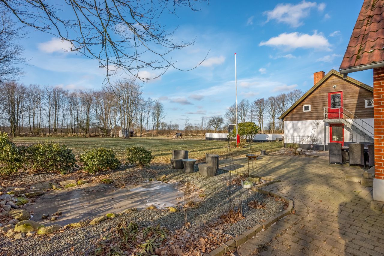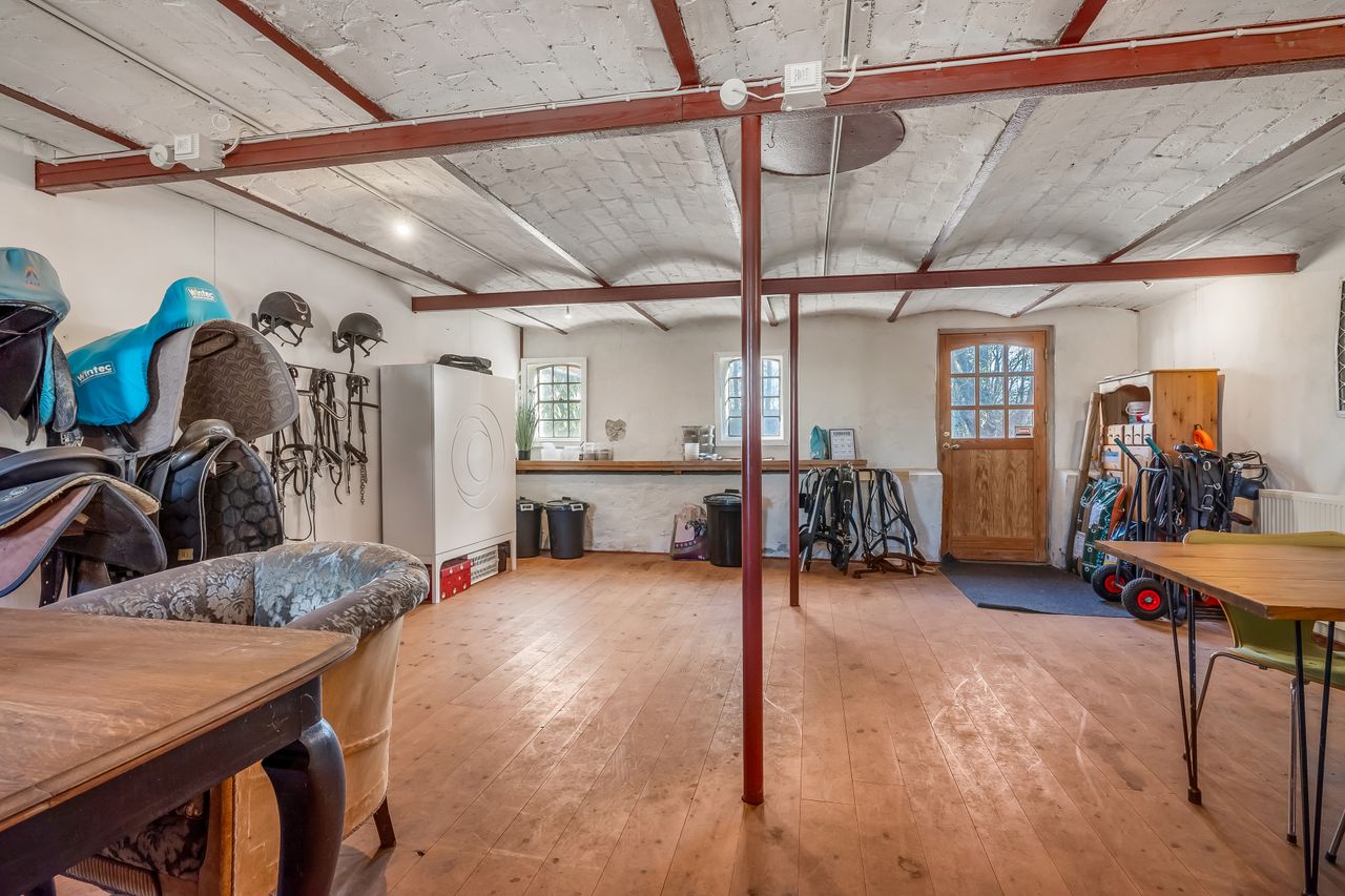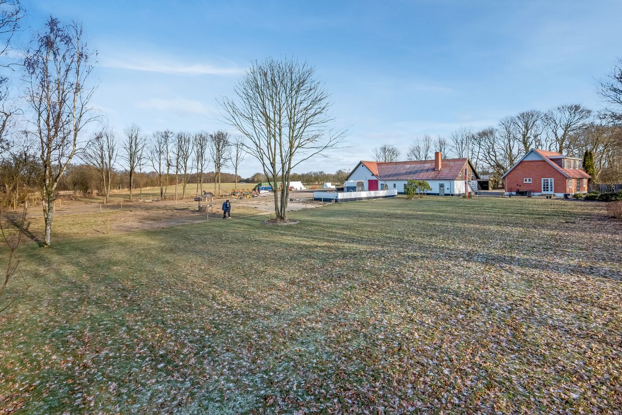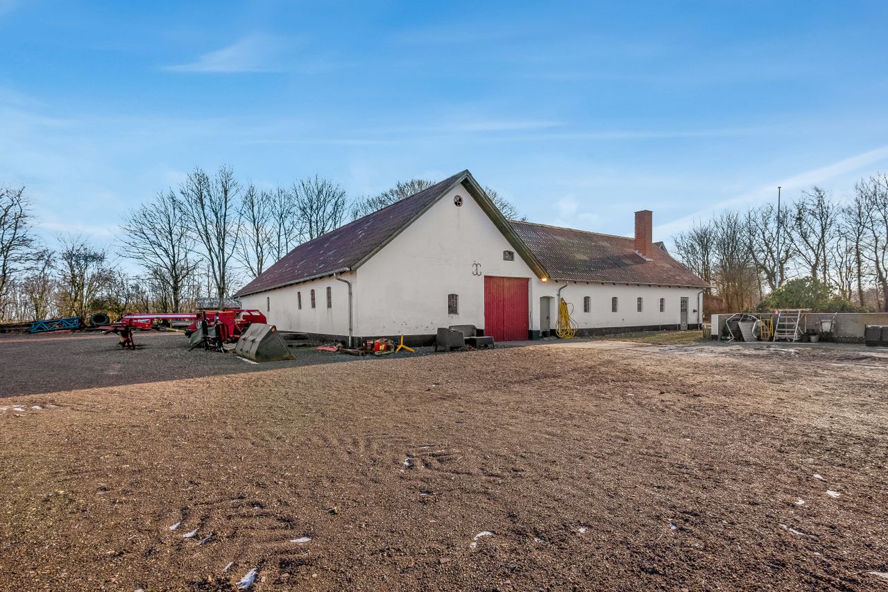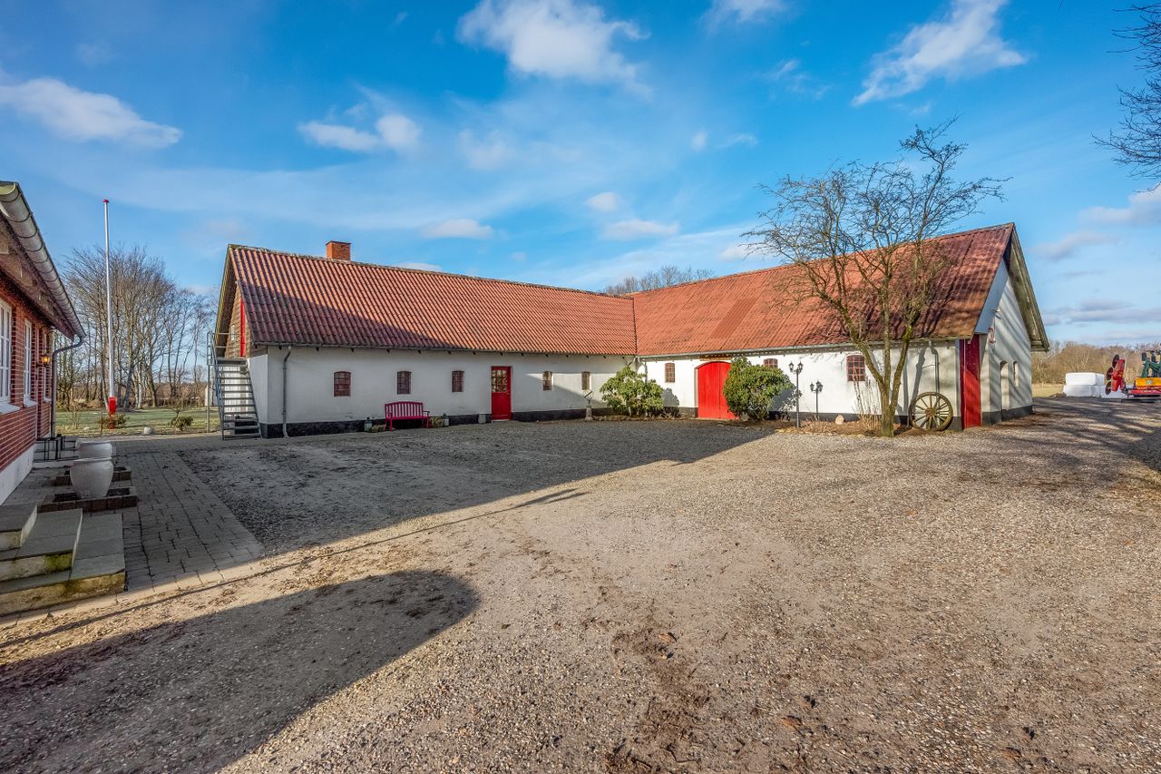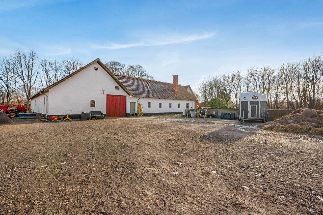 Til ejendommen hører flere funktionelle udbygninger, herunder lade, staldbygning samt en dobbelt carport med tilhørende cykelskur. Stalden er indrettet med blandt andet rummelige hestebokse i en størrelse, der egner sig til folingsbokse, samt et stort sadelrum, vaskerum og fyrrum. Bygningerne giver samlet set gode faciliteter til hestehold og øvrige hobbyaktiviteter.