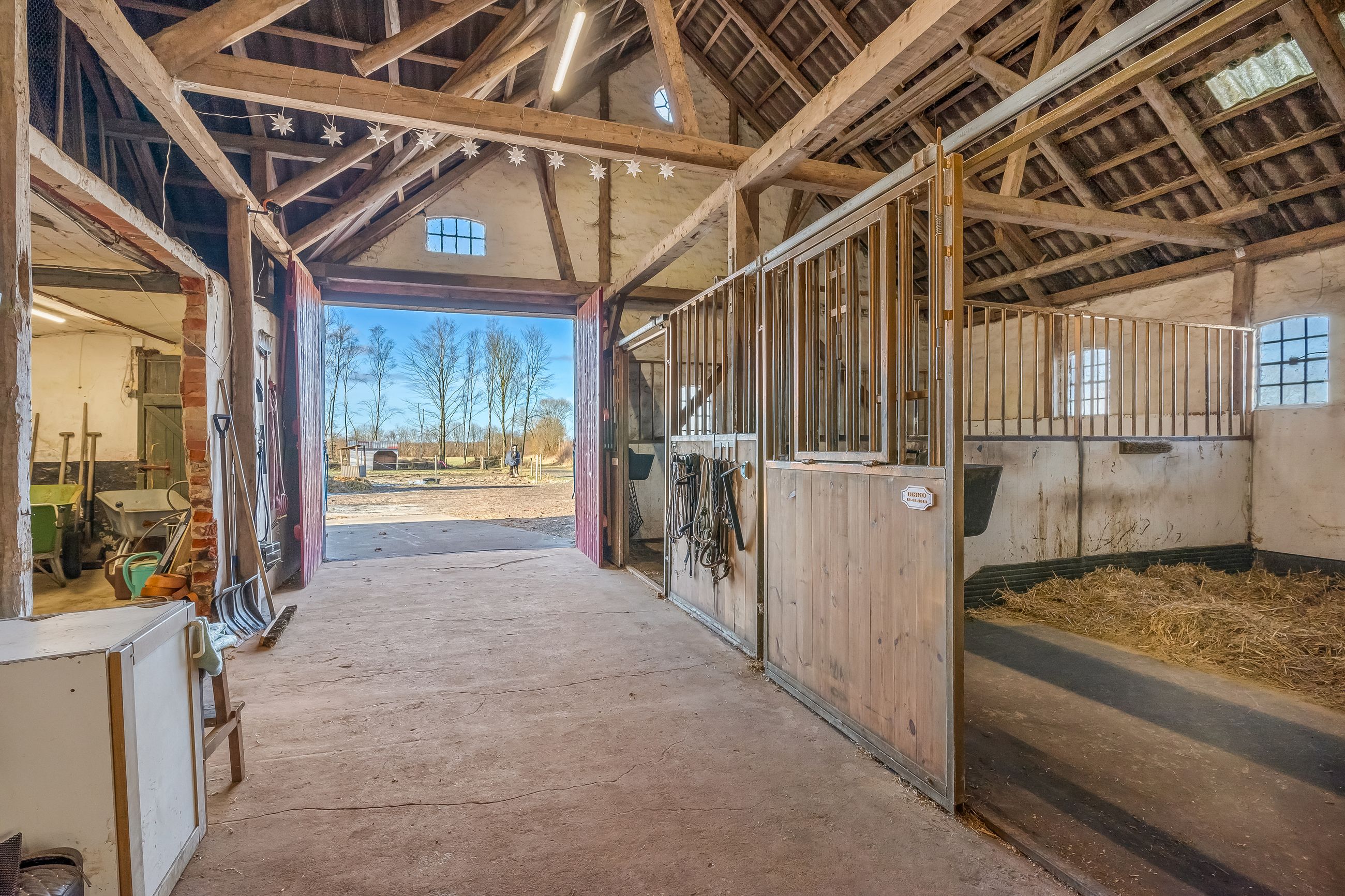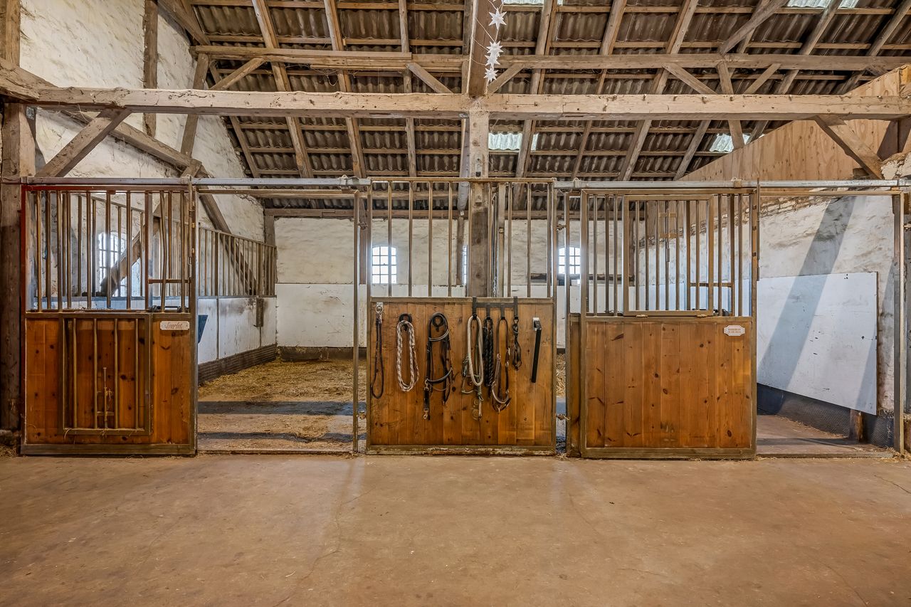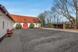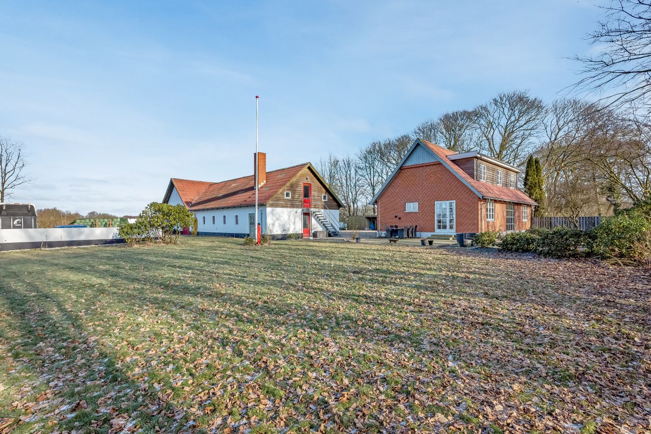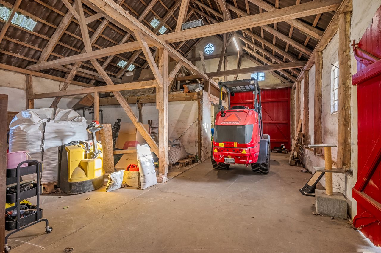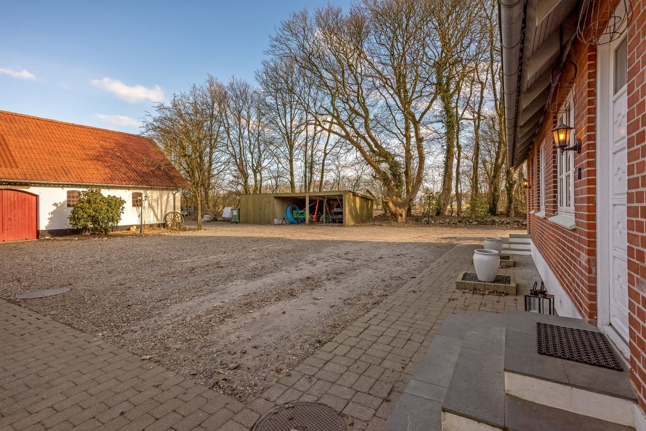Til ejendommen hører flere funktionelle udbygninger, herunder lade, staldbygning samt en dobbelt carport med tilhørende cykelskur. Stalden er indrettet med blandt andet rummelige hestebokse i en størrelse, der egner sig til folingsbokse, samt et stort sadelrum, vaskerum og fyrrum. Bygningerne giver samlet set gode faciliteter til hestehold og øvrige hobbyaktiviteter.