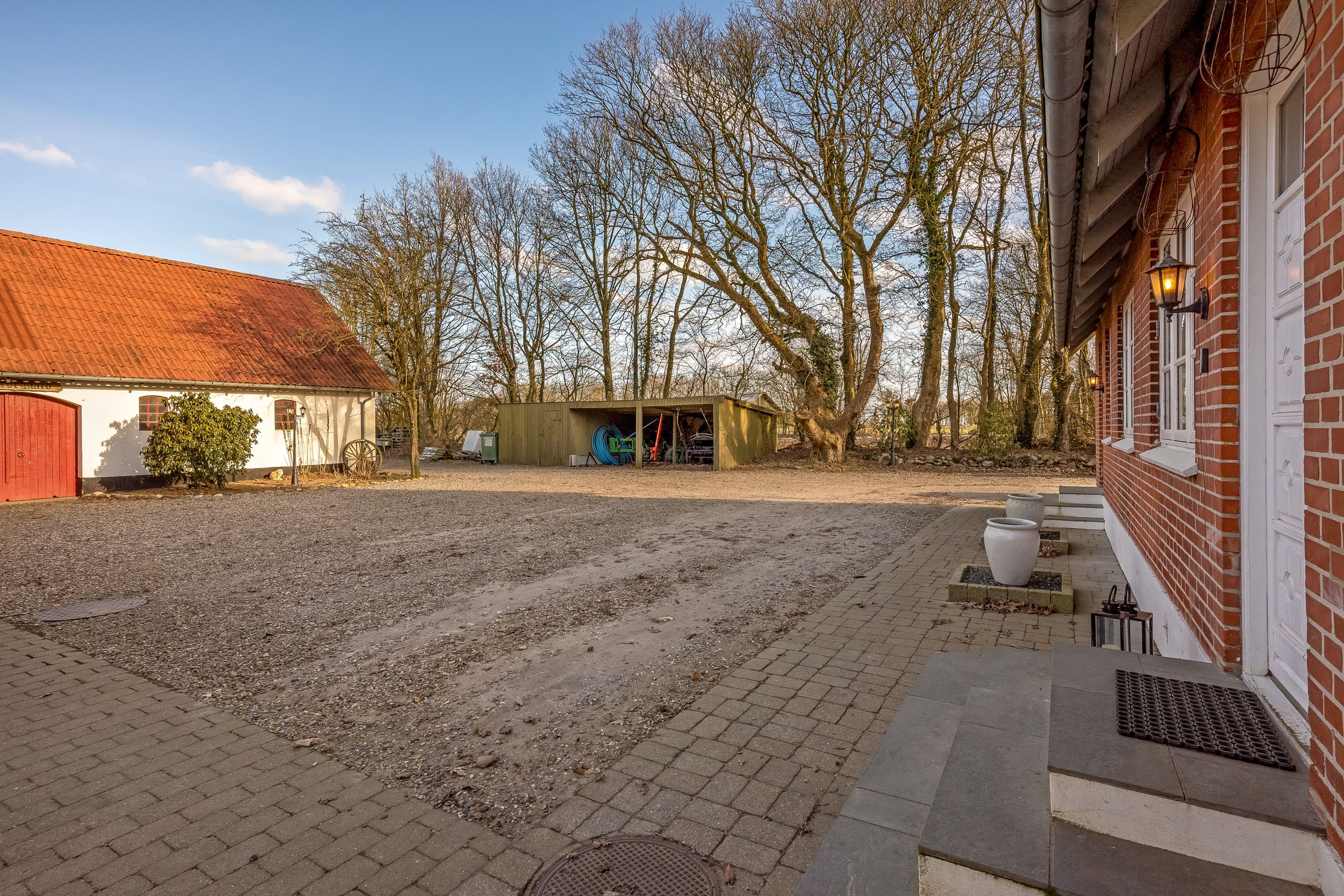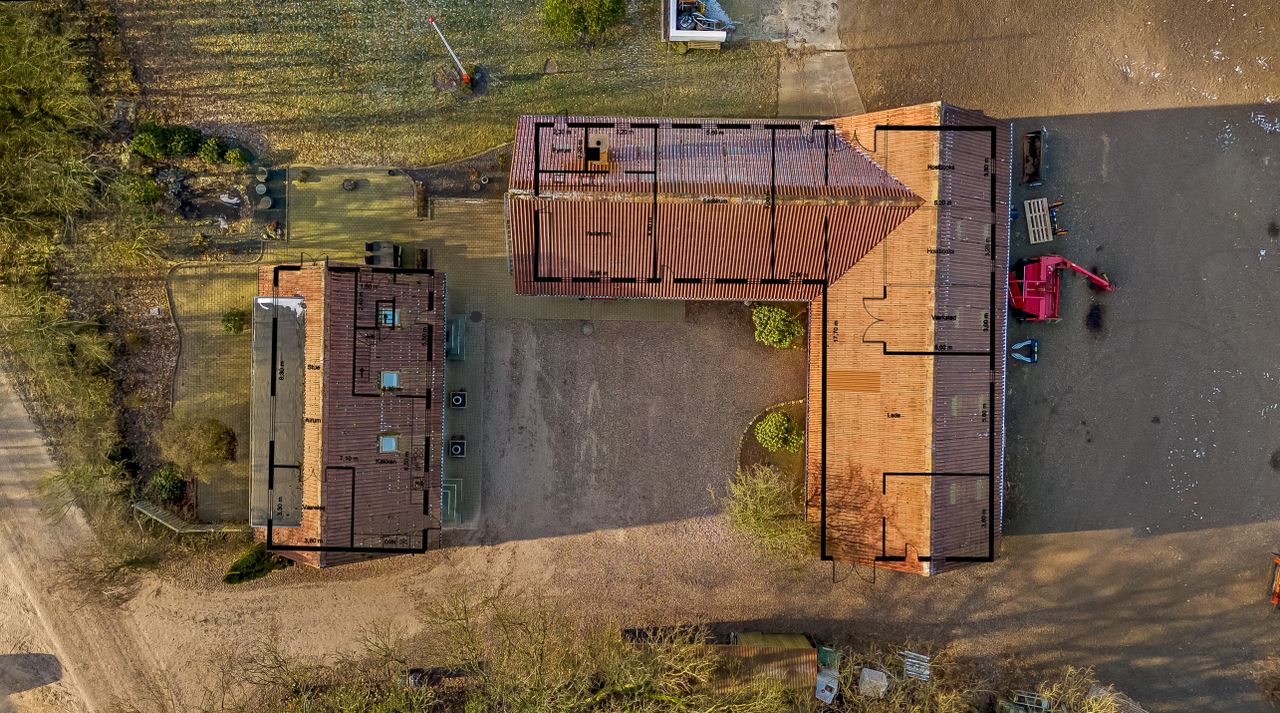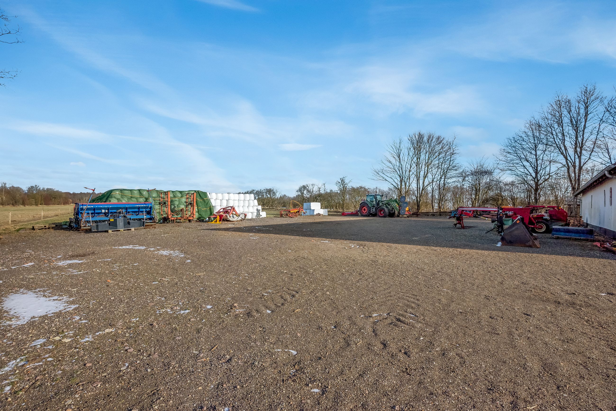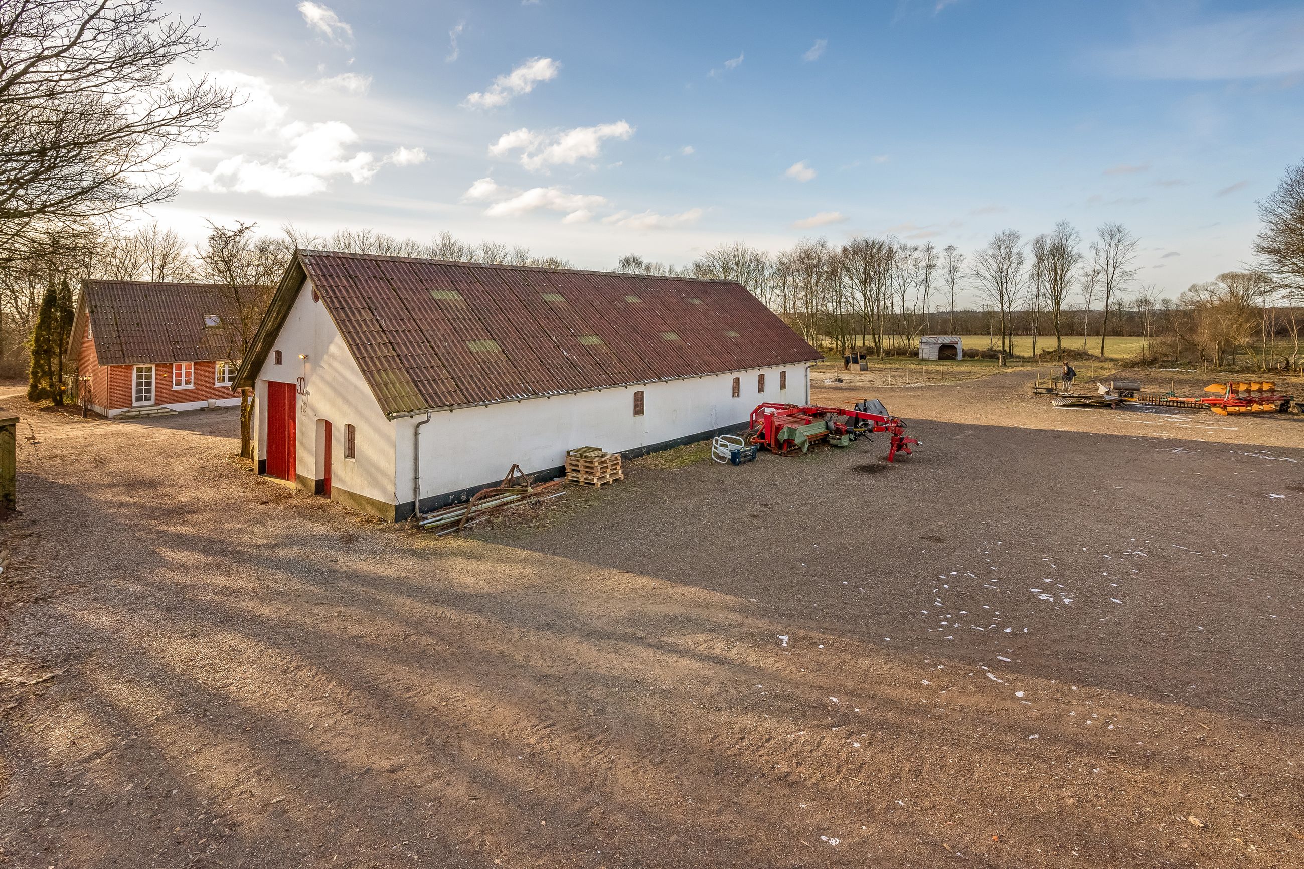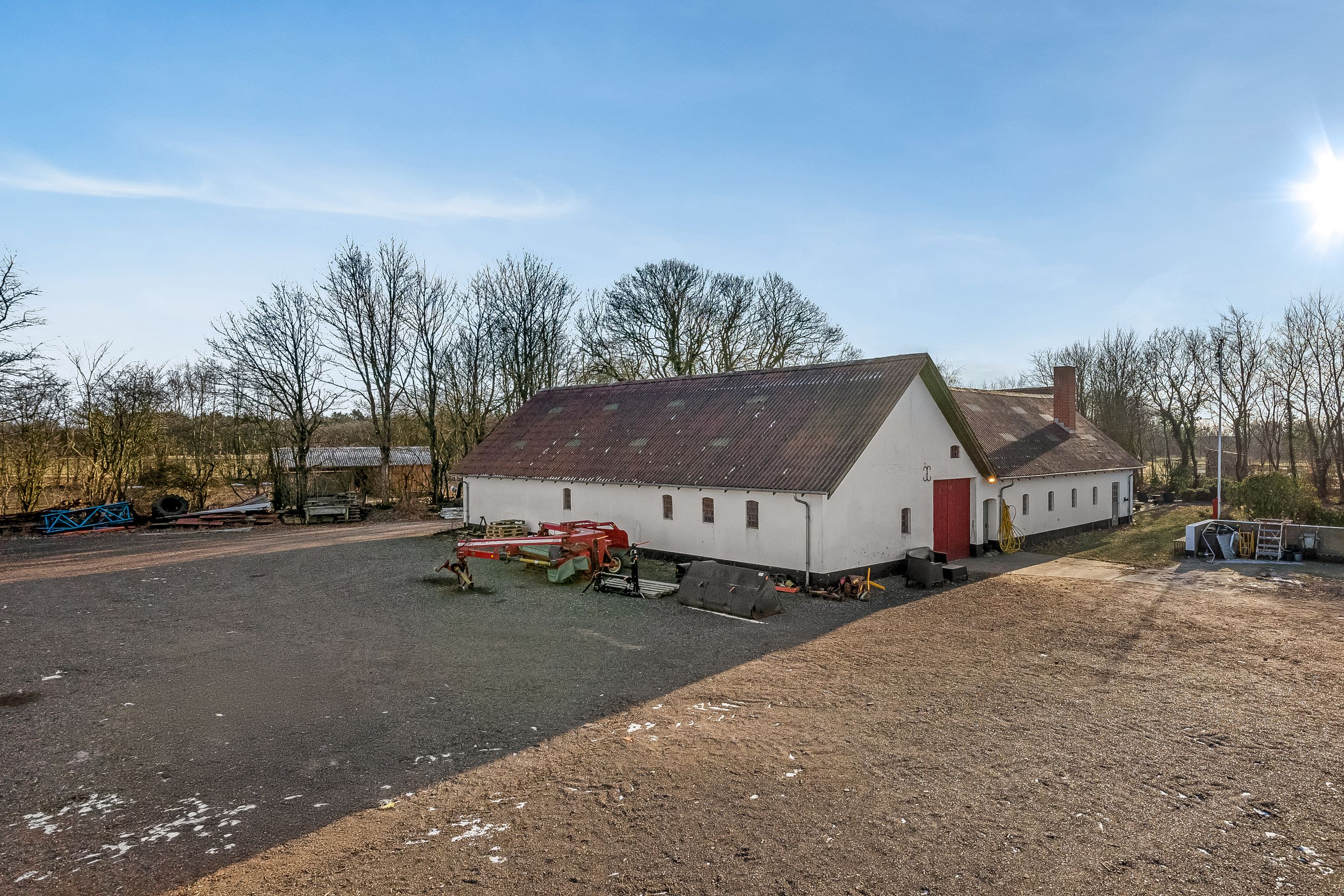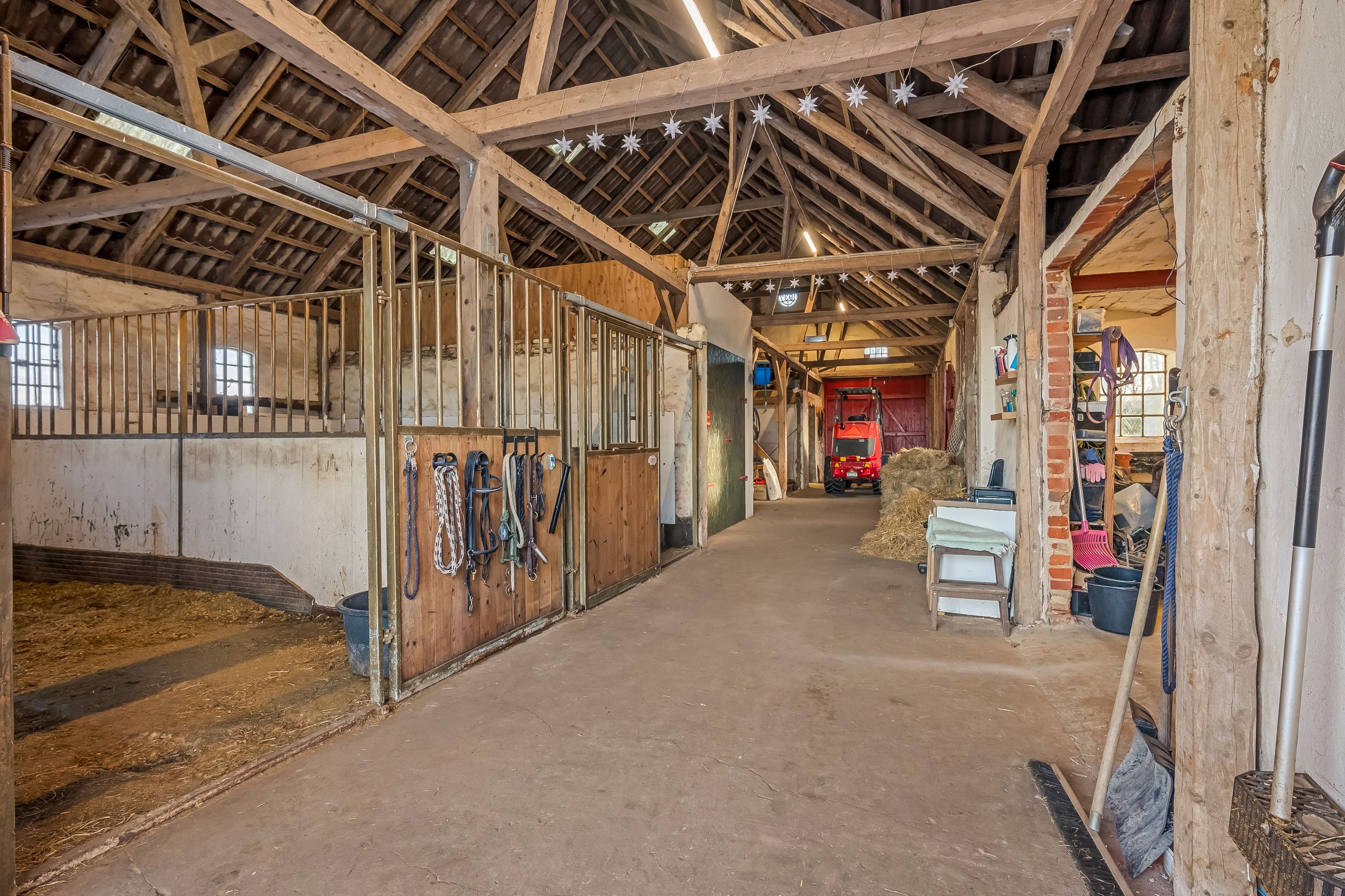 Til ejendommen hører flere funktionelle udbygninger, herunder lade, staldbygning samt en dobbelt carport med tilhørende cykelskur. Stalden er indrettet med blandt andet rummelige hestebokse i en størrelse, der egner sig til folingsbokse, samt et stort sadelrum, vaskerum og fyrrum. Bygningerne giver samlet set gode faciliteter til hestehold og øvrige hobbyaktiviteter.