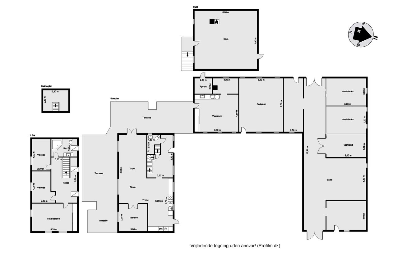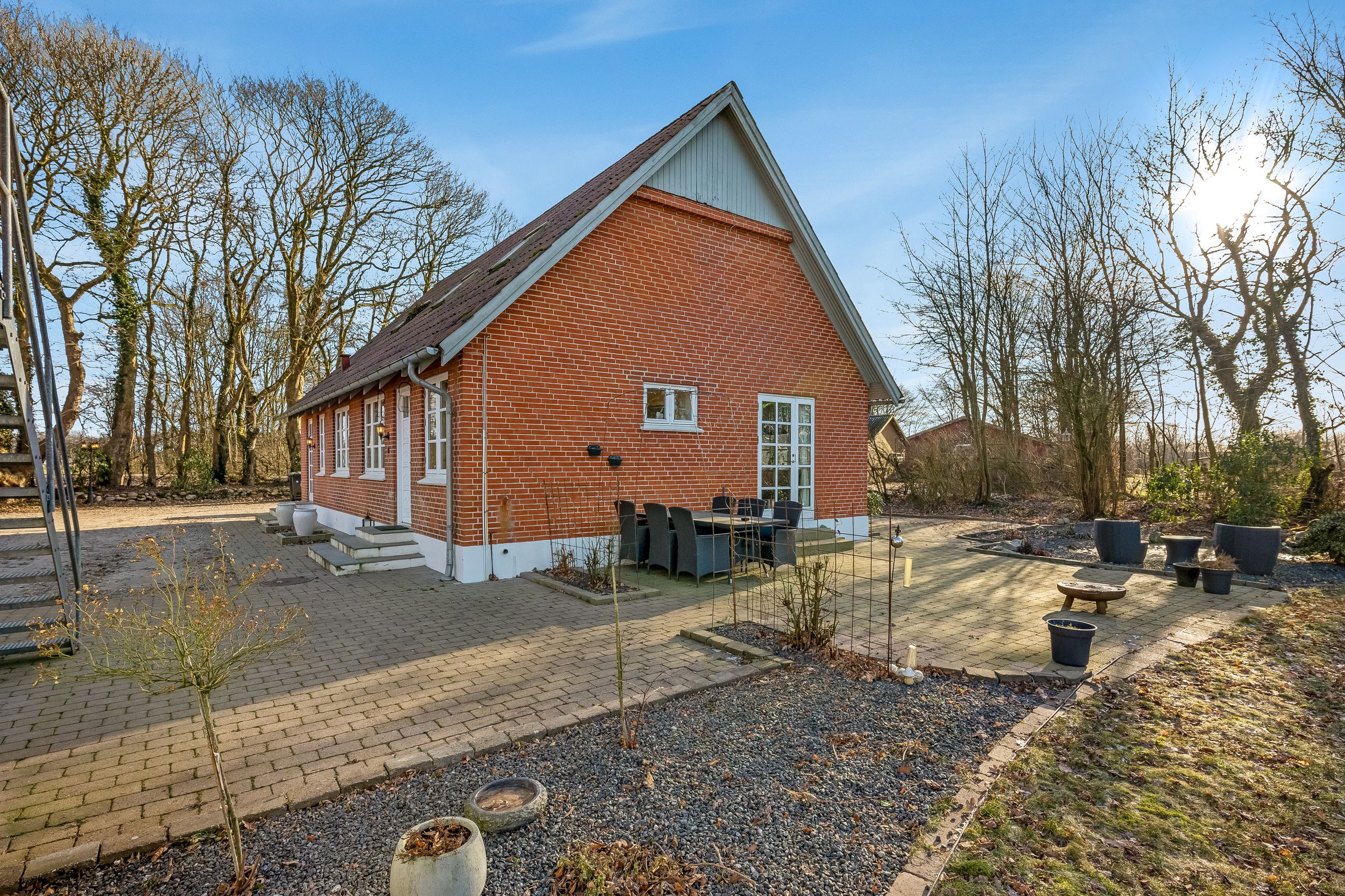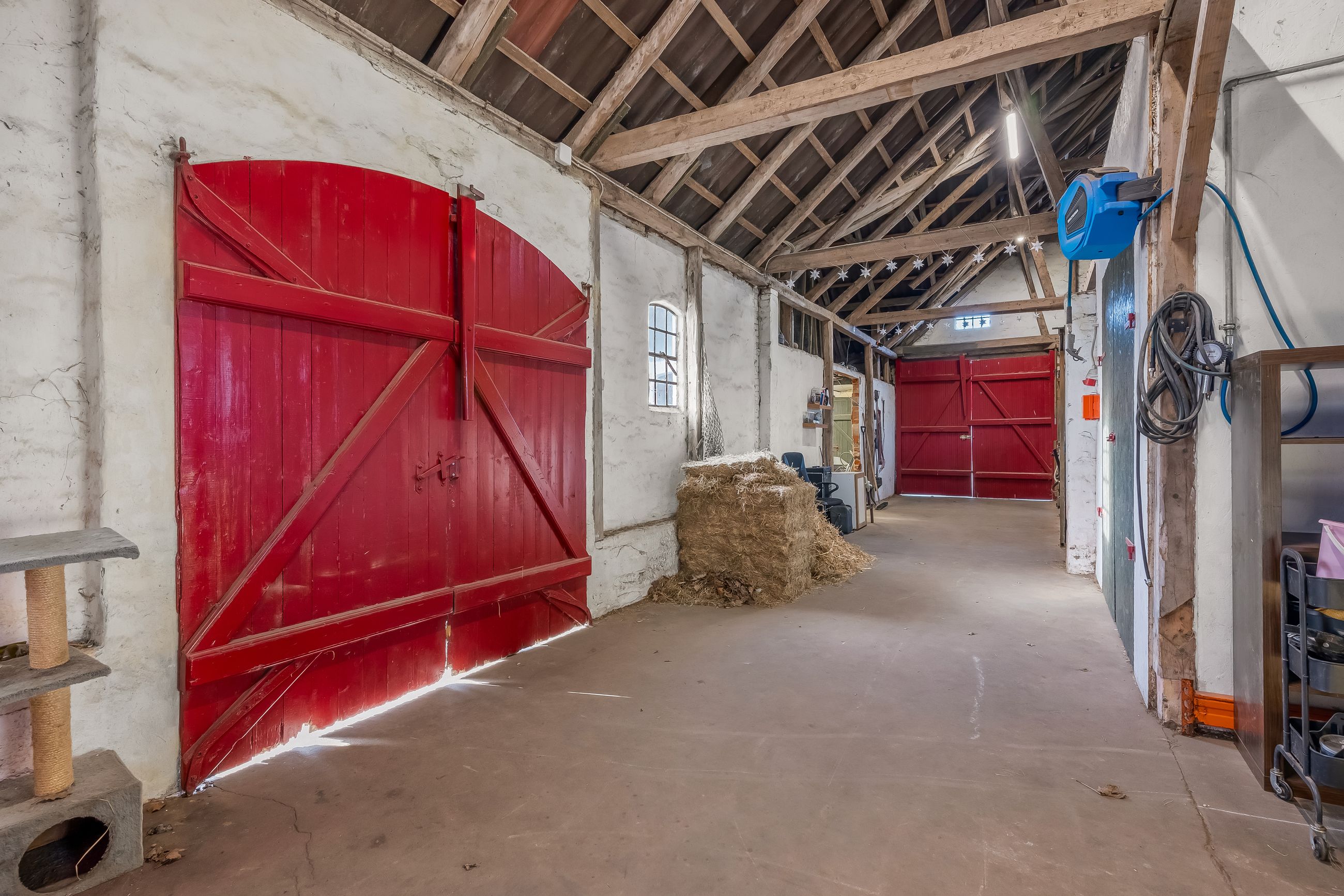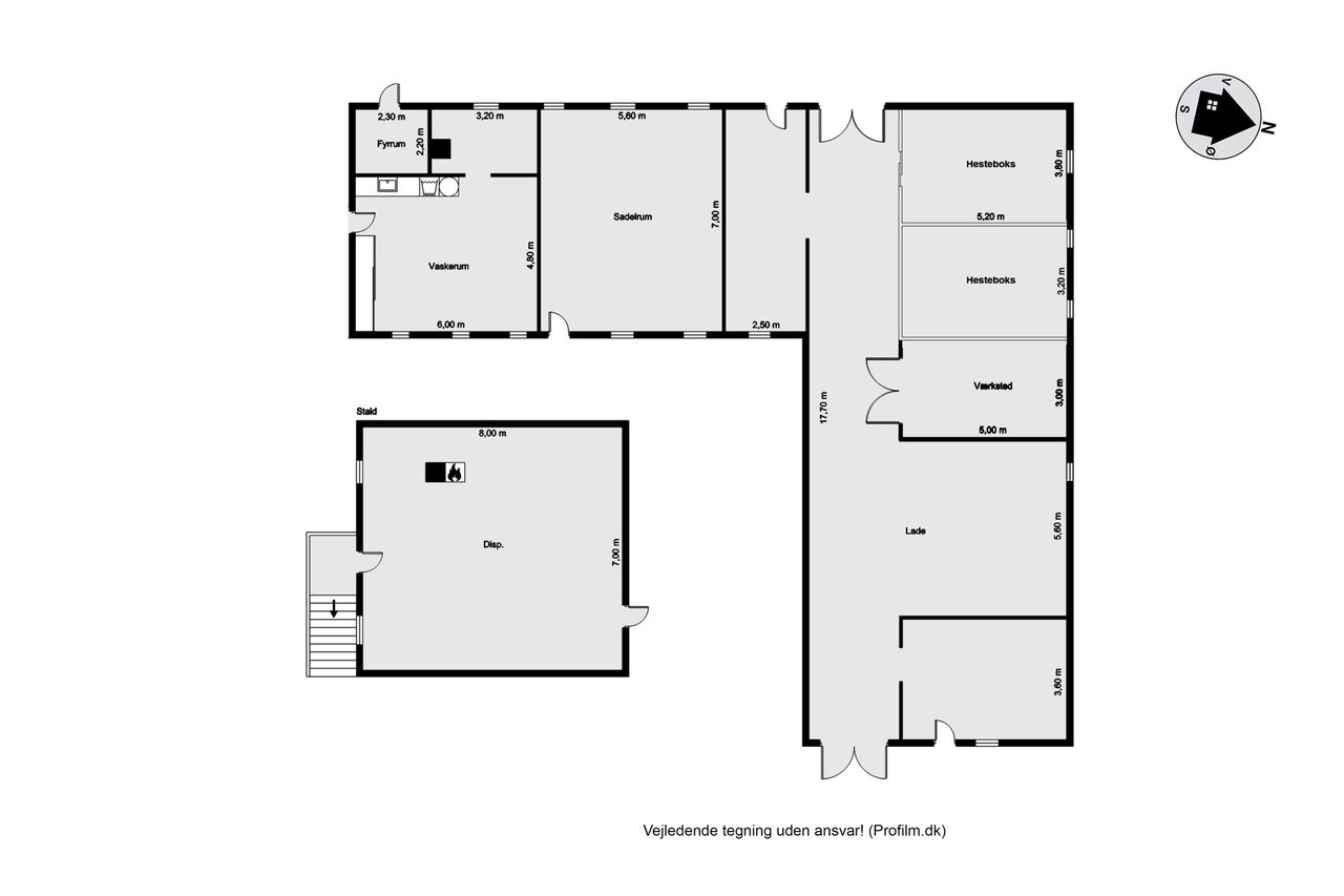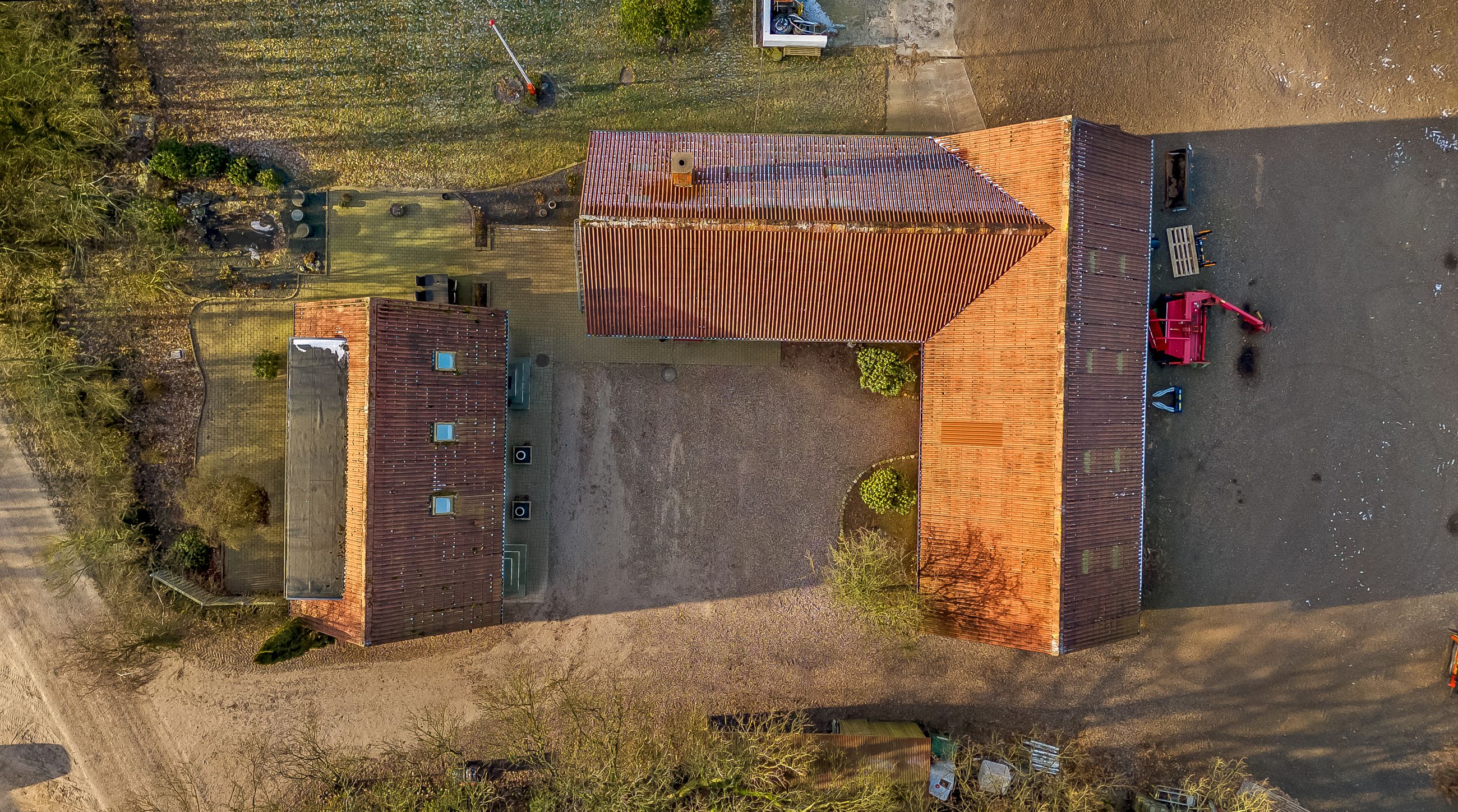Til ejendommen hører flere funktionelle udbygninger, herunder lade, staldbygning samt en dobbelt carport med tilhørende cykelskur. Stalden er indrettet med blandt andet rummelige hestebokse i en størrelse, der egner sig til folingsbokse, samt et stort sadelrum, vaskerum og fyrrum. Bygningerne giver samlet set gode faciliteter til hestehold og øvrige hobbyaktiviteter.
