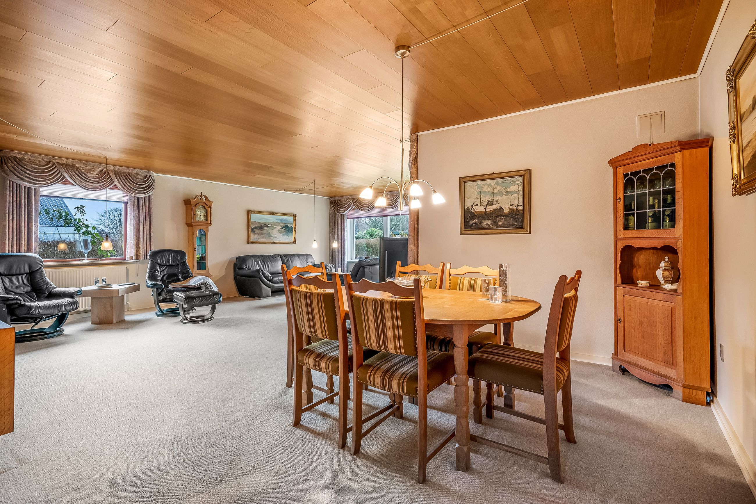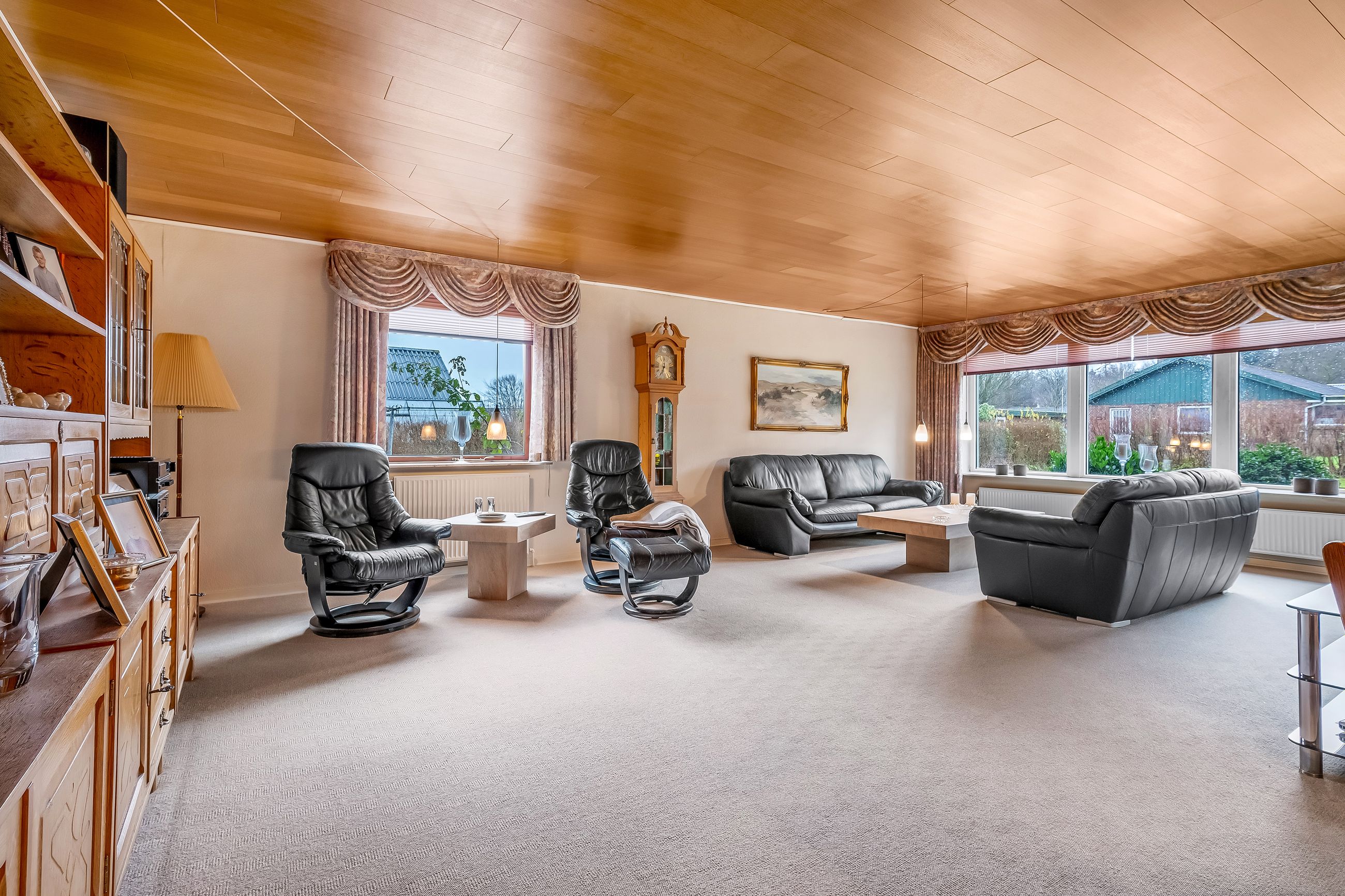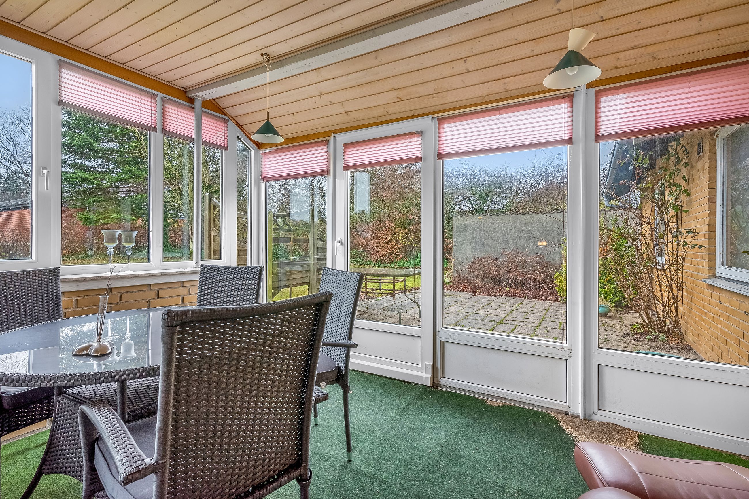 Villaen byder på 148 m2 bolig fordelt på en praktisk indretning. Her findes bryggers med vaskefaciliteter, separat entré og et lyst spisekøkken. En fordelingsgang giver adgang til toilet, badeværelse og tre værelser. Endvidere ligger en stor vinkelstue med gode møbleringsmuligheder og udgang til udestuen, hvorfra der er adgang til terrassen og haven.
