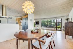 Indenfor byder stueplan på en rummelig entré, der giver adgang til to værelser samt et badeværelse med brus. Boligens opholdsrum er køkken-alrum og stue i åben forbindelse – et lyst og indbydende areal med god plads til både spisebord og sofagruppe. Herfra er der udgang til en flisebelagt terrasse og haven.