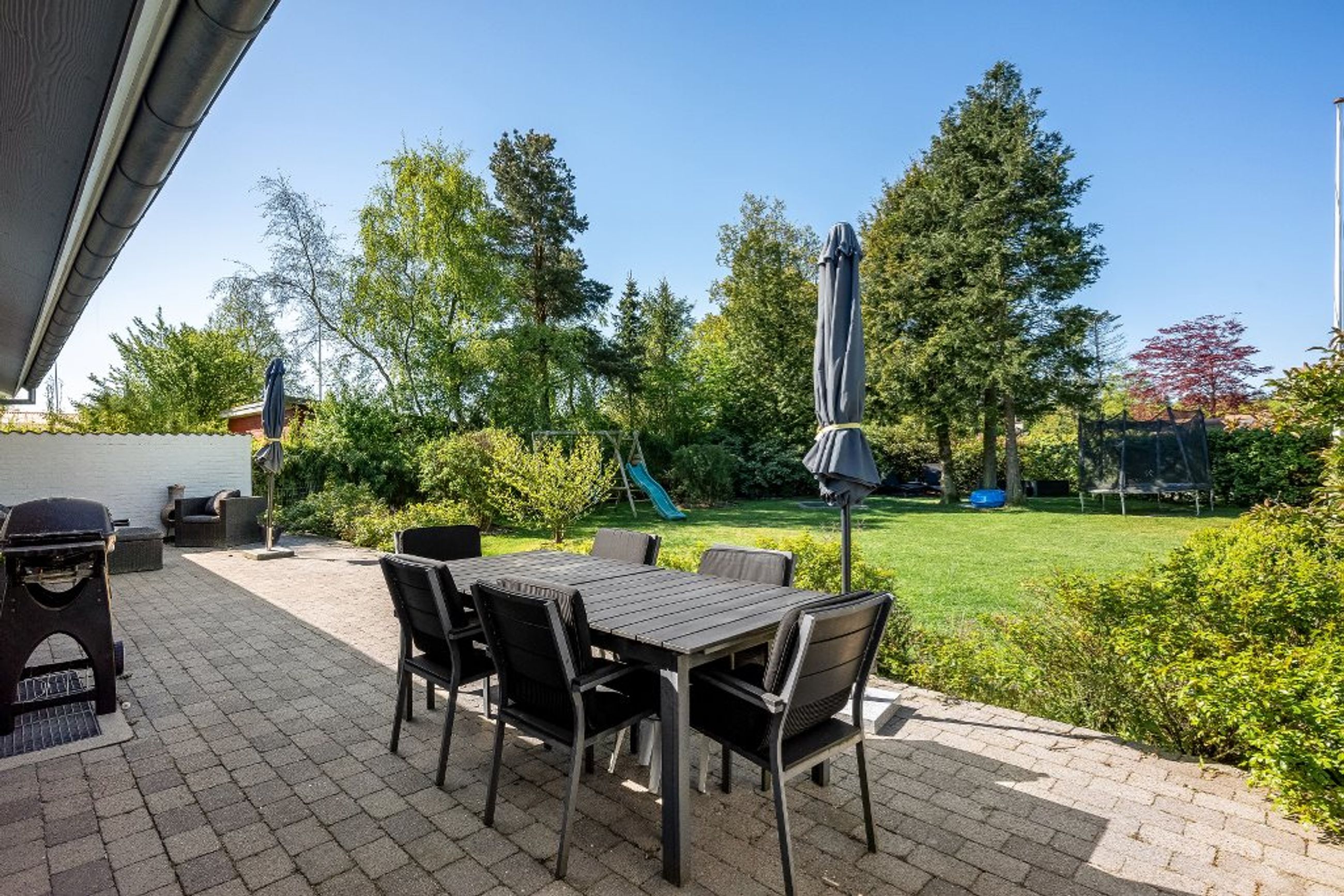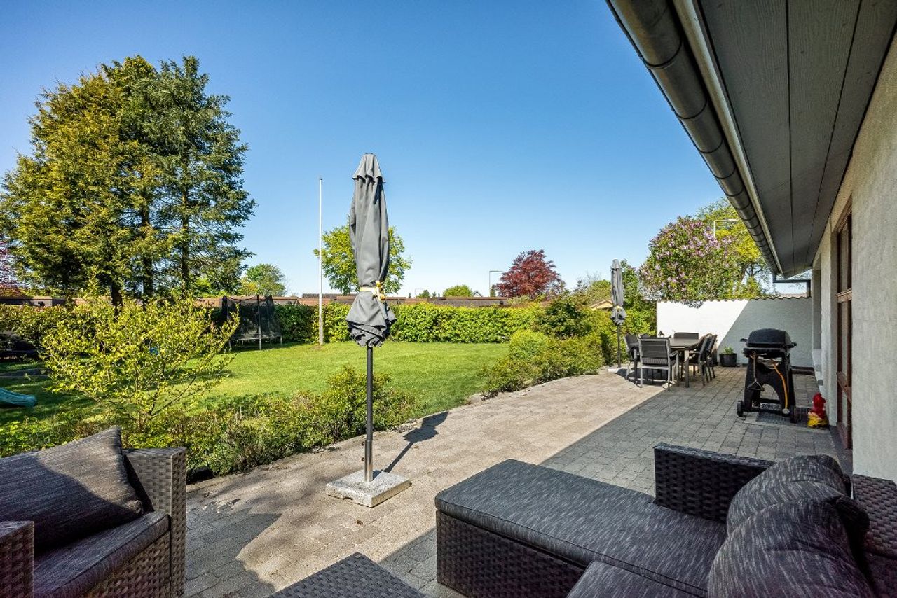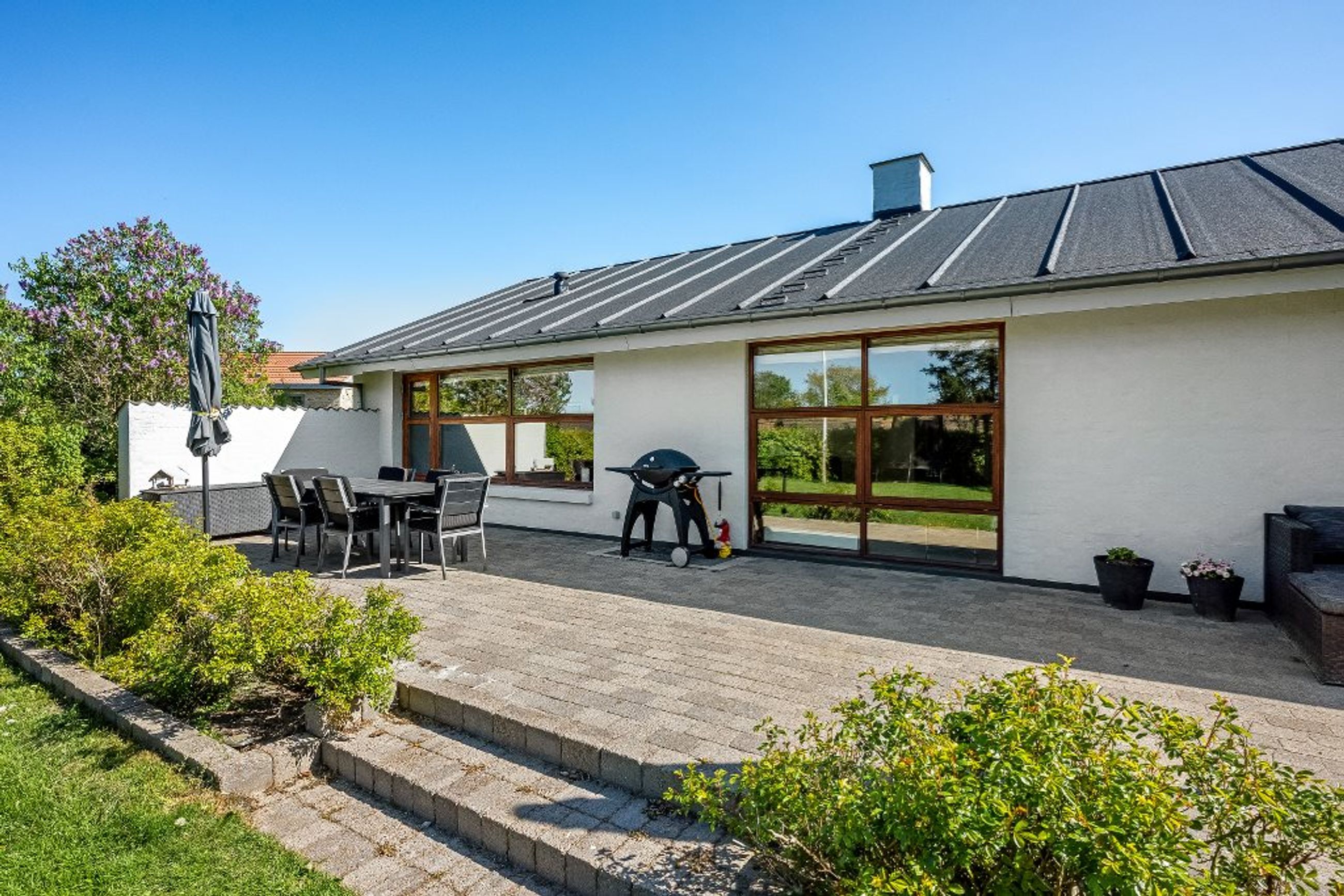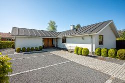 Villaen præsenterer sig med en flot forhave og en indkørsel til dobbelt carport med tilhørende stort værksted/hobbyrum.