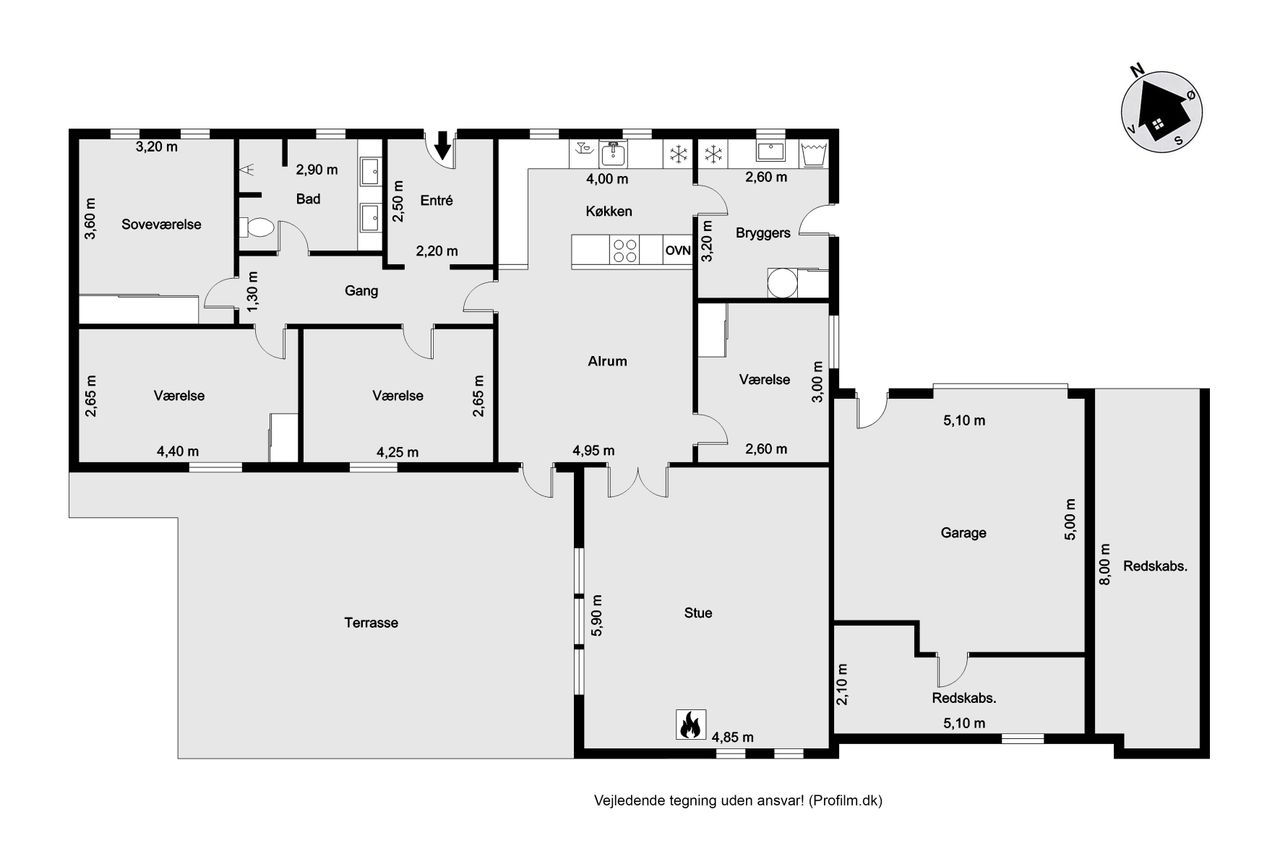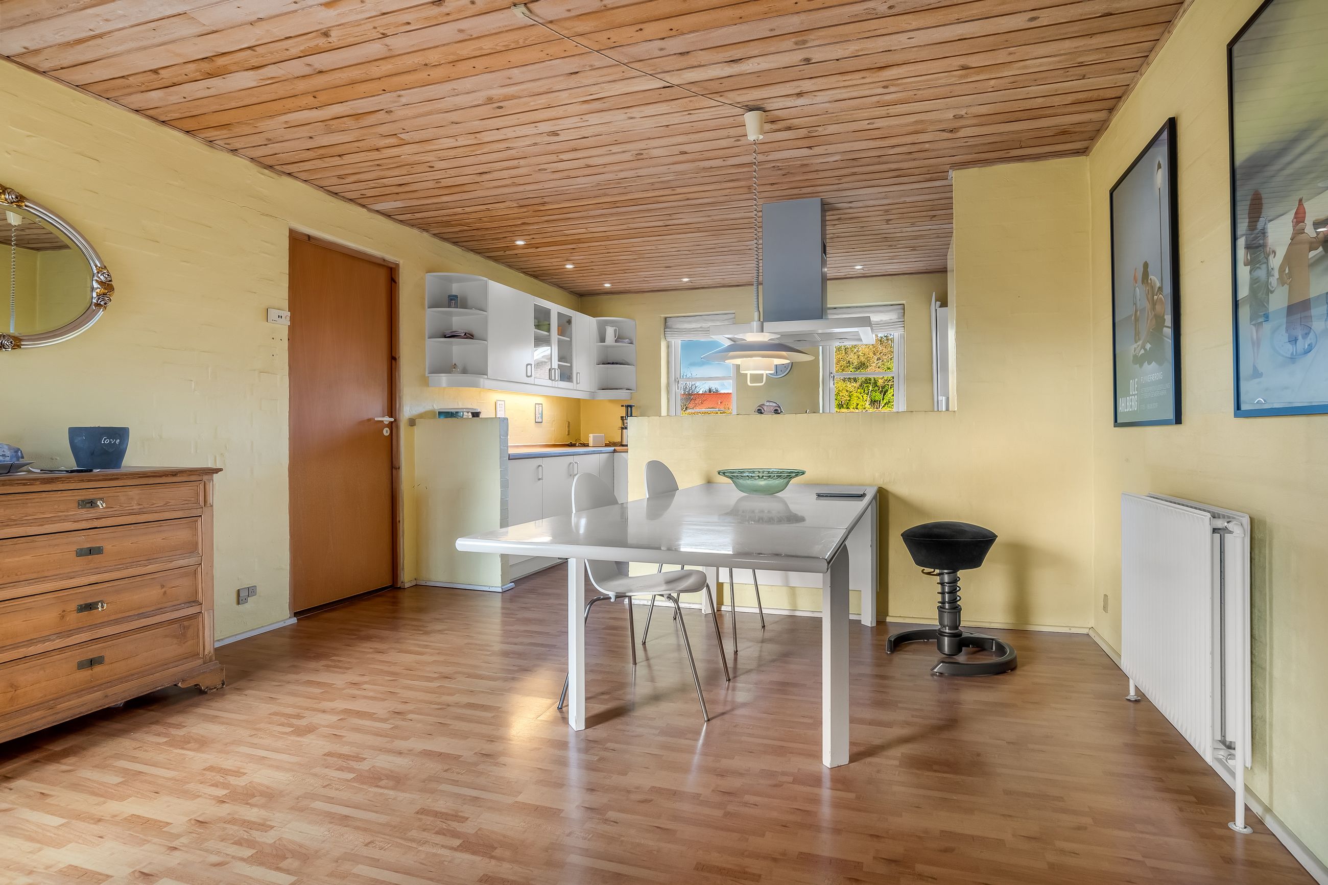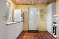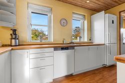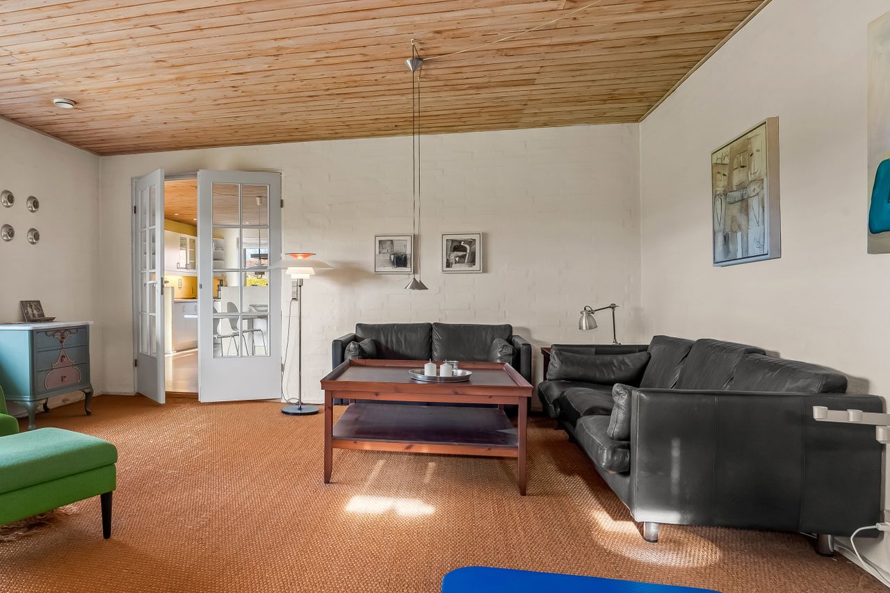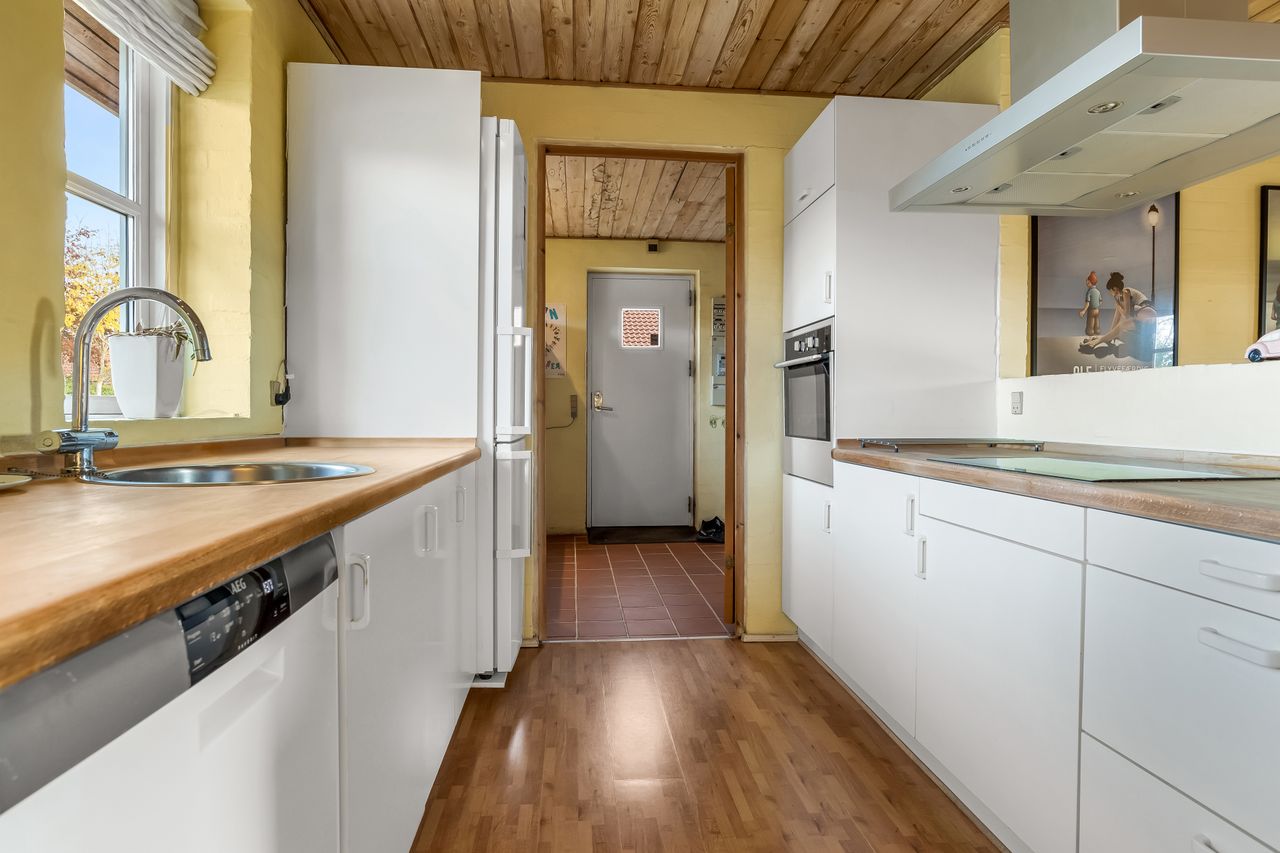 Boligen er indrettet med et praktisk bryggers med vaskefaciliteter, et funktionelt køkken og et alrum med plads til spisebord. Fra alrummet er der dobbeltdør ind til stuen, som byder på et dejligt lysindfald og en hyggelig brændeovn.