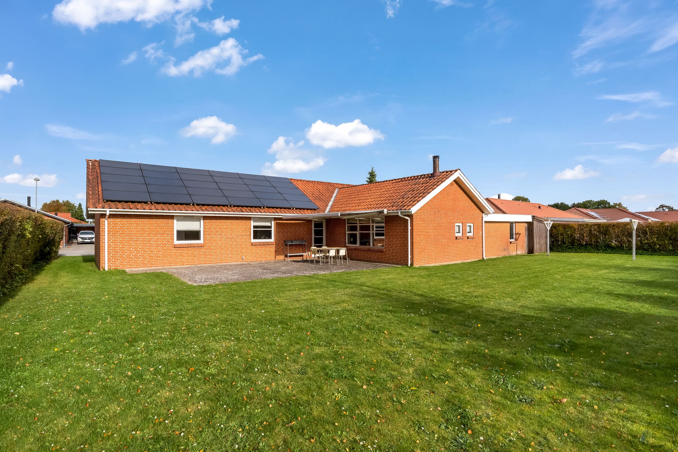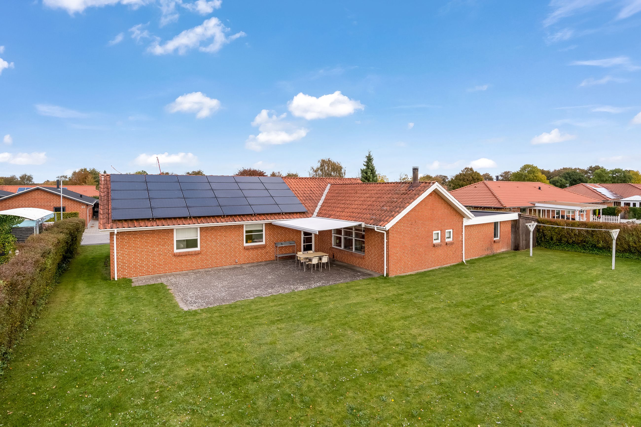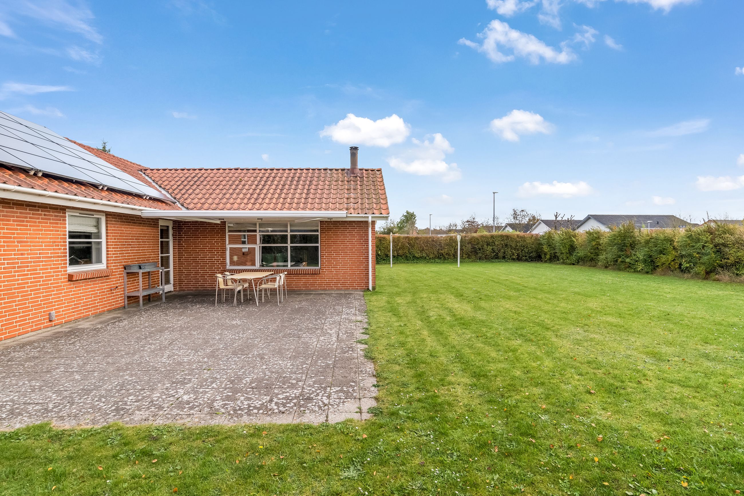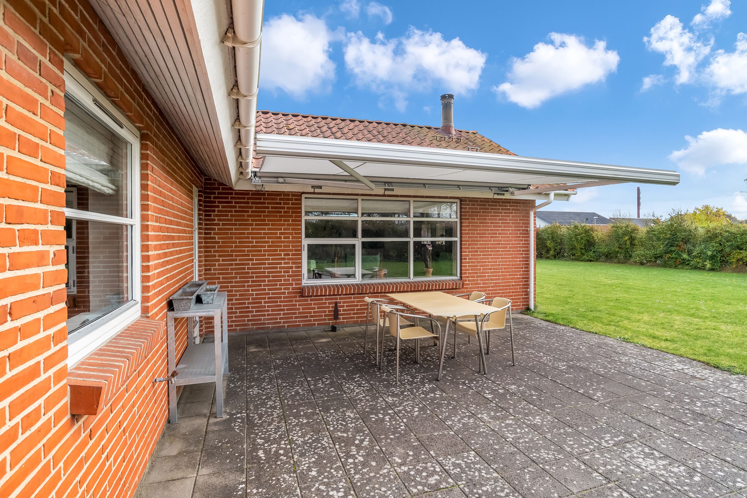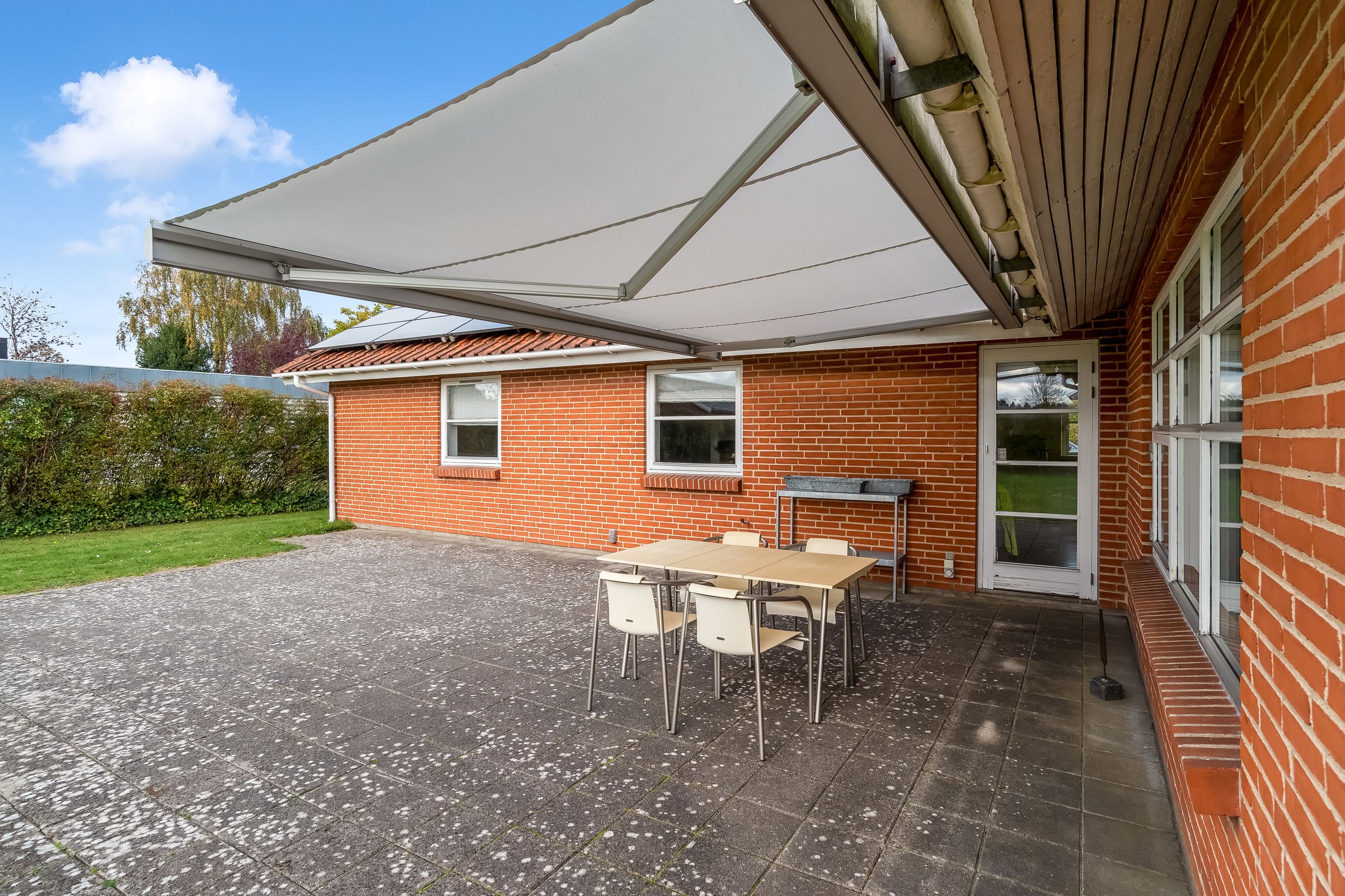 Fra alrummet er der desuden udgang til en sydvestvendt terrasse med markise, hvor sommerdagene kan nydes i private omgivelser. Haven er anlagt primært med græs og kræver minimal vedligeholdelse, men der er samtidig gode muligheder for at skabe sin egen grønne oase.