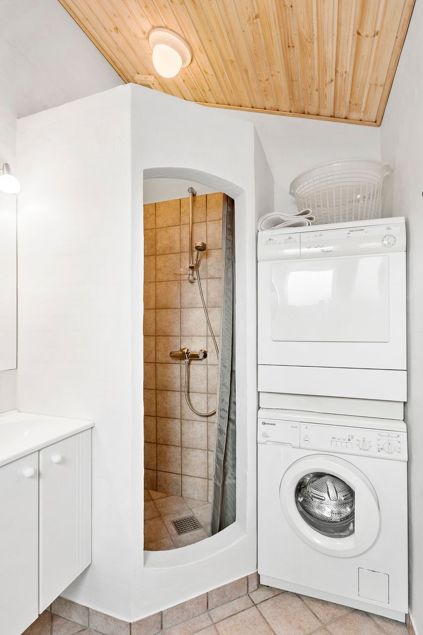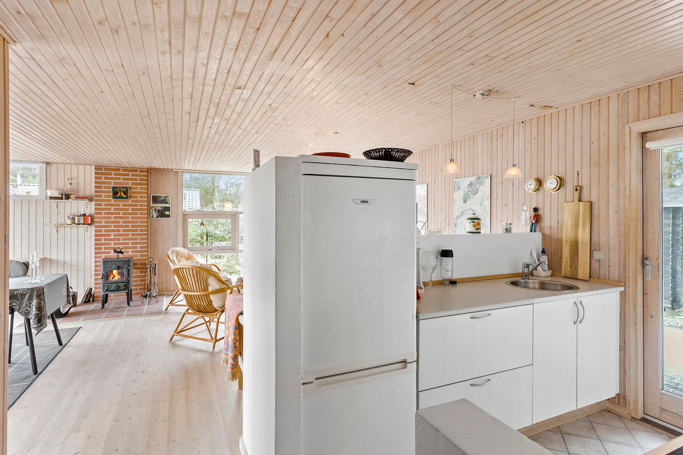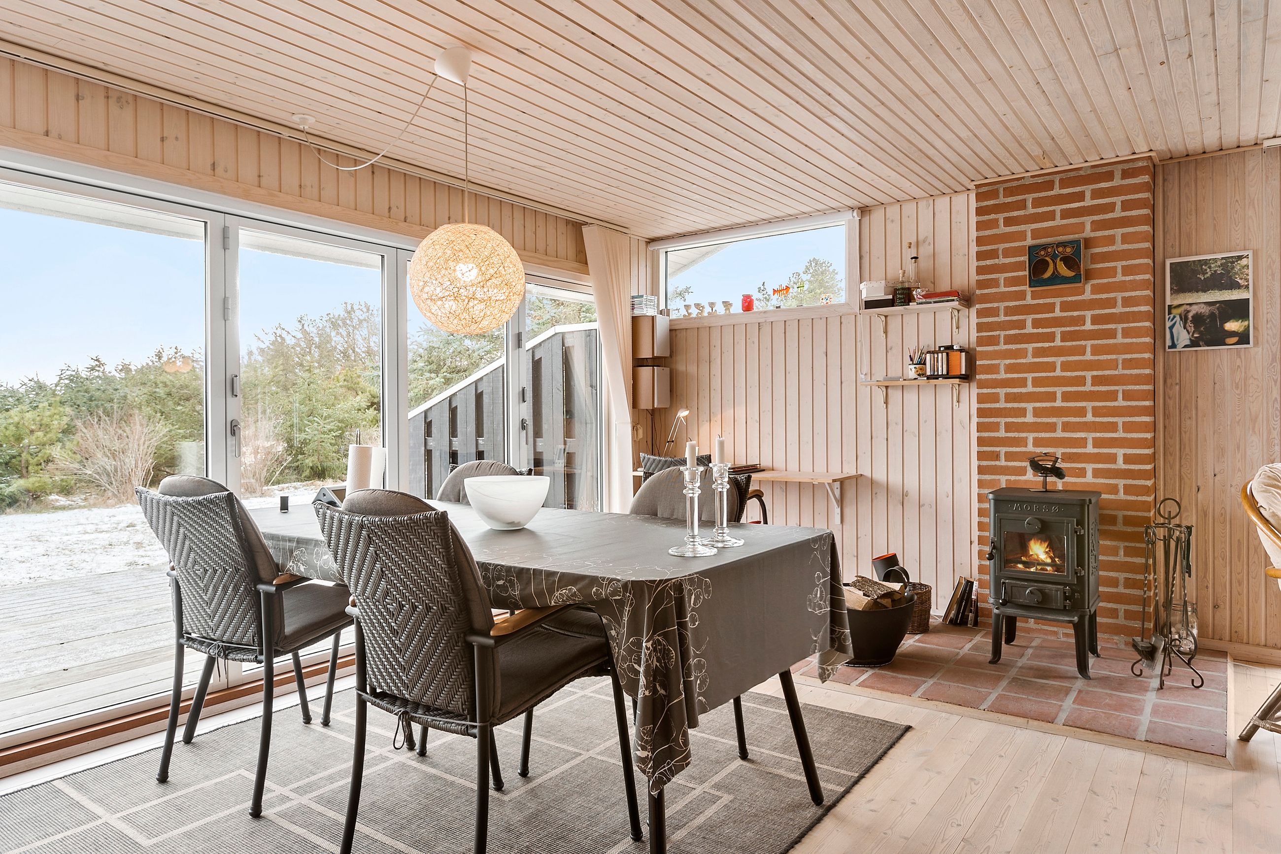 Køkkenalrummet er lyst og moderne med sort køkken og en naturlig overgang til de omkringliggende terrassearealer, der smyger sig om huset og indbyder til hygge og samvær. Her kan man nyde sommeraftenerne i fulde drag og virkelig opleve det, huset og naturen har at byde på.