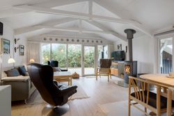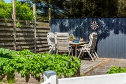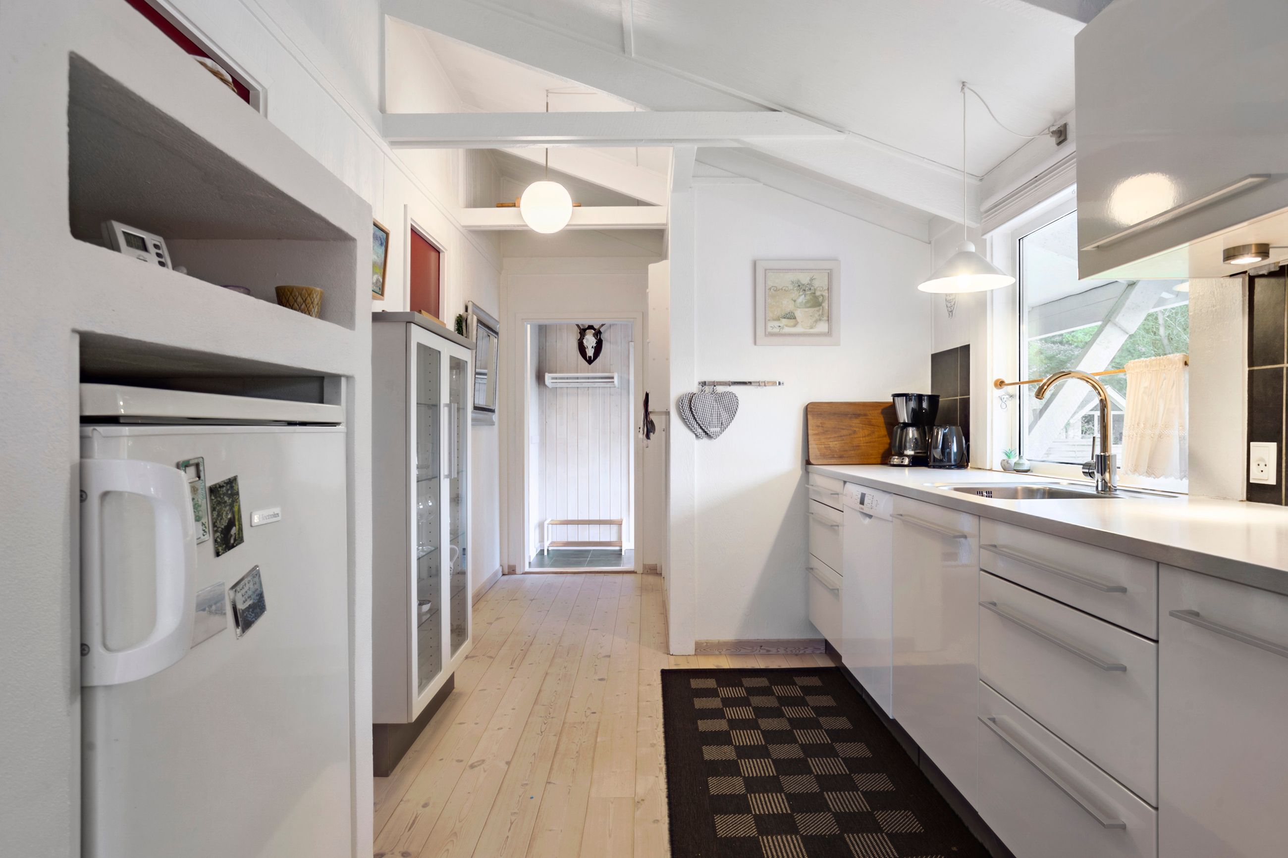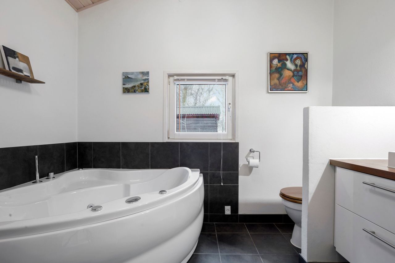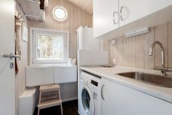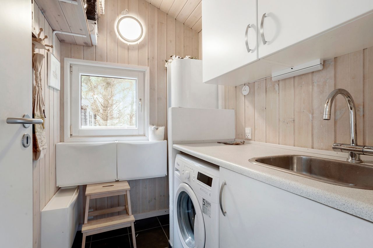 Derudover rummer huset et praktisk bryggers med vaskemaskine og håndvask samt et tilhørende skur til opbevaring af alt det, der hører sommerhuslivet til. Grunden er dejligt ugenert, så du kan nyde ferien i fred og ro.