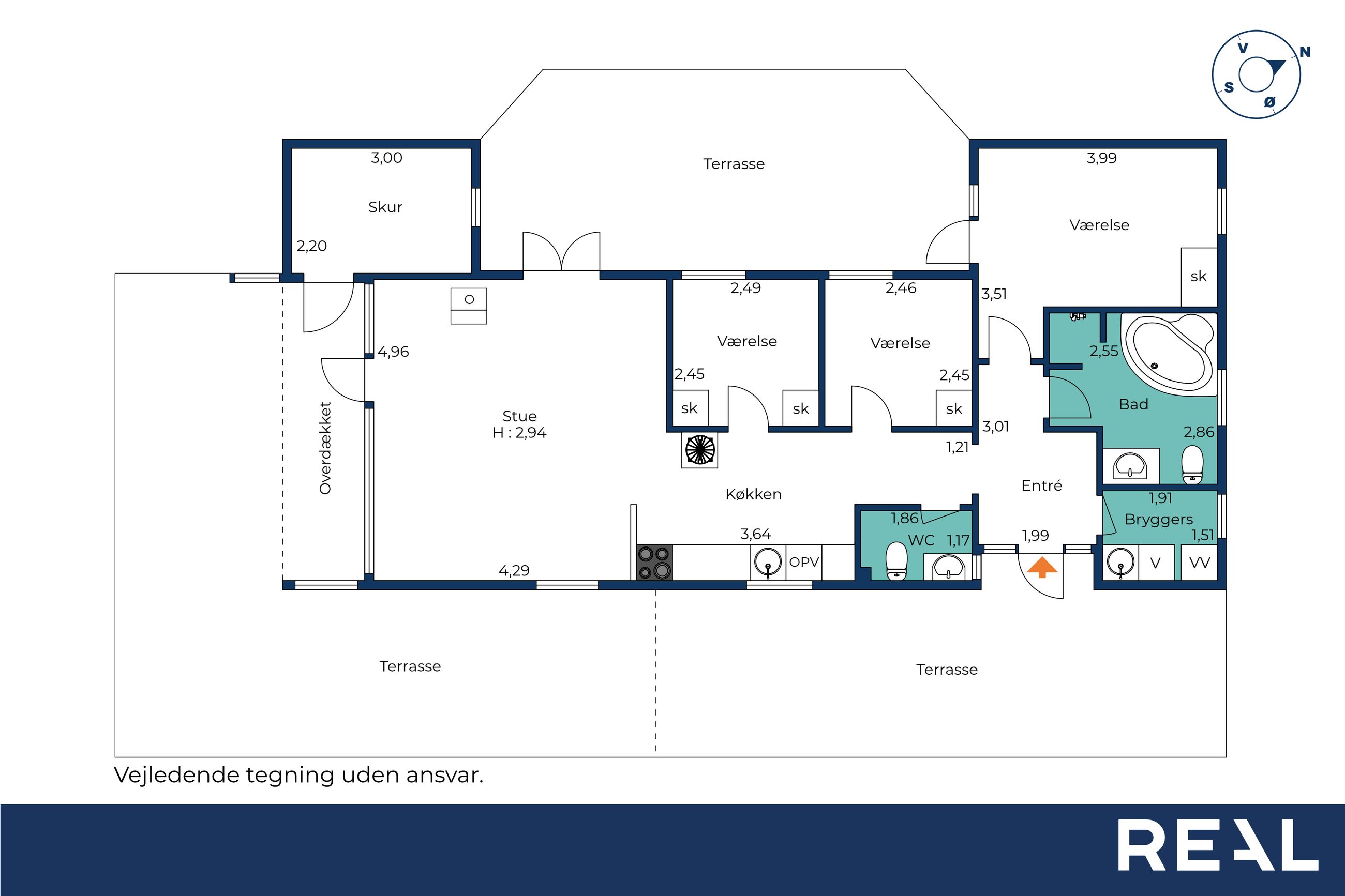 Indretningen byder på tre rummelige værelser, et dejligt badeværelse med spa samt et ekstra gæstetoilet. Hjertet i huset er det store, lyse køkken-alrum, hvor der er god plads til fælles måltider og hyggelige stunder. Herfra er der direkte udgang til de fantastiske terrassearealer, som smyger sig omkring huset og indbyder til udeliv dagen lang.